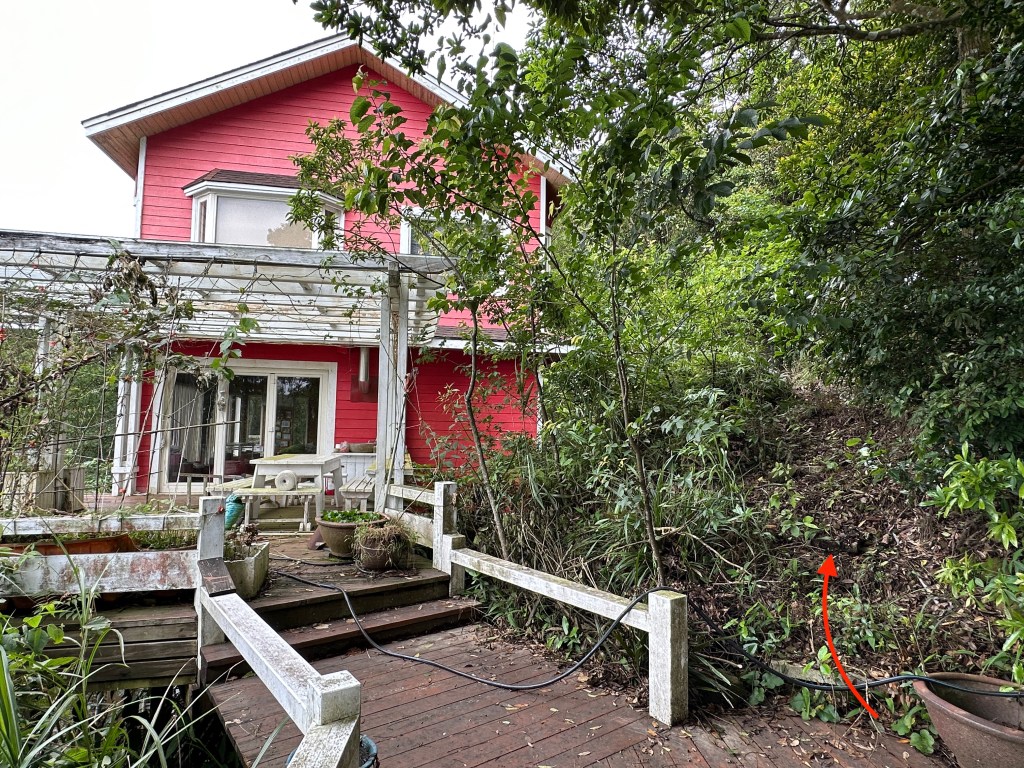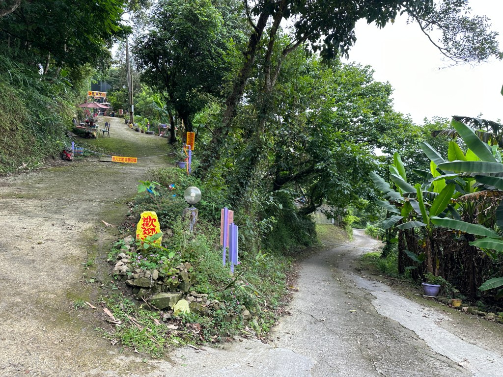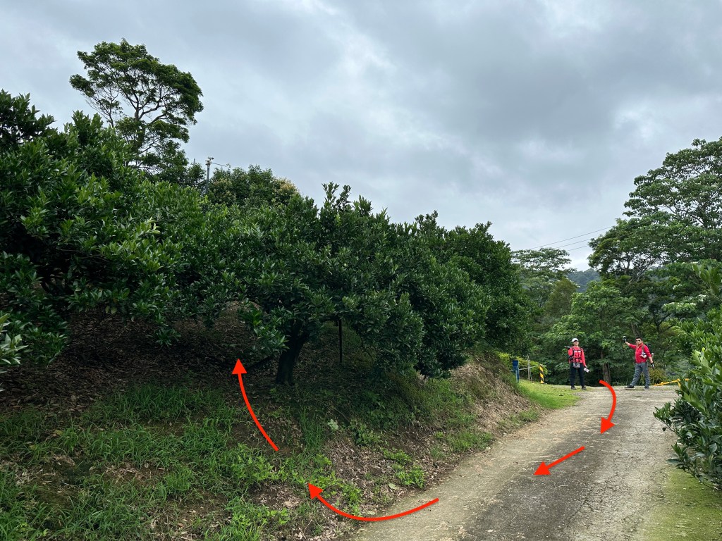 接著,由產業道路往「星月天空」方向走,沿路都有「星月天空」的方向指示牌,到了四崙頂山岔後,由左岔進入走350m的產業道路,可看到一個由鐵網圍住且關閉的小木屋民宅,憑肉眼看最高處似乎是在民宅內?那是否表示三角點也在鐵網內?這鐵網外的斜坡上是一片橘子園。