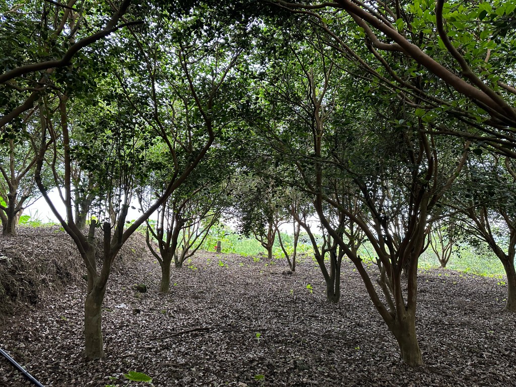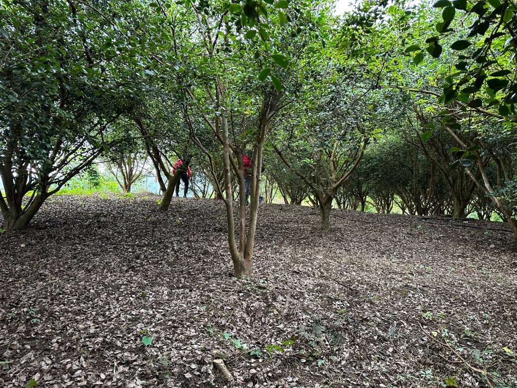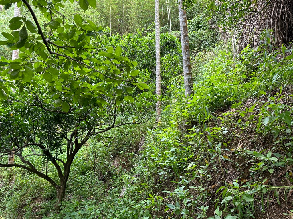 離開綠世界,往中湖山走,要2.4K且要陡上,沿著產業道路走,左側是垂直的岩壁地形,還可以看到岩壁高處的大樹其根部裸露於岩壁外!抵達中湖山,看到一大片的苦茶樹,看不到三角點的位置,只能對著離線地圖找三角點,在苦茶樹園中,花了2分鐘左右才找到不是在最高處的三角點。拍照後離開,已經是下午5點12分。