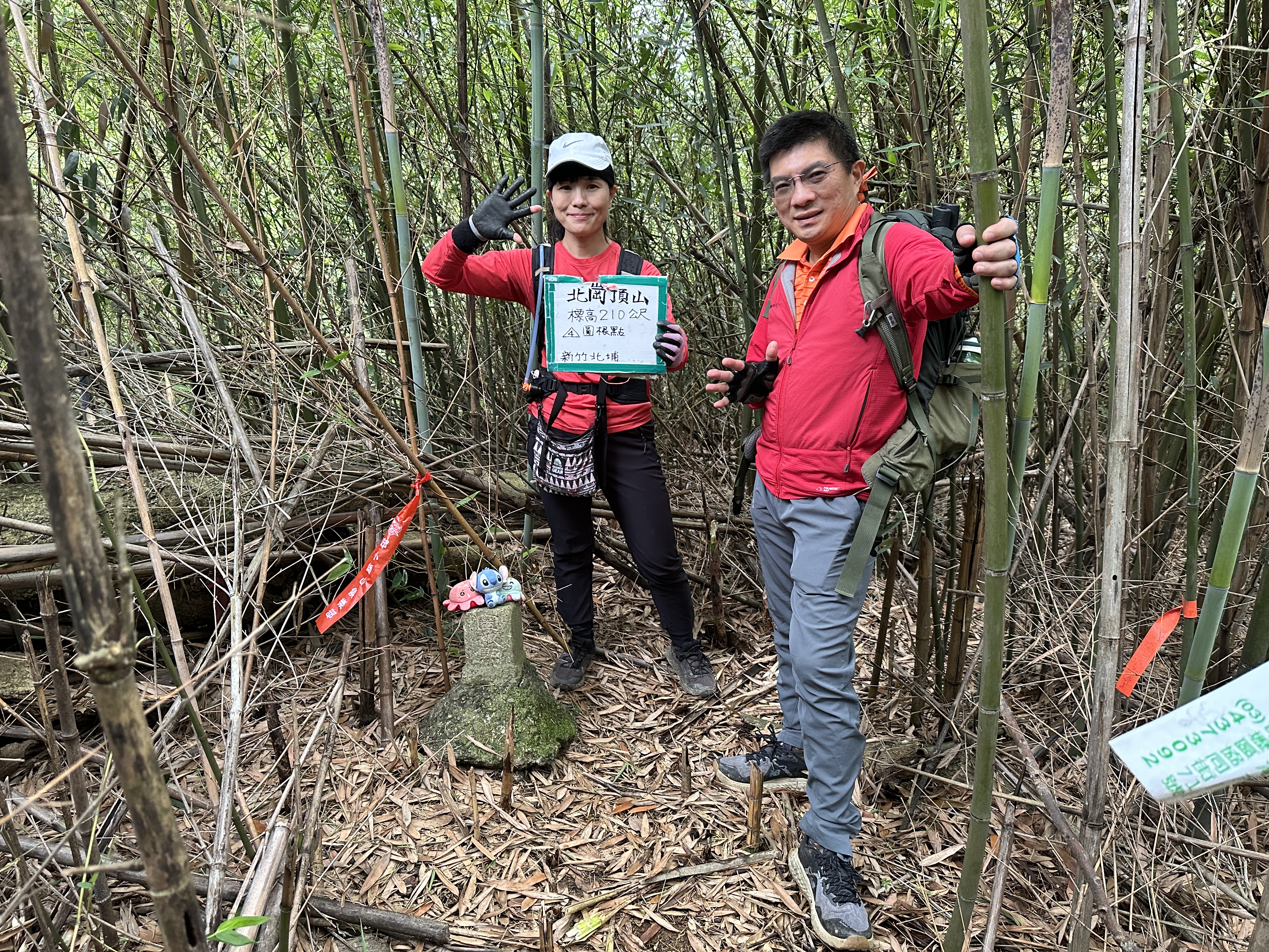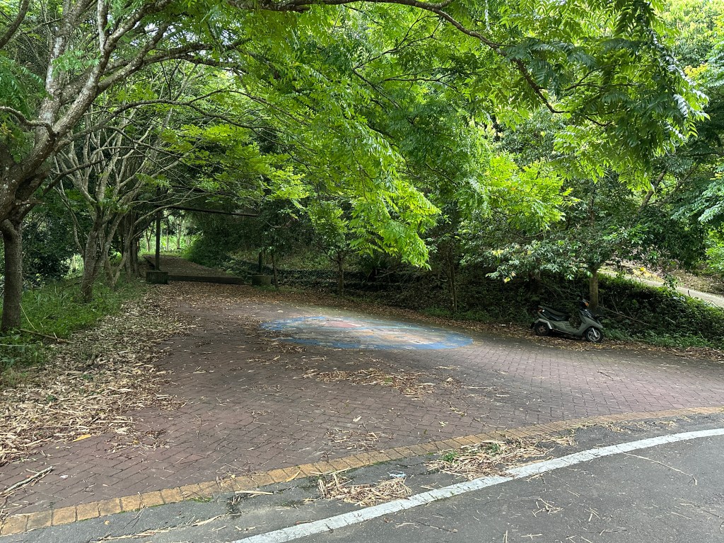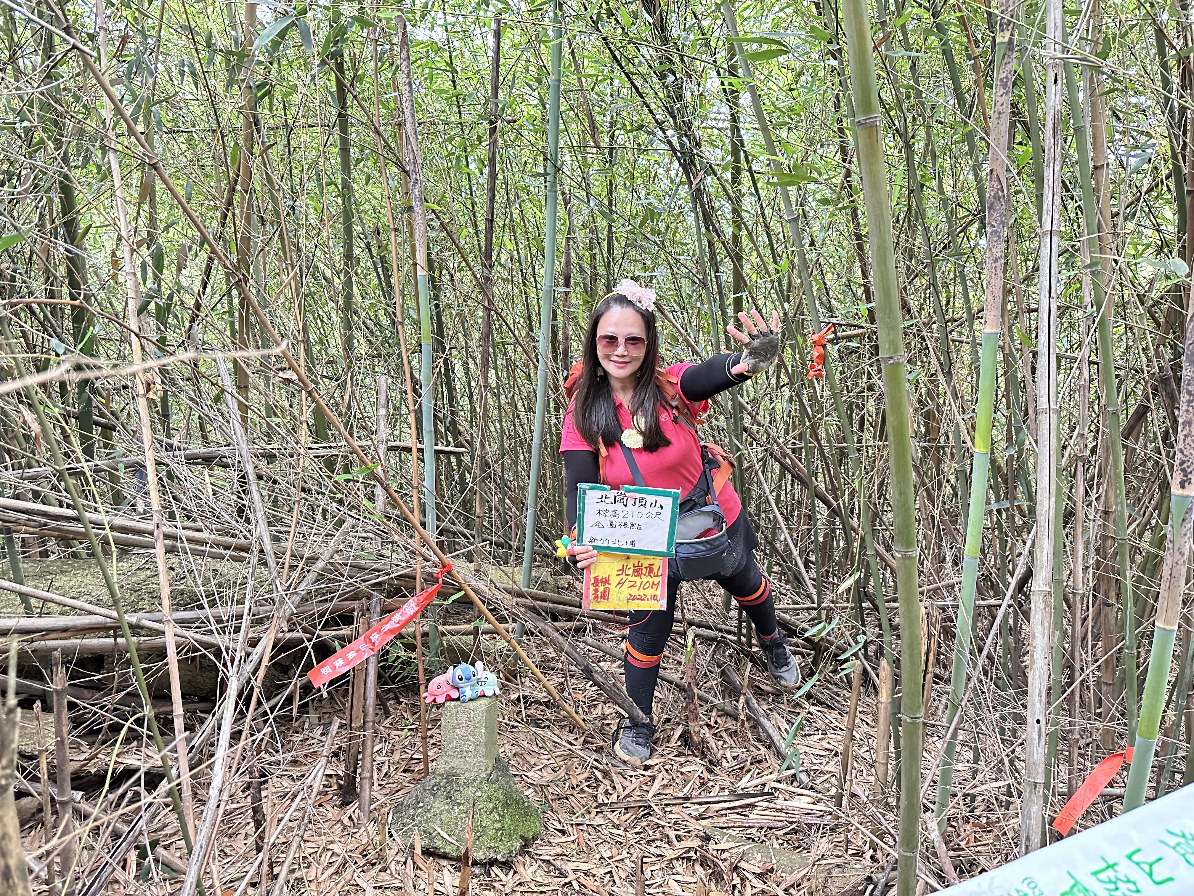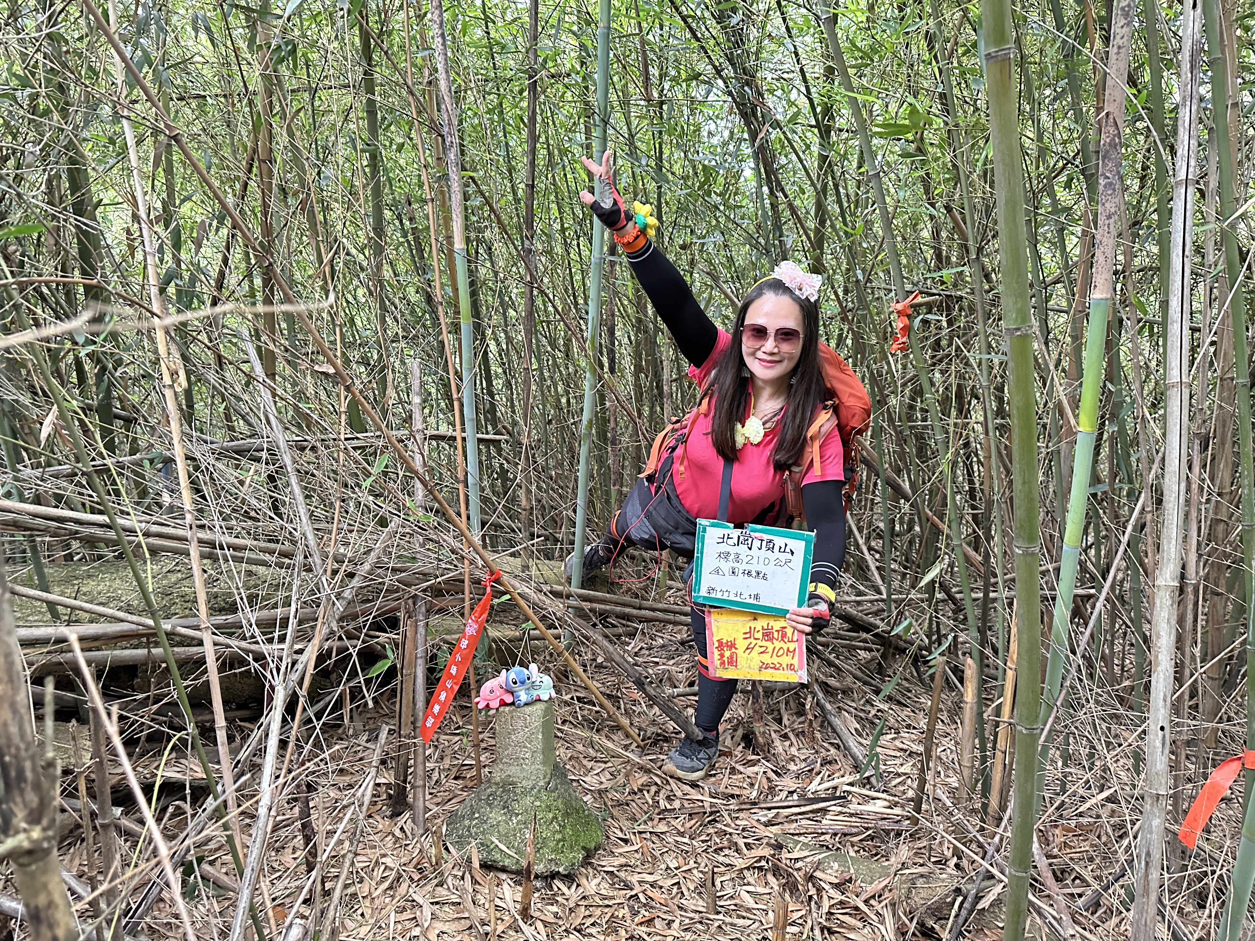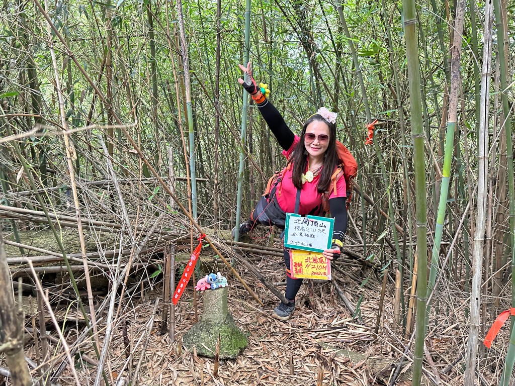 開始往北埔方向走,要2.3K的距離,進入北埔市區邊緣後,先借用一下鄧南光攝影管的洗手間,就直接進入秀巒公園,由秀巒公園與北埔綠世界之間的產業道路,有可通往北岡頂山的登山口,由此陡上,距離100m,算得上好走,三角點也是在竹林內,下來後接上產業道路,開始往綠世界走,抵達時已經是下午4點15分,但進入綠世界門票要380元?售票小姐也不清楚他們的園區內有四坪寮山?算了,放棄!