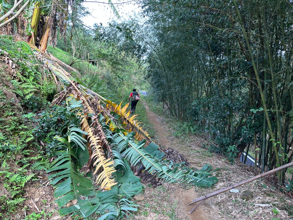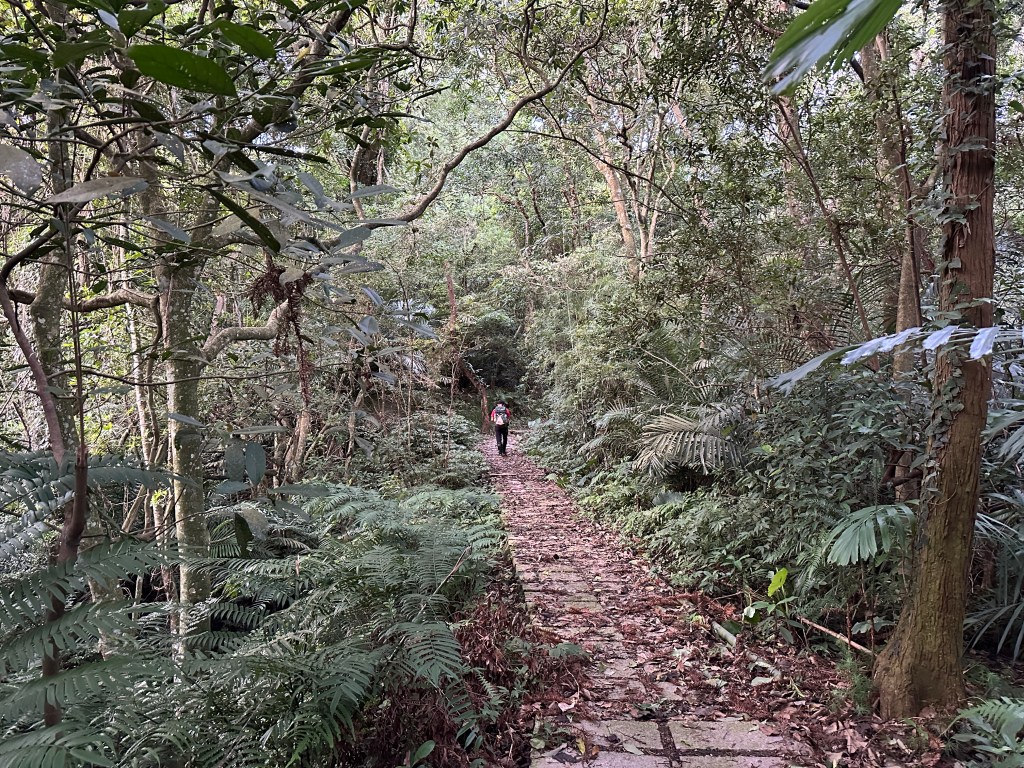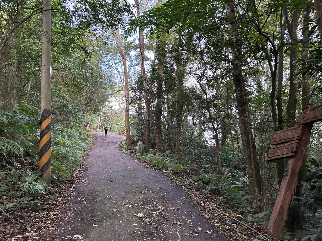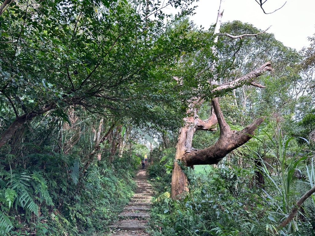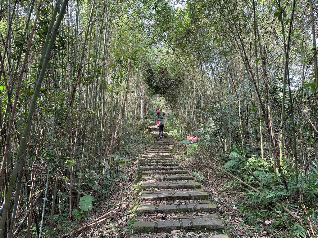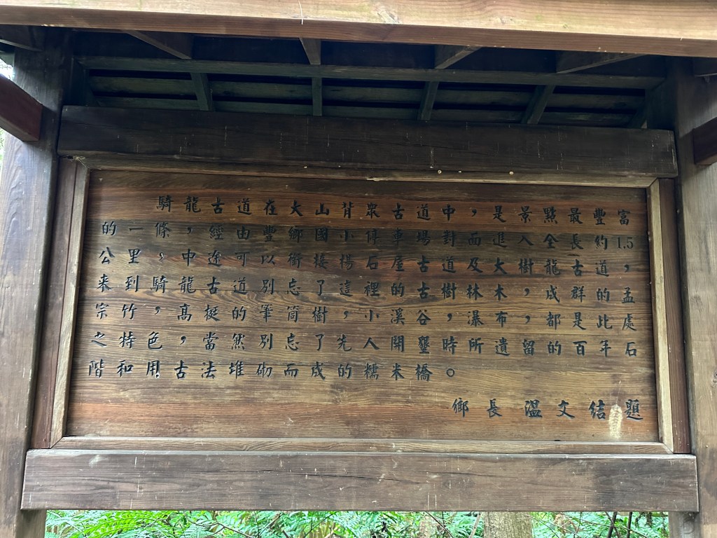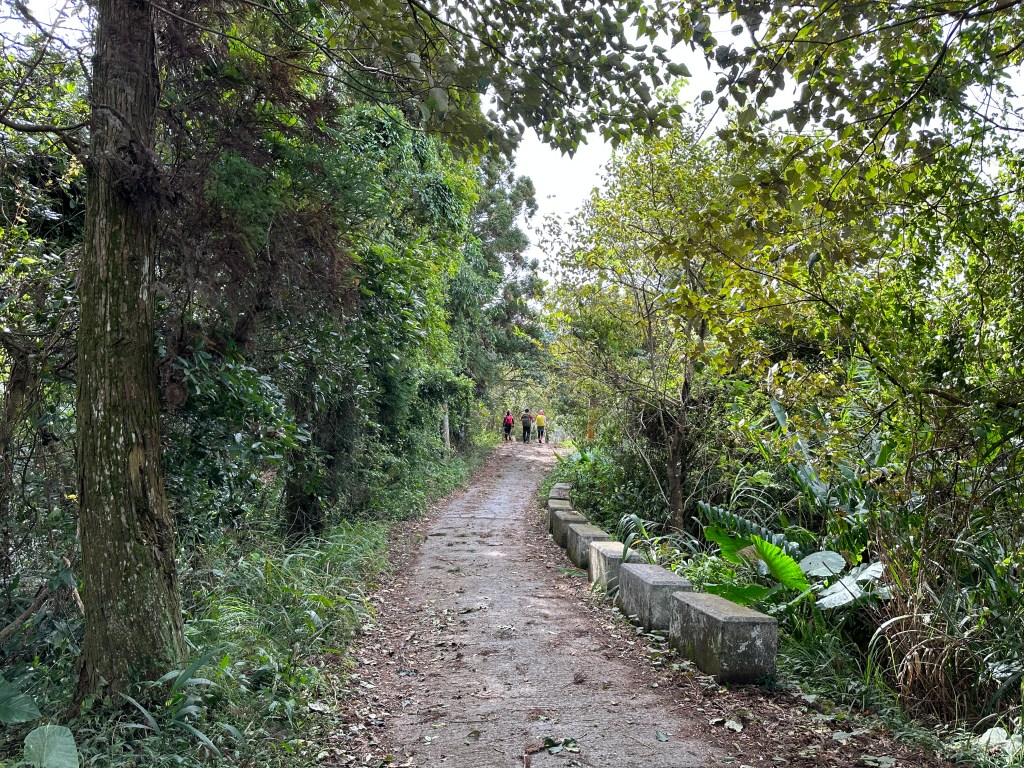 接著,持續沿著逃學步道一路陡下,經過大山北月咖啡廳,也就是豐鄉國小舊址,我們在此拍照一番,隨即通過大山背人文生態館,沿著竹35往下走約250m即可抵達騎龍古道口,走在這約有1.2K長度的古道一路陡下,但都是石階路,很好走但稍微潮濕一些。出了古道,還要600m的距離可回到停車場,接上產業道路後再接上橫豐產業道路,即回到第一停車場,完成了今天象一隻狗狗形狀的O型。