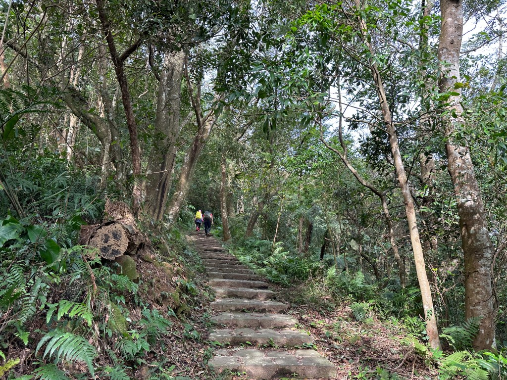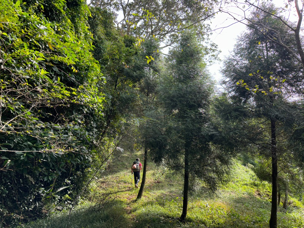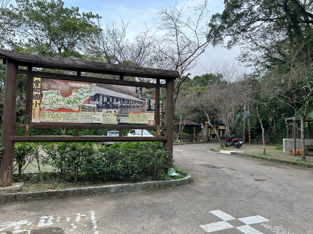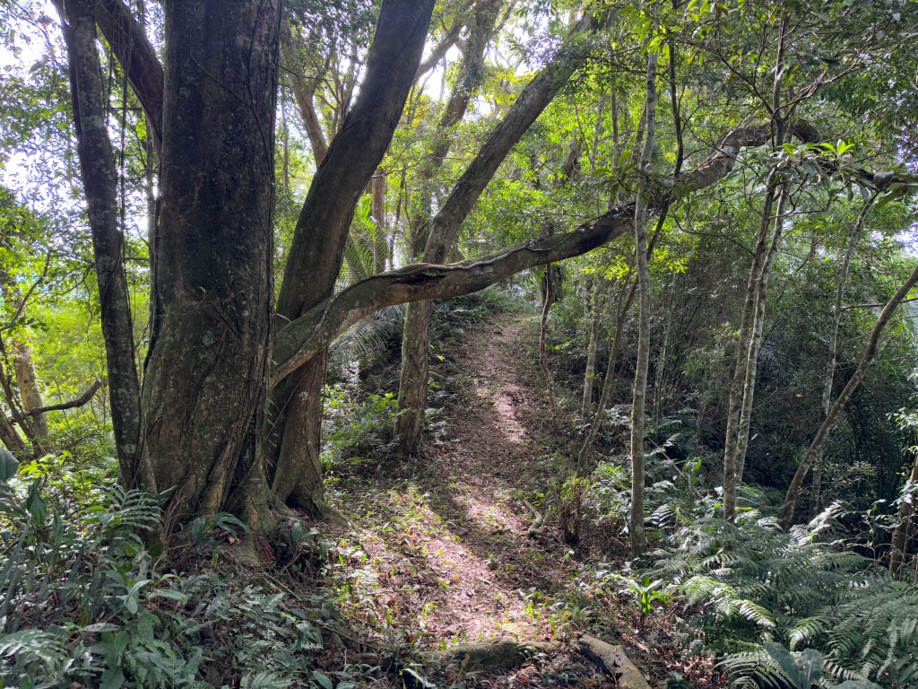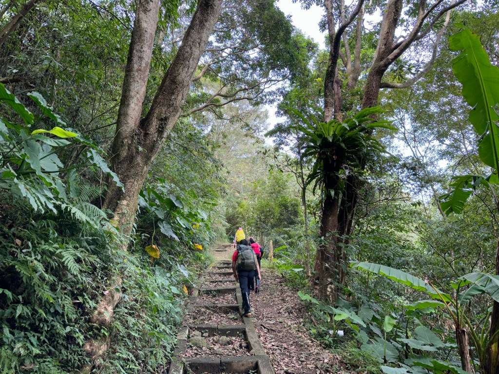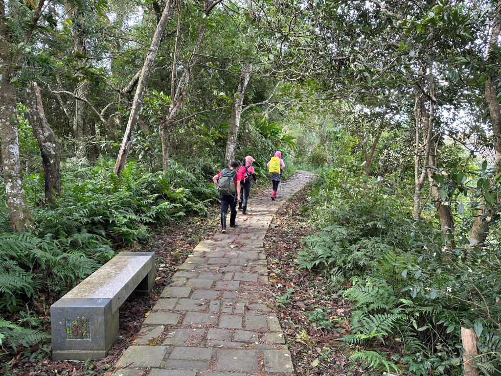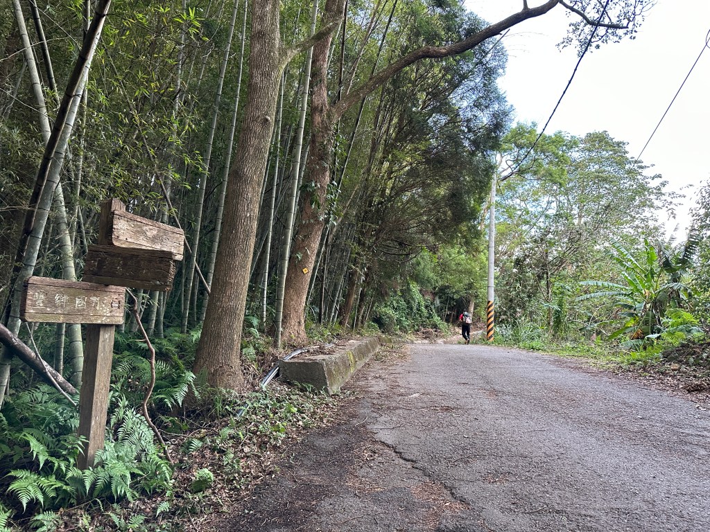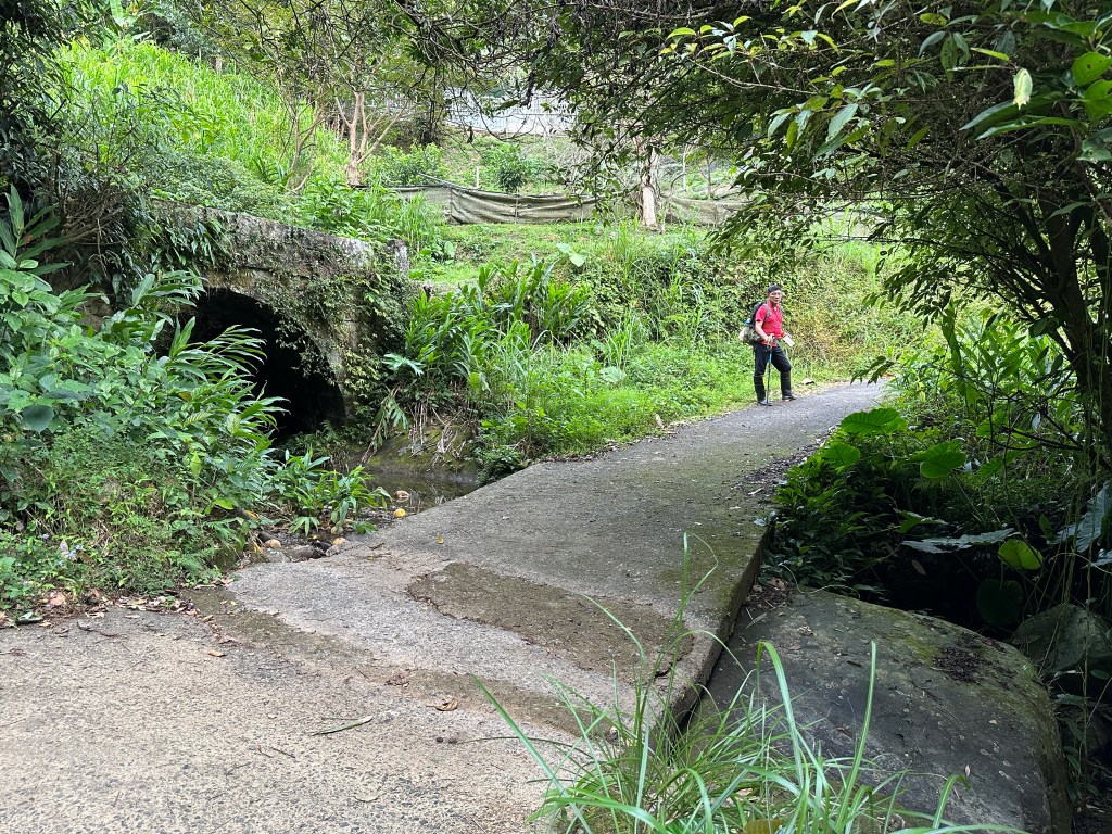 接著,持續沿著逃學步道一路陡下,經過大山北月咖啡廳,也就是豐鄉國小舊址,我們在此拍照一番,隨即通過大山背人文生態館,沿著竹35往下走約250m即可抵達騎龍古道口,走在這約有1.2K長度的古道一路陡下,但都是石階路,很好走但稍微潮濕一些。出了古道,還要600m的距離可回到停車場,接上產業道路後再接上橫豐產業道路,即回到第一停車場,完成了今天象一隻狗狗形狀的O型。