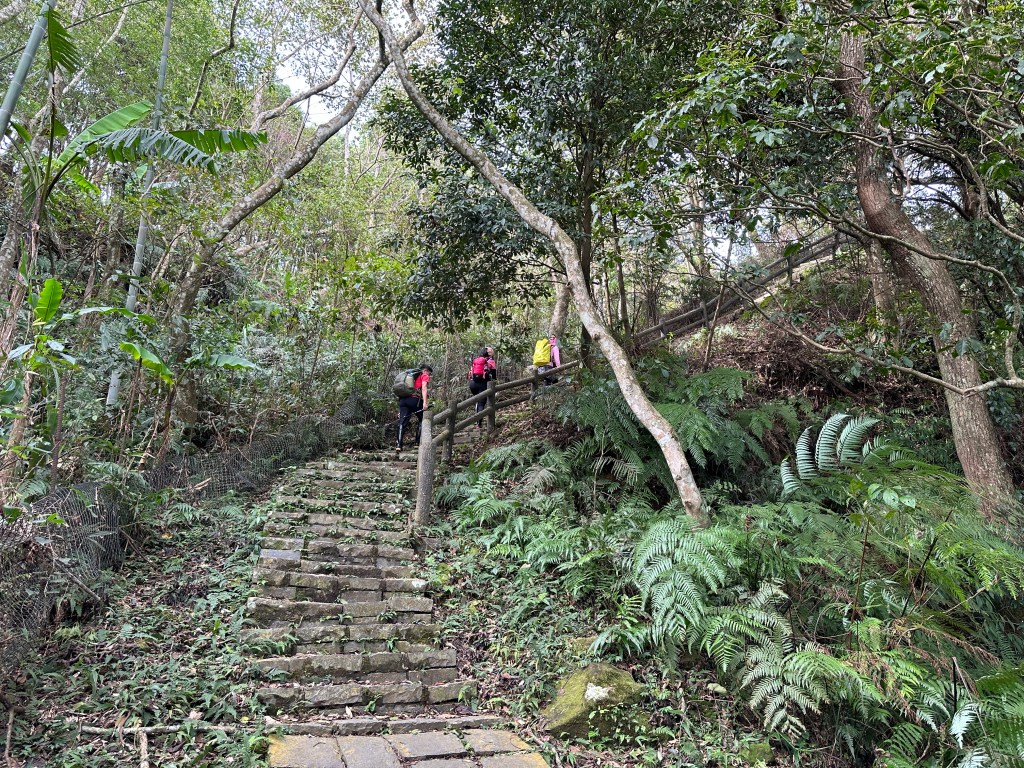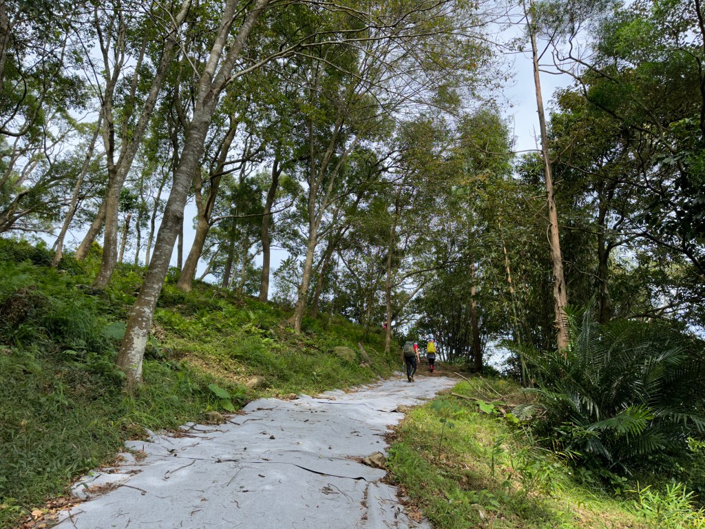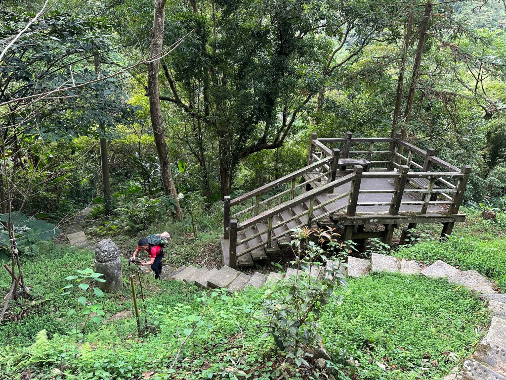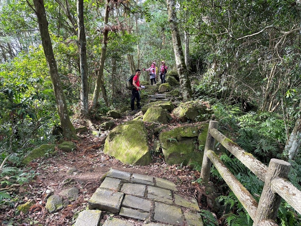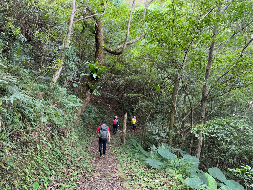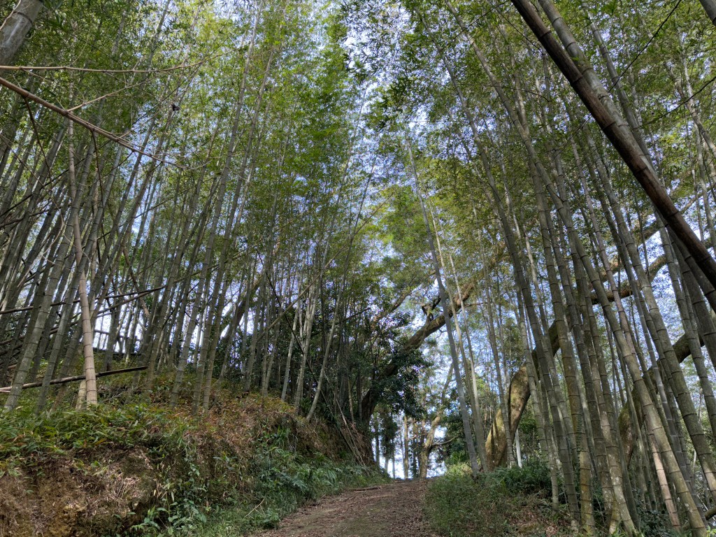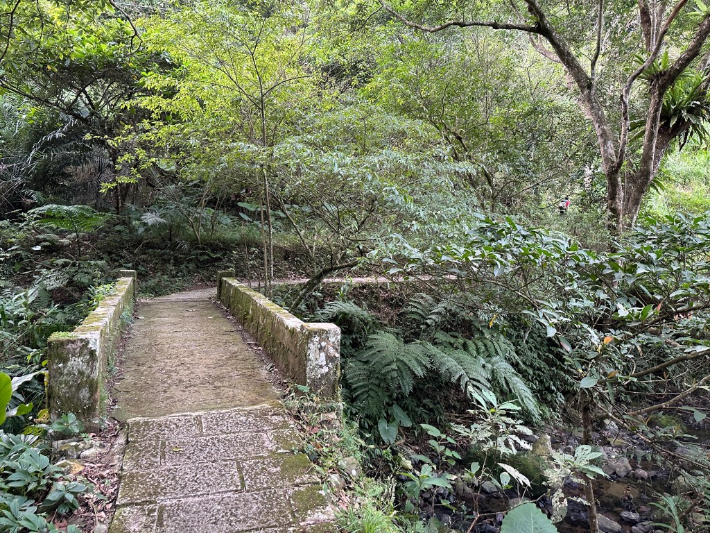 接著,持續沿著逃學步道一路陡下,經過大山北月咖啡廳,也就是豐鄉國小舊址,我們在此拍照一番,隨即通過大山背人文生態館,沿著竹35往下走約250m即可抵達騎龍古道口,走在這約有1.2K長度的古道一路陡下,但都是石階路,很好走但稍微潮濕一些。出了古道,還要600m的距離可回到停車場,接上產業道路後再接上橫豐產業道路,即回到第一停車場,完成了今天象一隻狗狗形狀的O型。