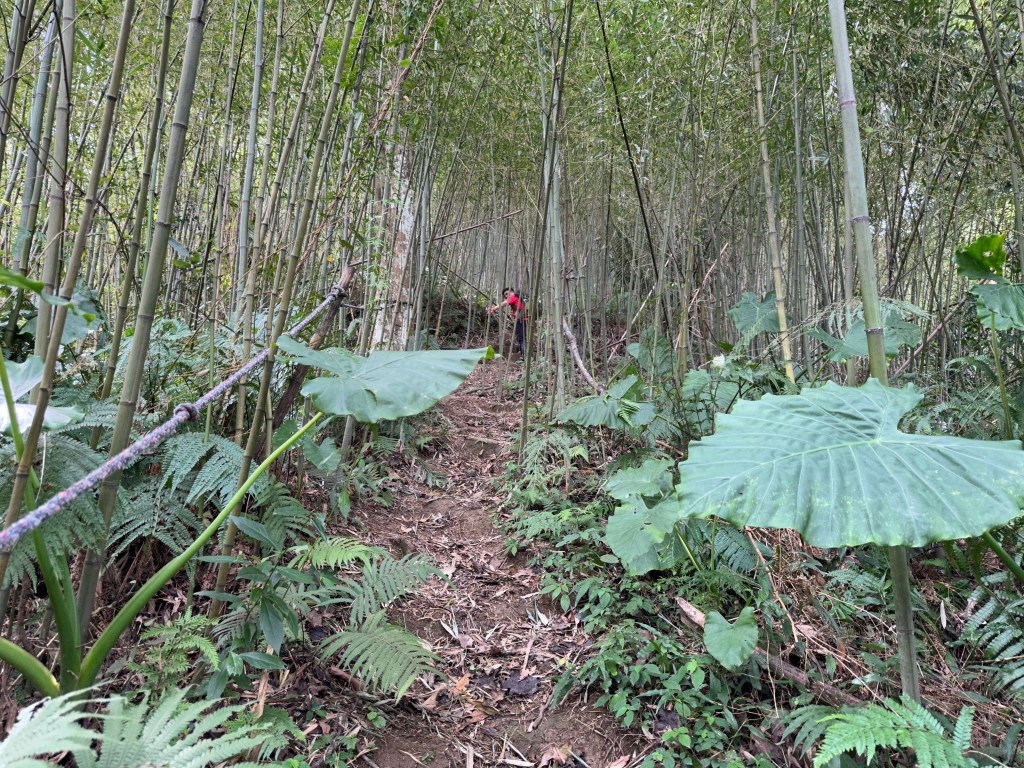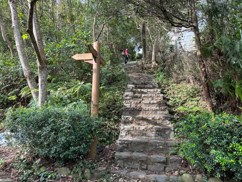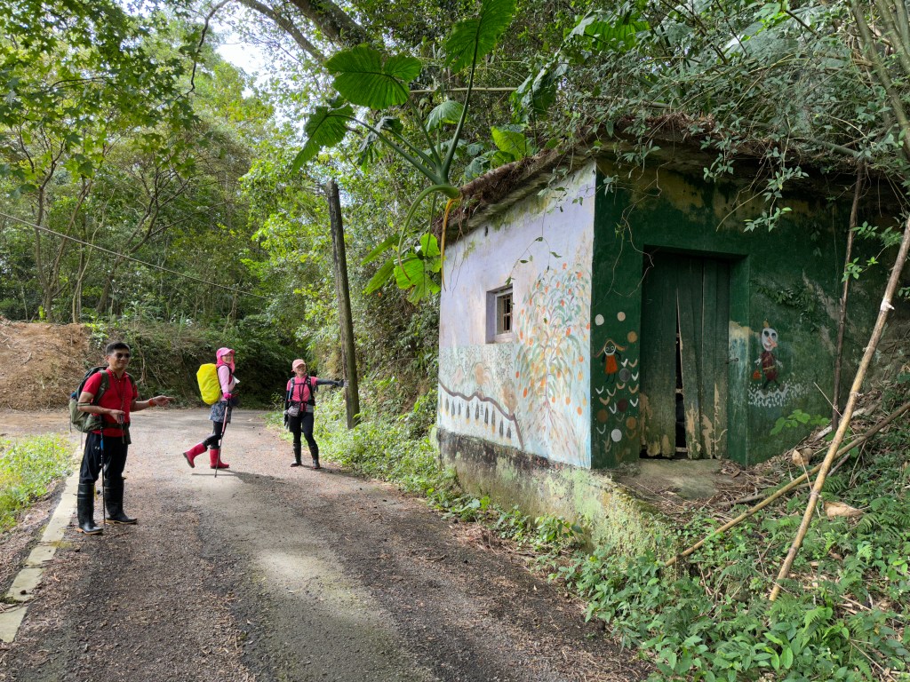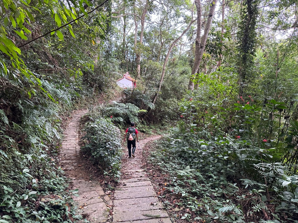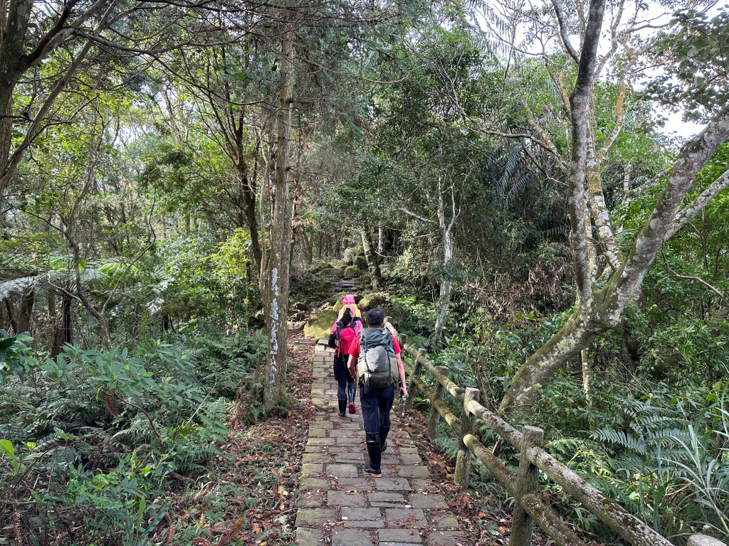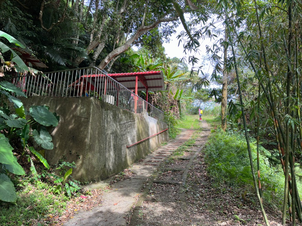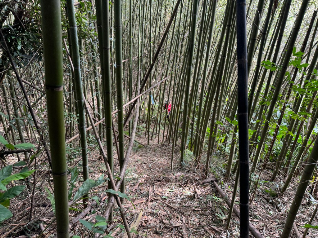 接著,持續沿著逃學步道一路陡下,經過大山北月咖啡廳,也就是豐鄉國小舊址,我們在此拍照一番,隨即通過大山背人文生態館,沿著竹35往下走約250m即可抵達騎龍古道口,走在這約有1.2K長度的古道一路陡下,但都是石階路,很好走但稍微潮濕一些。出了古道,還要600m的距離可回到停車場,接上產業道路後再接上橫豐產業道路,即回到第一停車場,完成了今天象一隻狗狗形狀的O型。