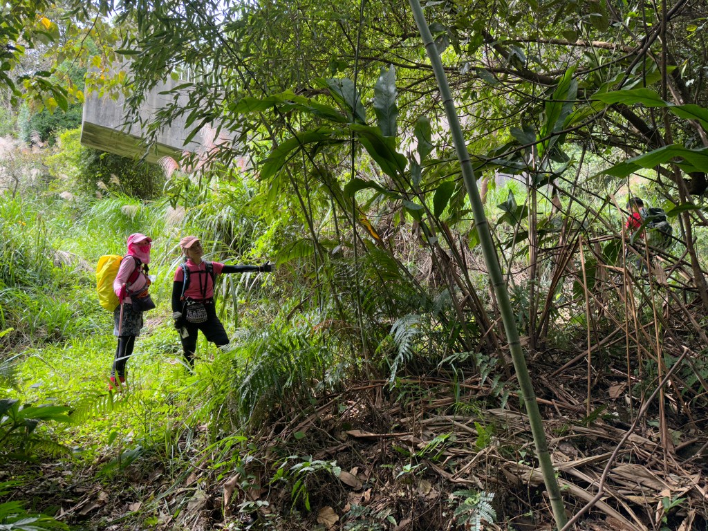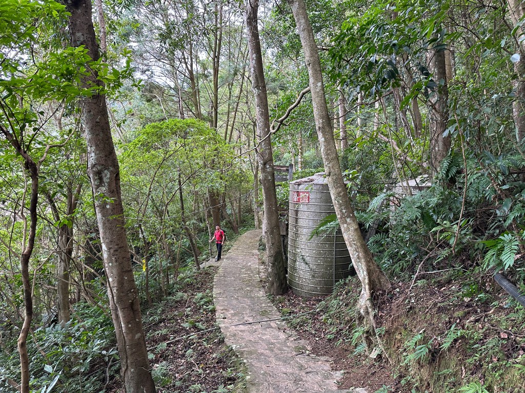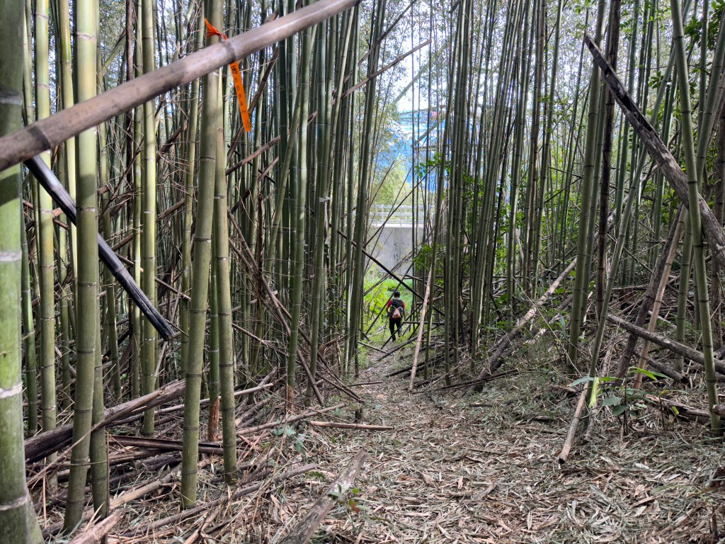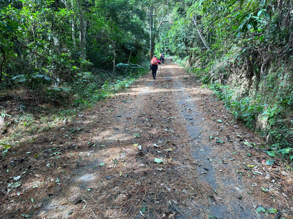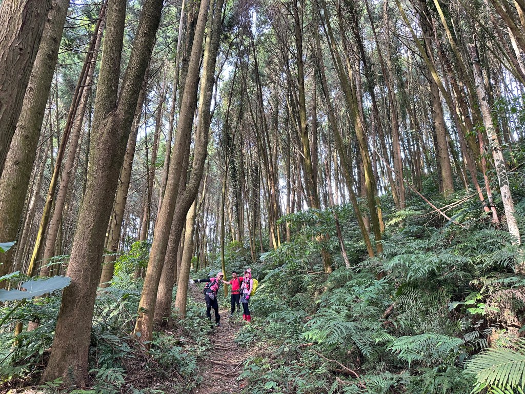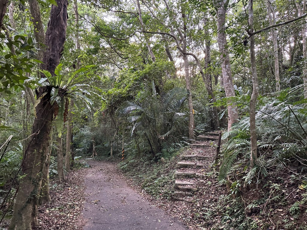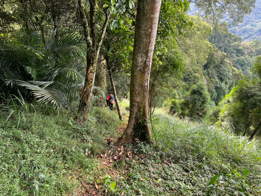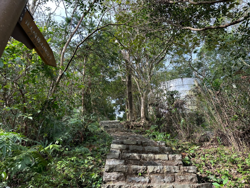 接著,持續沿著逃學步道一路陡下,經過大山北月咖啡廳,也就是豐鄉國小舊址,我們在此拍照一番,隨即通過大山背人文生態館,沿著竹35往下走約250m即可抵達騎龍古道口,走在這約有1.2K長度的古道一路陡下,但都是石階路,很好走但稍微潮濕一些。出了古道,還要600m的距離可回到停車場,接上產業道路後再接上橫豐產業道路,即回到第一停車場,完成了今天象一隻狗狗形狀的O型。