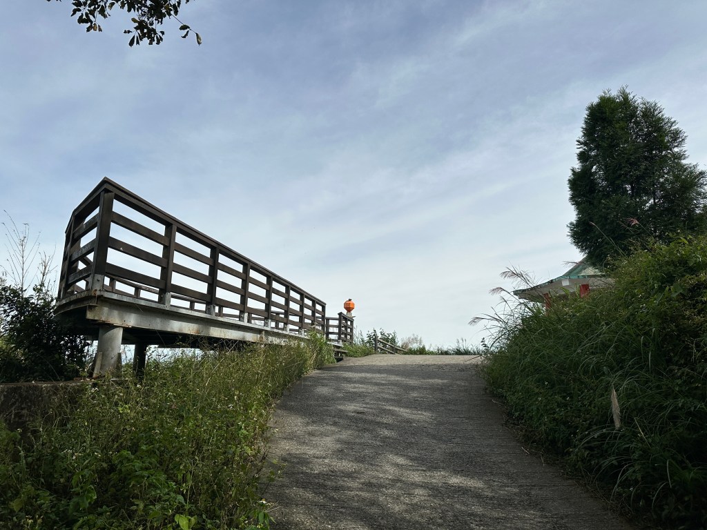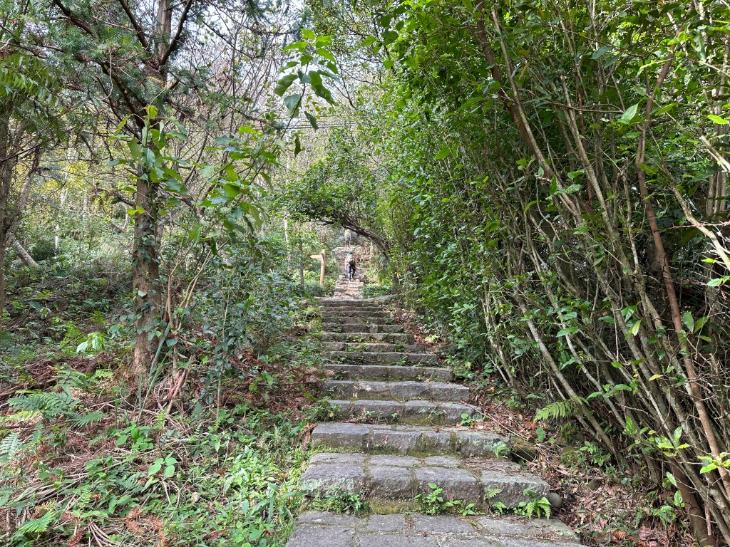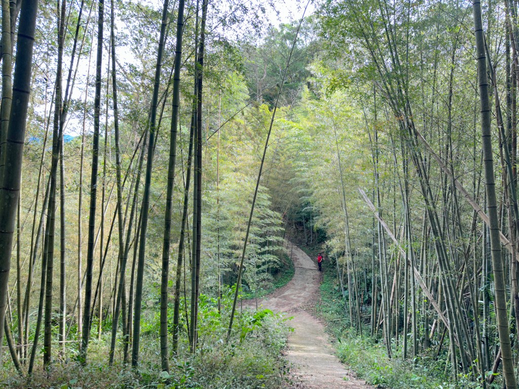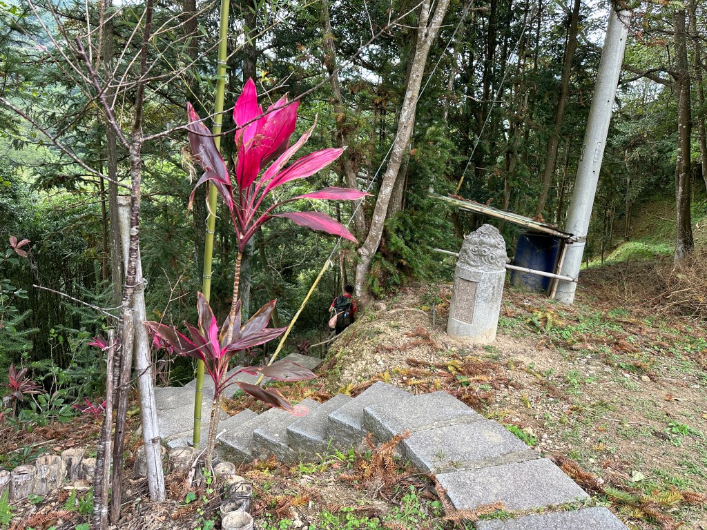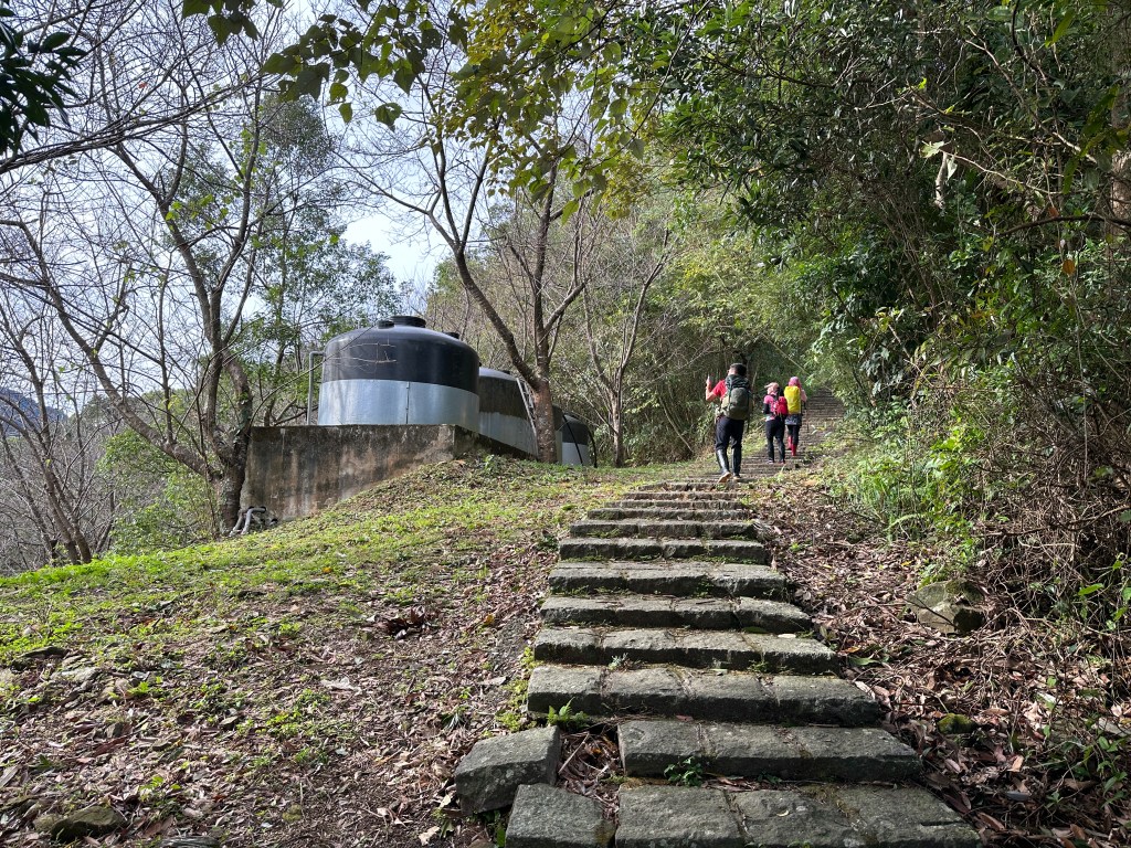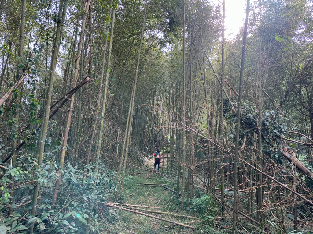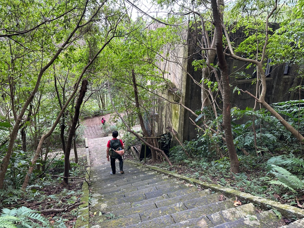 接著,持續沿著逃學步道一路陡下,經過大山北月咖啡廳,也就是豐鄉國小舊址,我們在此拍照一番,隨即通過大山背人文生態館,沿著竹35往下走約250m即可抵達騎龍古道口,走在這約有1.2K長度的古道一路陡下,但都是石階路,很好走但稍微潮濕一些。出了古道,還要600m的距離可回到停車場,接上產業道路後再接上橫豐產業道路,即回到第一停車場,完成了今天象一隻狗狗形狀的O型。
