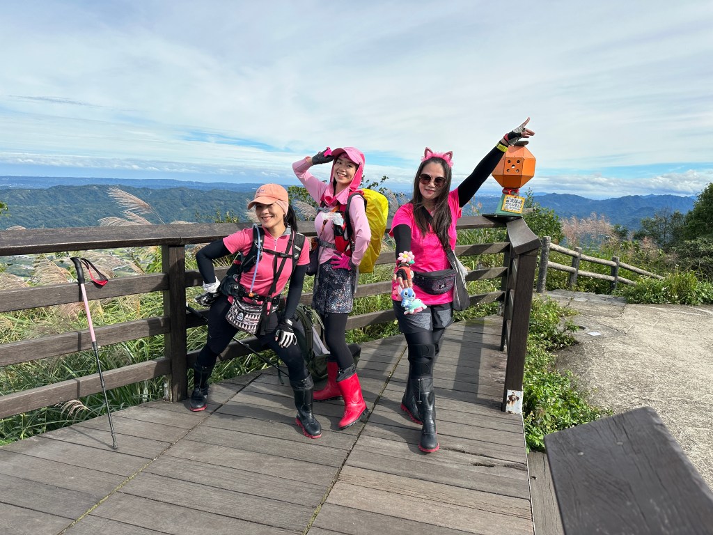 因此,我們繼續往前走300m,由更前方的岔路陡上,走400m的距離即可陡上到水頭排山,中途會經過電塔,記得要由電塔的右側走,不要由左側走。接著快要抵達水頭排山前,就會直接由樹林內看到前方遼闊的展望,一上來後就發現水頭排山旁是一大片的開闊山頭,難怪這裡會是飛行傘的最佳地點!水頭排山在此山頭旁的觀景台旁邊,我們今天在觀景頭旁的三角點要拍照時,發現到草叢裡有一大群的虎頭峰正在搬家,我們也不敢喧嘩干擾,拍完照舊趕緊下到觀景台下方的開闊山頭旁吃午餐。
