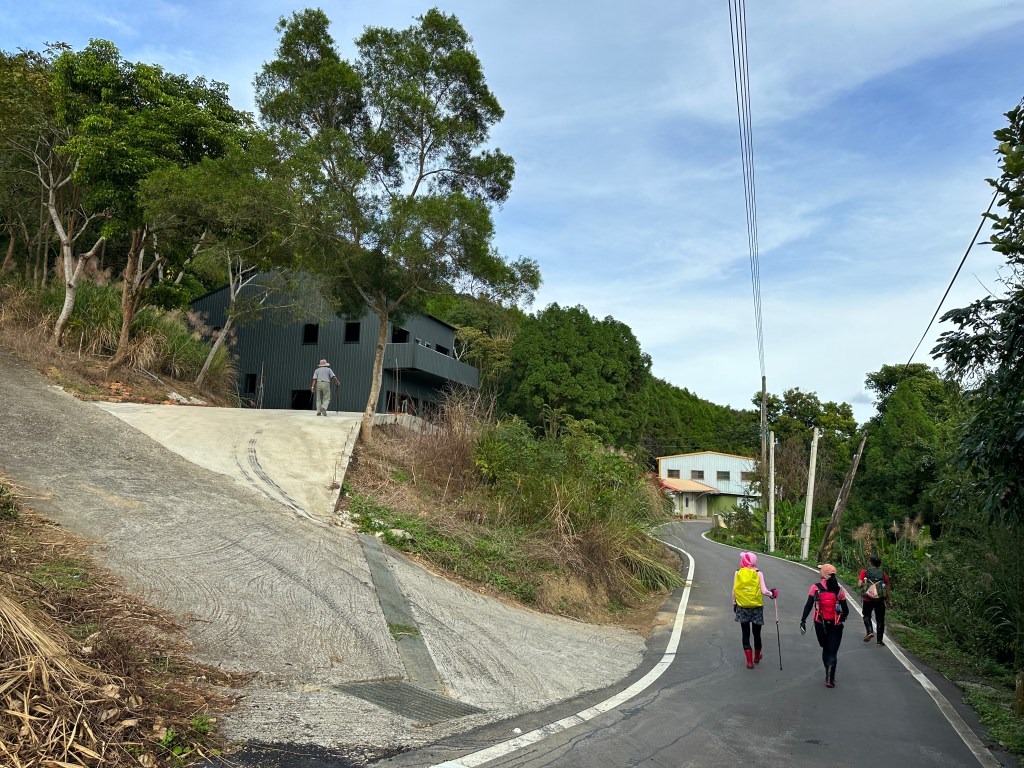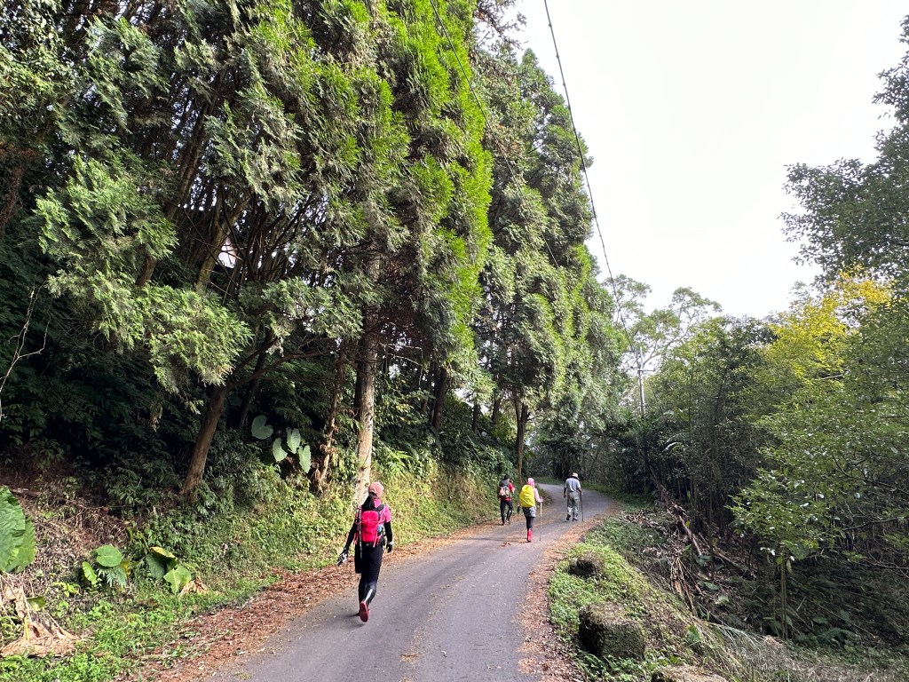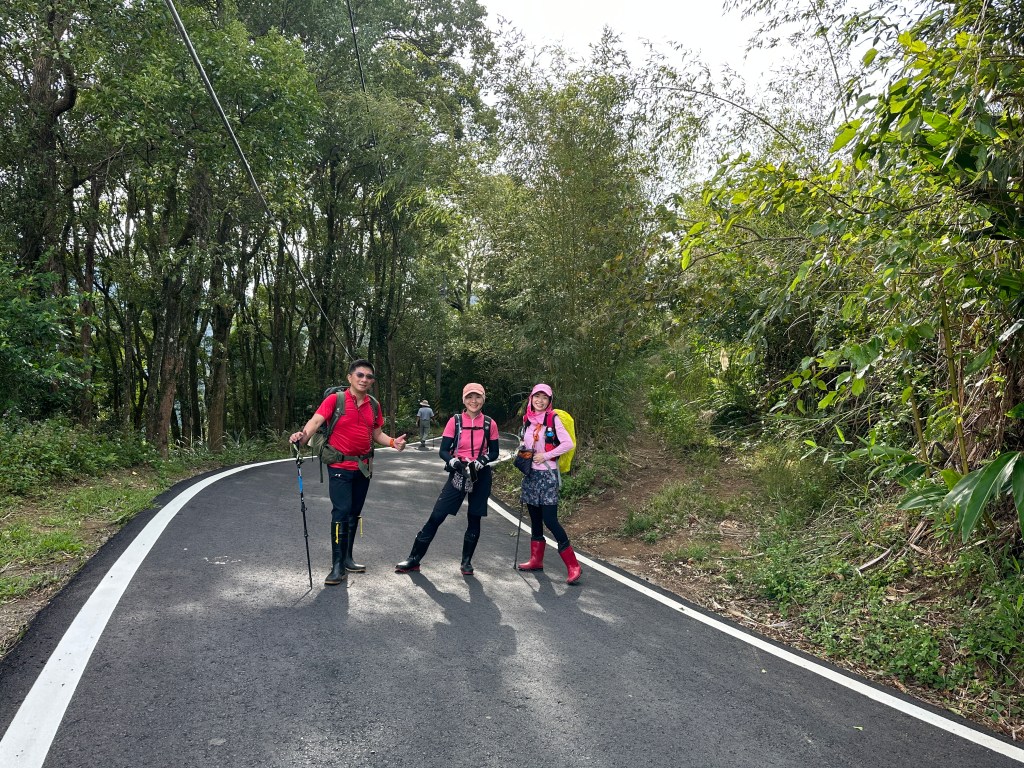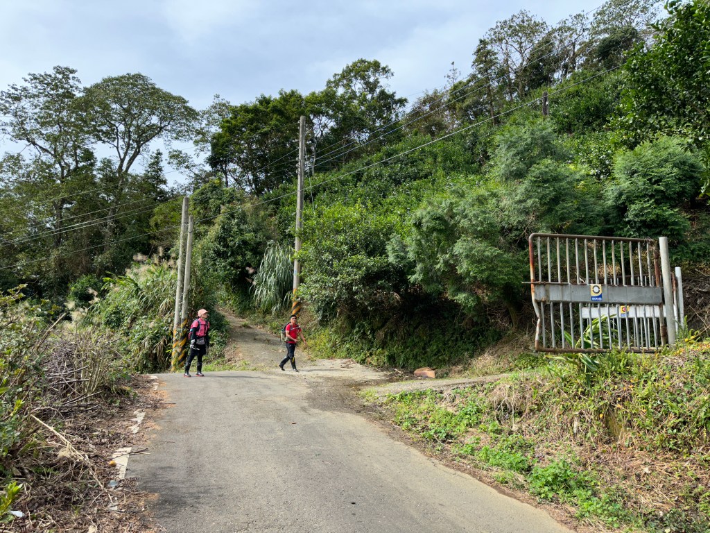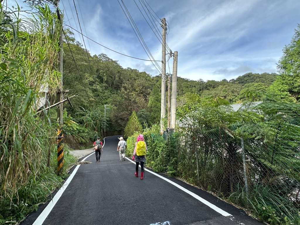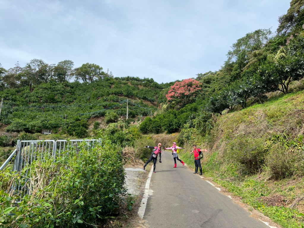 由薯園山陡下走500m的距離,接著就會接上產業道路,此時一下產業道路,就看到先下來的采庭與妙妙正在與一位路過的簡大哥正在閒聊,聊到我們這一天走的路線還蠻大圈的,簡大哥是住在這裡的退休居民,此時正在沿著產業道路運動走走。聊了一番後,我們與簡大哥互道再見,就緊接著要由產業道路走4.3K的距離到騎龍下山登山口。