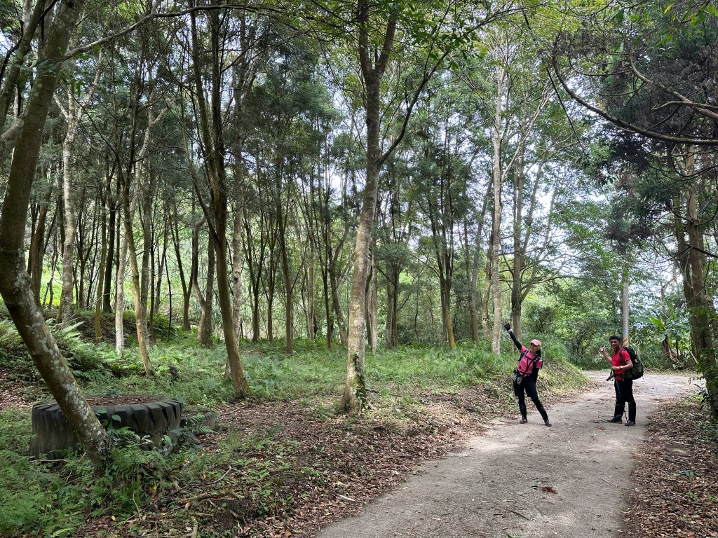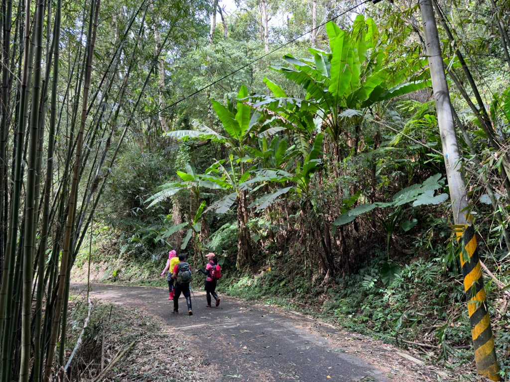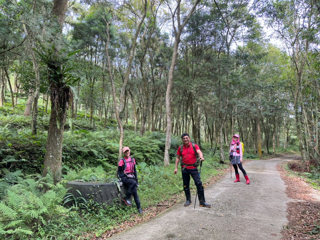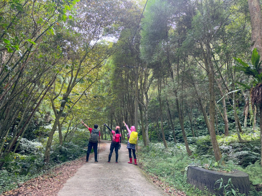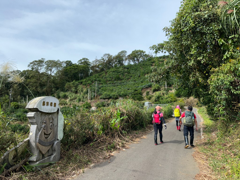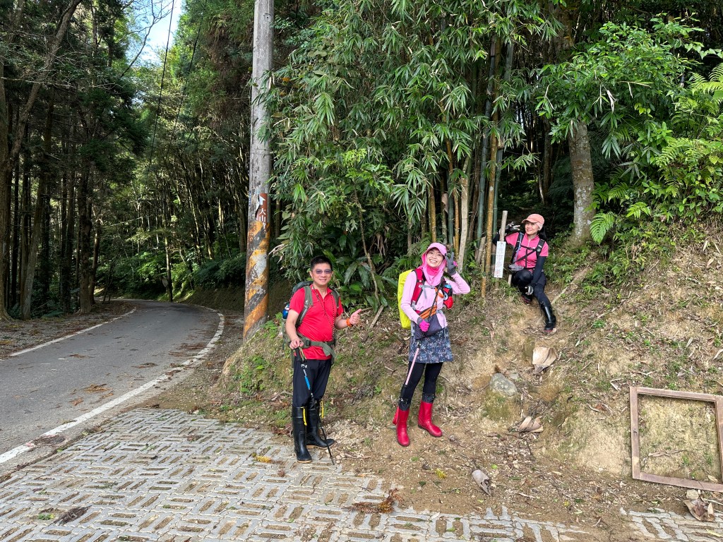 由薯園山陡下走500m的距離,接著就會接上產業道路,此時一下產業道路,就看到先下來的采庭與妙妙正在與一位路過的簡大哥正在閒聊,聊到我們這一天走的路線還蠻大圈的,簡大哥是住在這裡的退休居民,此時正在沿著產業道路運動走走。聊了一番後,我們與簡大哥互道再見,就緊接著要由產業道路走4.3K的距離到騎龍下山登山口。