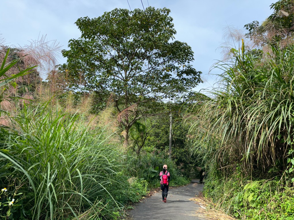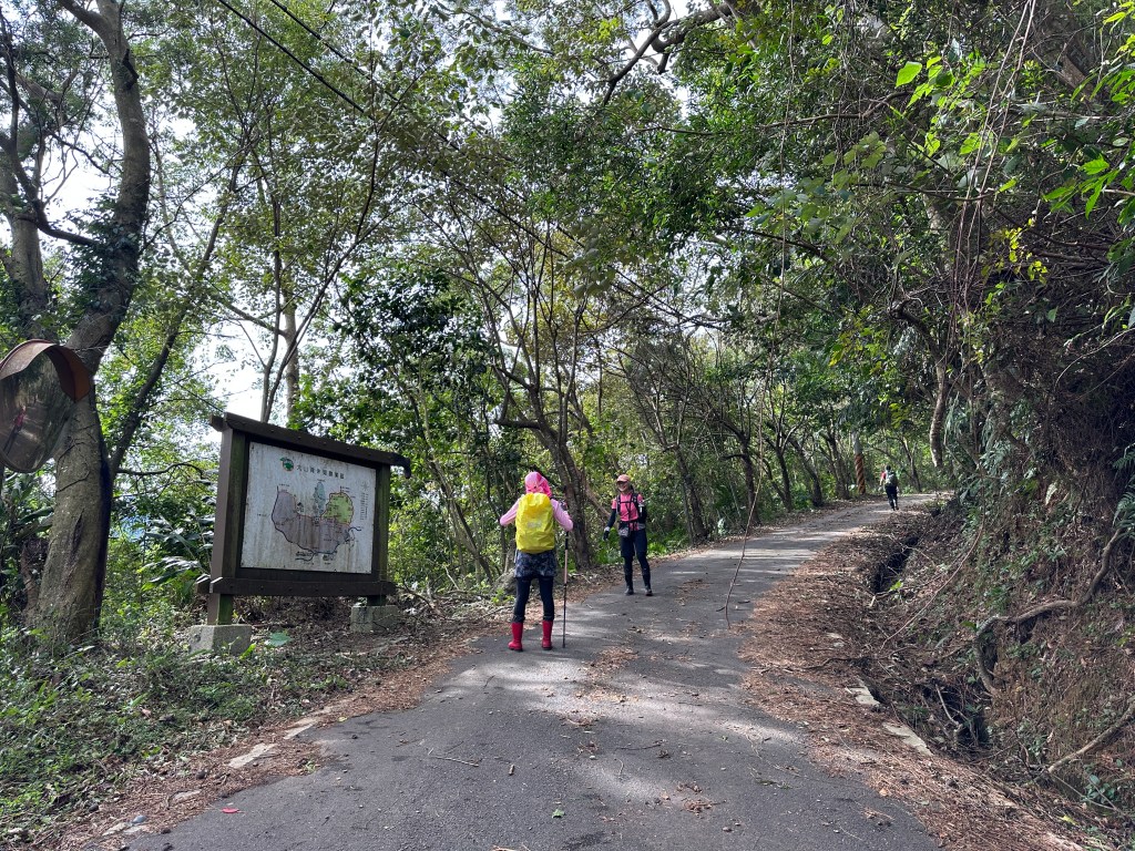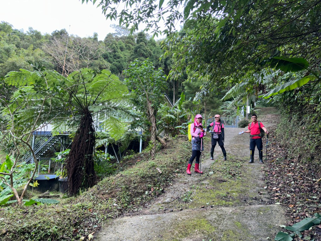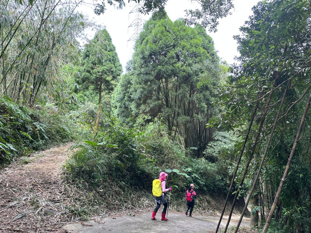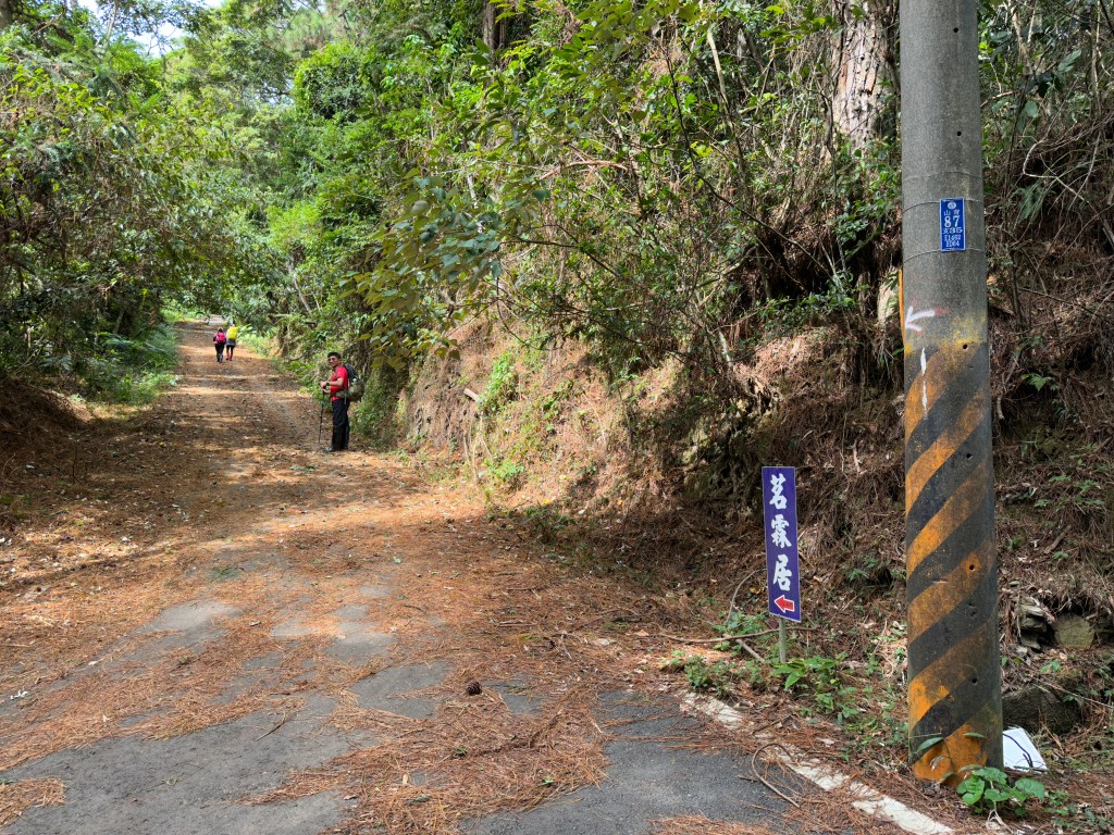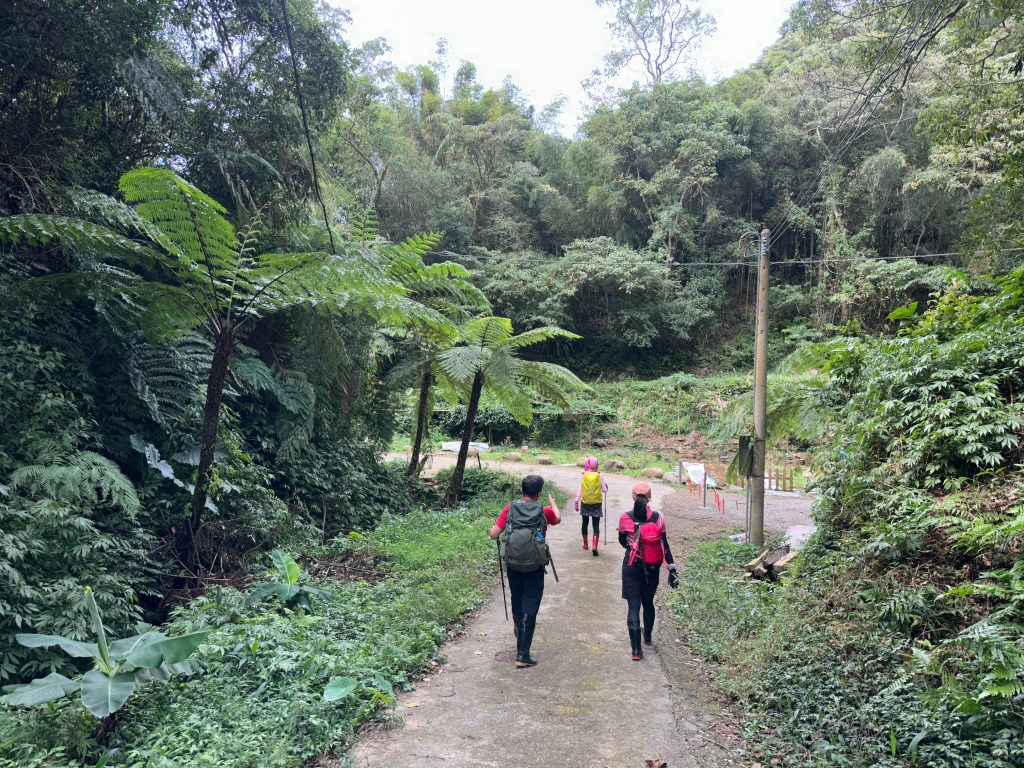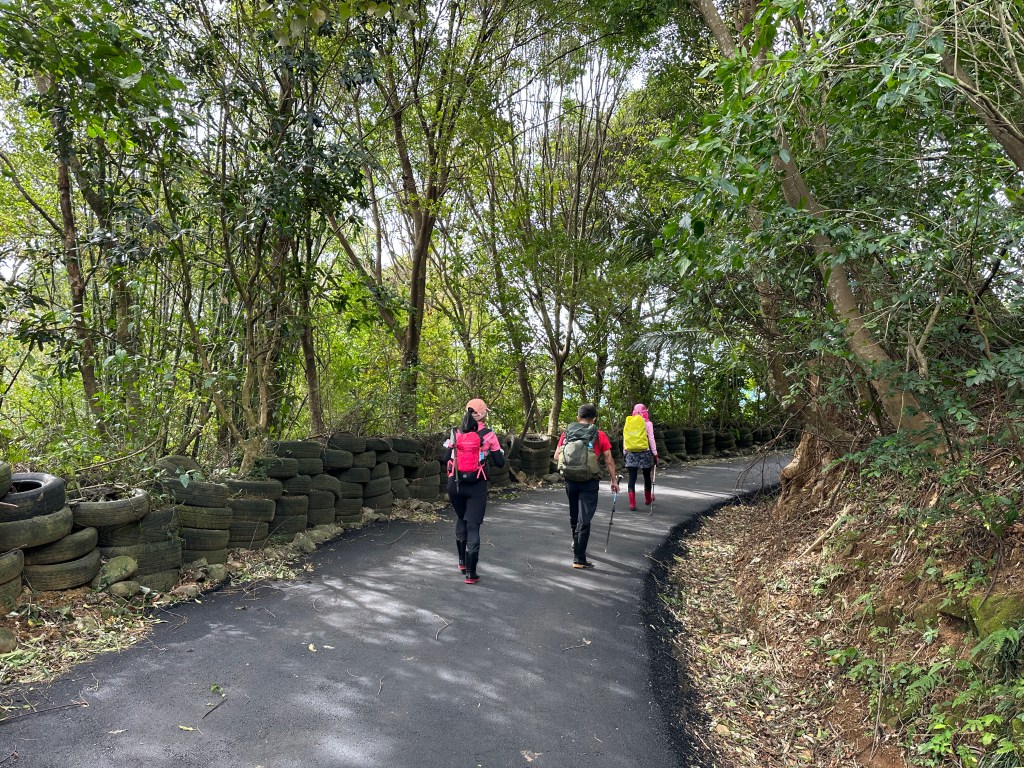 由薯園山陡下走500m的距離,接著就會接上產業道路,此時一下產業道路,就看到先下來的采庭與妙妙正在與一位路過的簡大哥正在閒聊,聊到我們這一天走的路線還蠻大圈的,簡大哥是住在這裡的退休居民,此時正在沿著產業道路運動走走。聊了一番後,我們與簡大哥互道再見,就緊接著要由產業道路走4.3K的距離到騎龍下山登山口。