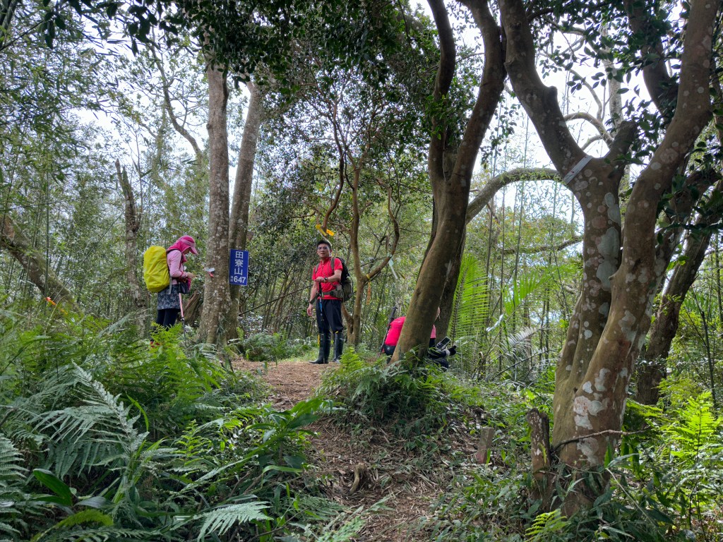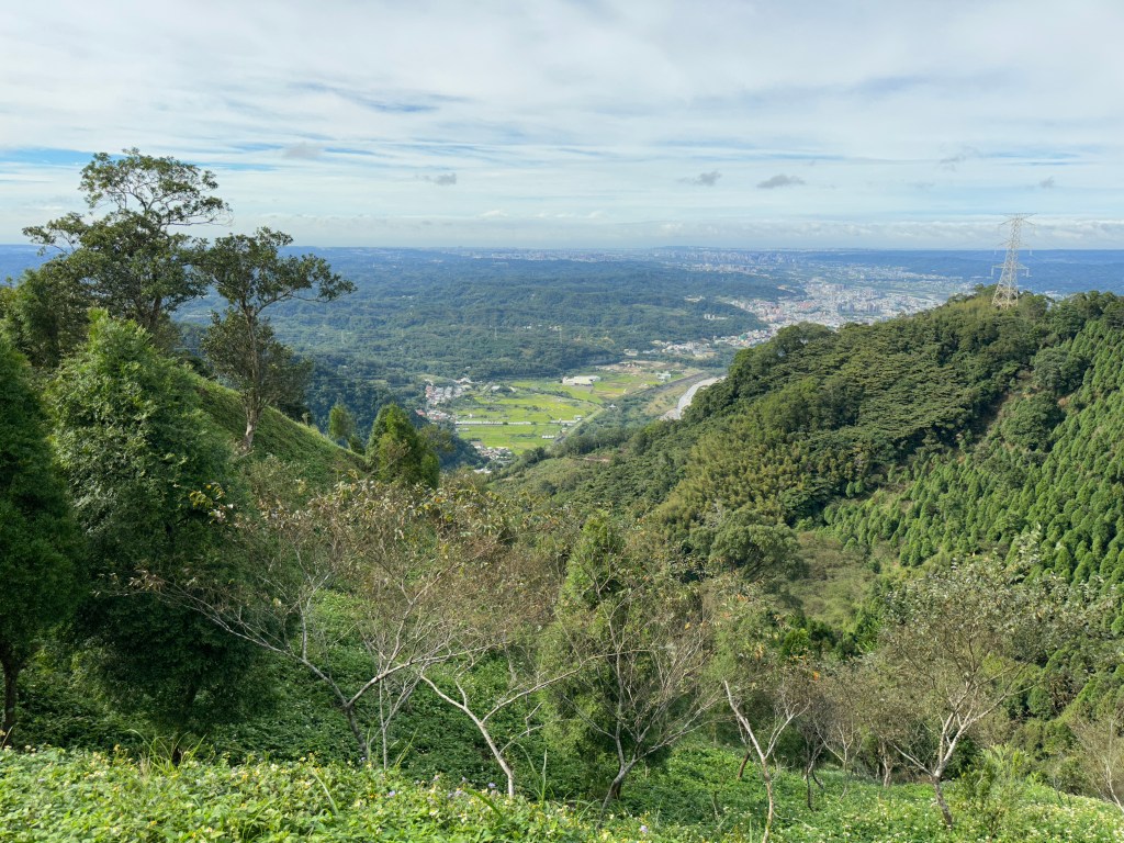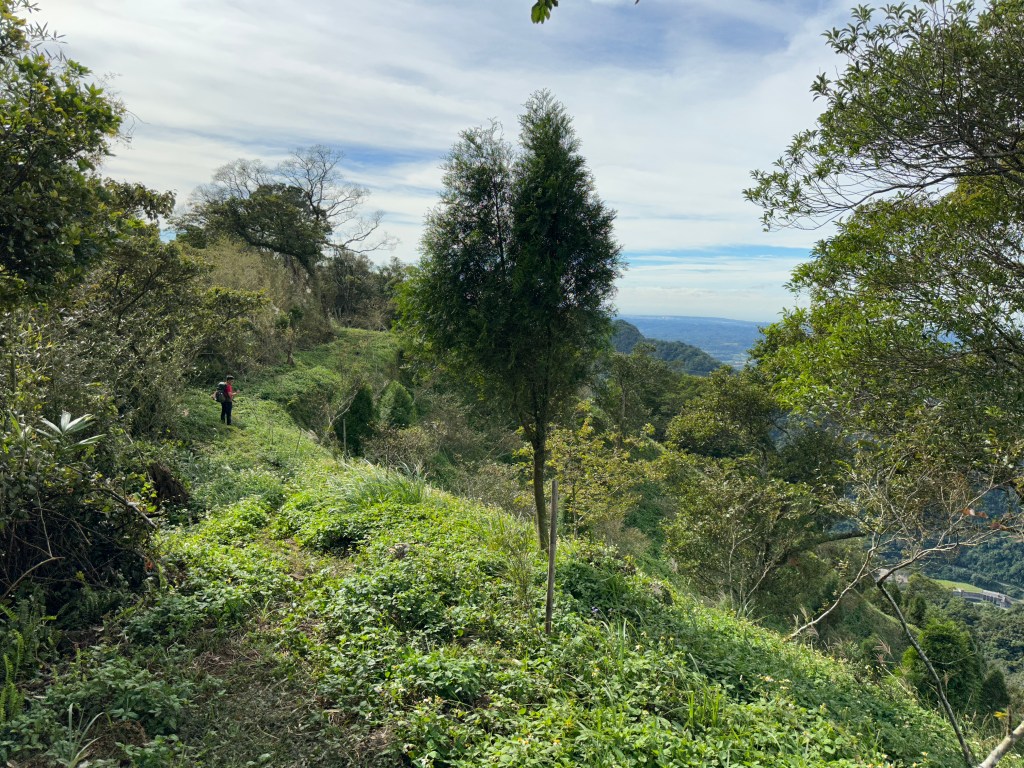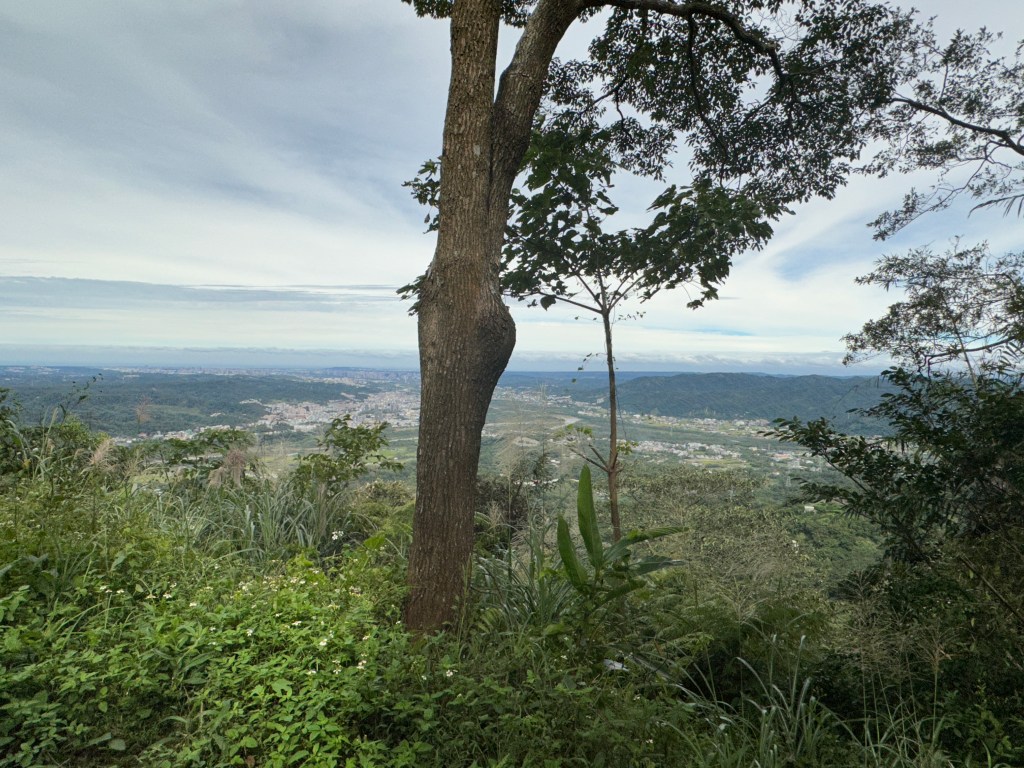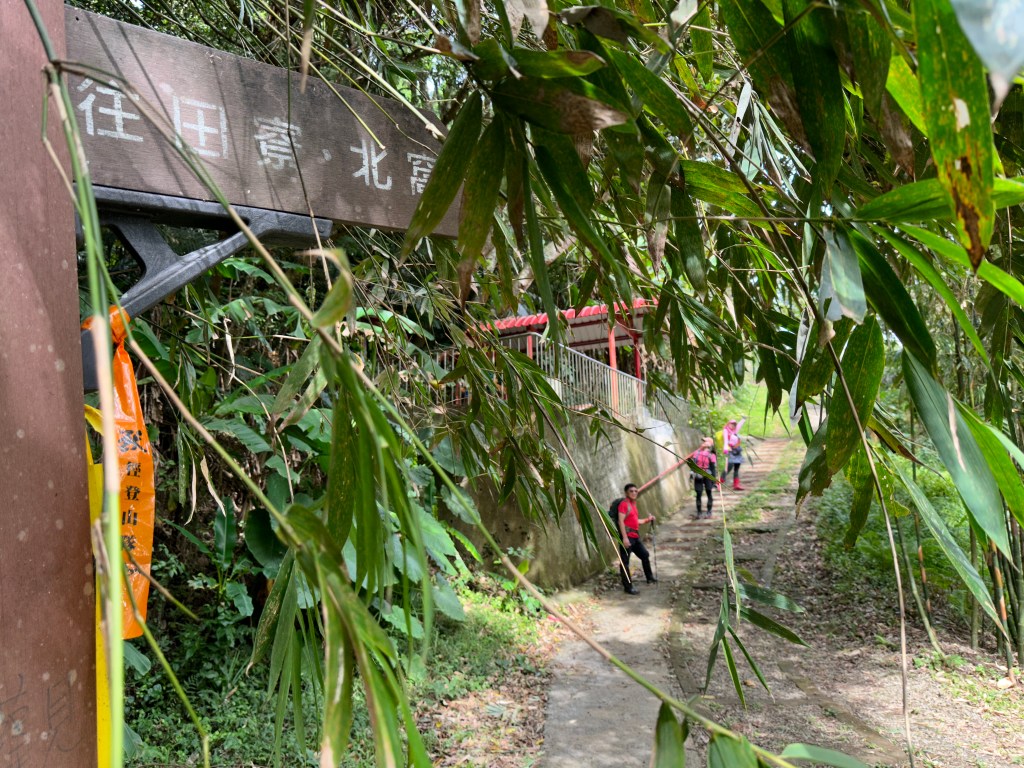 在大山背山涼亭前的觀景台看著新竹的遠景後,四人就沿著大山背休閒農業產業道路一路陡下,再接上北窩道路,由北窩道路岔往田寮山毬子山小徑走,走500m的陡上山徑即可達田寮山,在上稻田寮山的半途有一展望點,可以看到新竹、竹東,也能遙望著對面的飛鳳山及相連各峰的山巒稜線。田寮山這裡沒有展望。