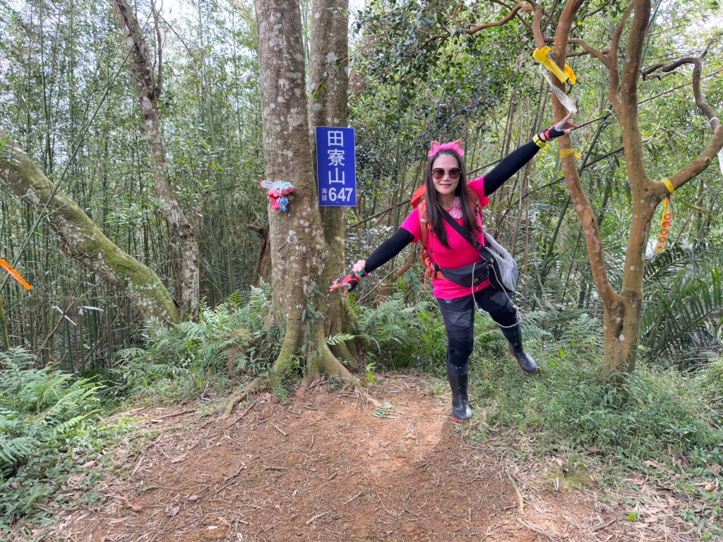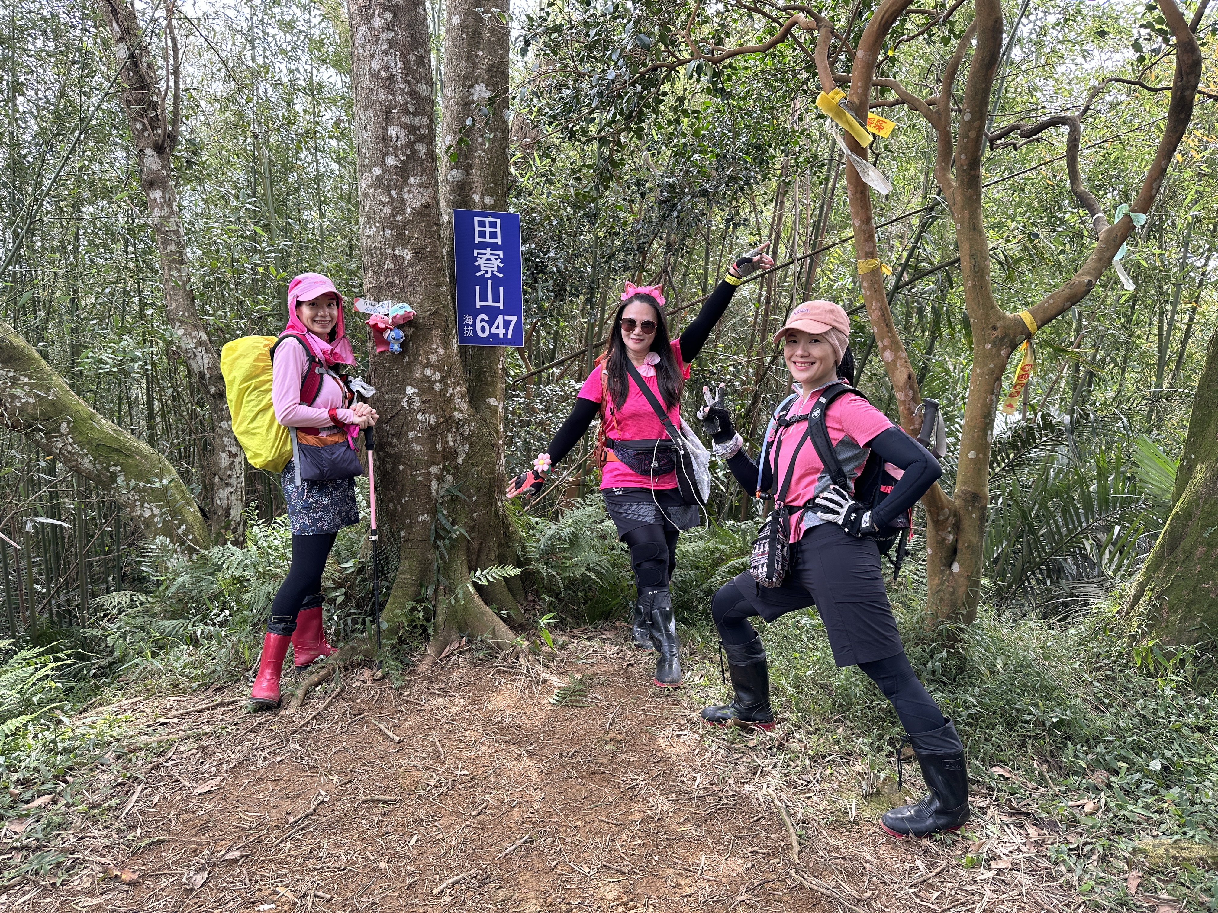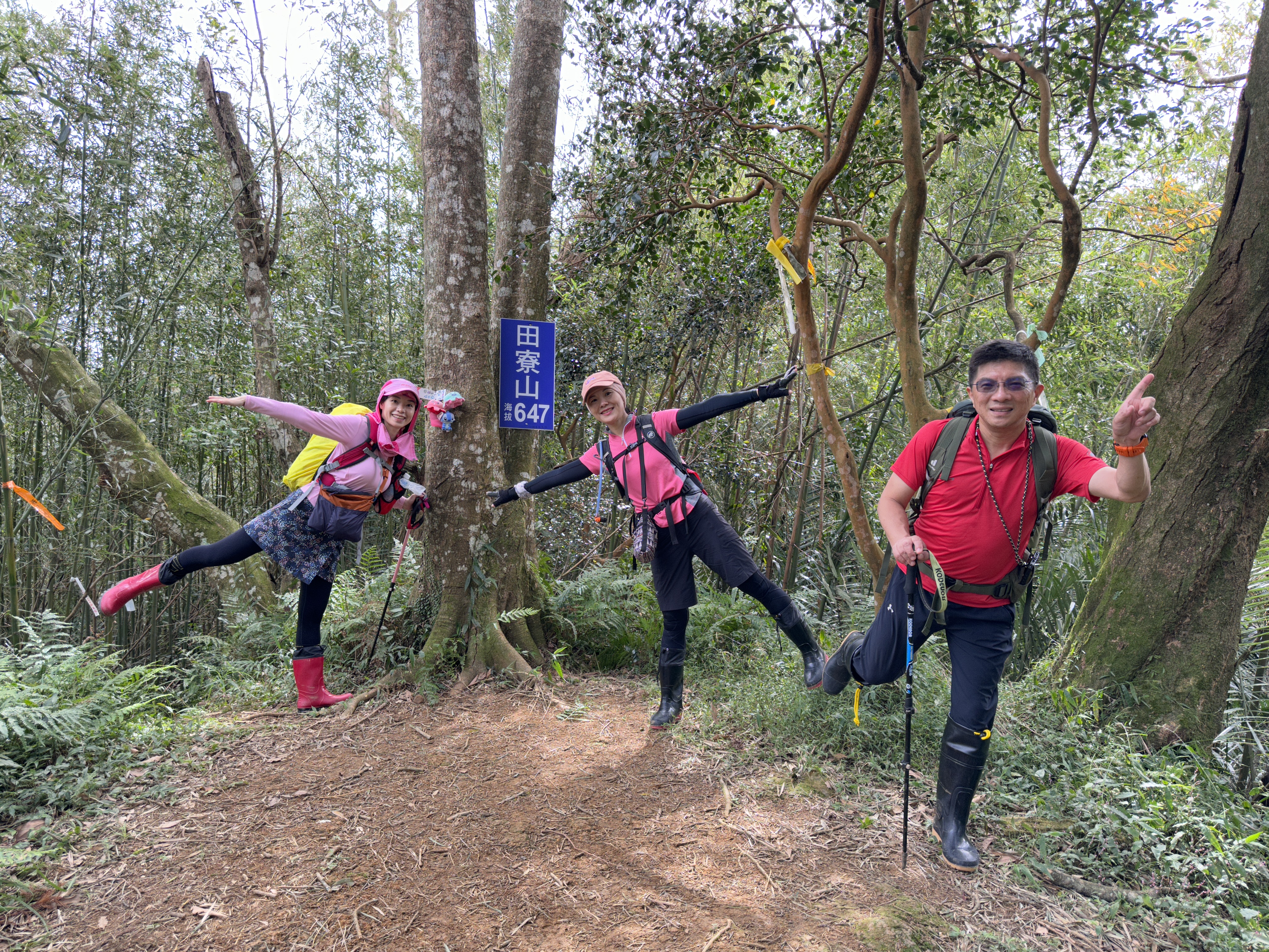 在大山背山涼亭前的觀景台看著新竹的遠景後,四人就沿著大山背休閒農業產業道路一路陡下,再接上北窩道路,由北窩道路岔往田寮山毬子山小徑走,走500m的陡上山徑即可達田寮山,在上稻田寮山的半途有一展望點,可以看到新竹、竹東,也能遙望著對面的飛鳳山及相連各峰的山巒稜線。田寮山這裡沒有展望。