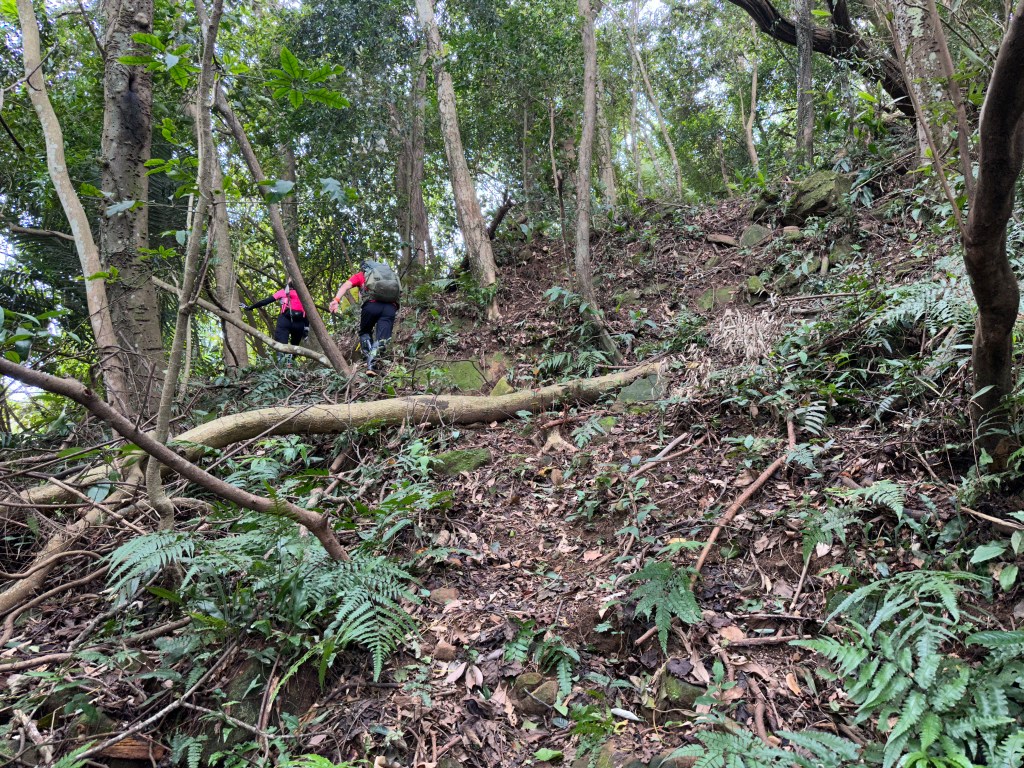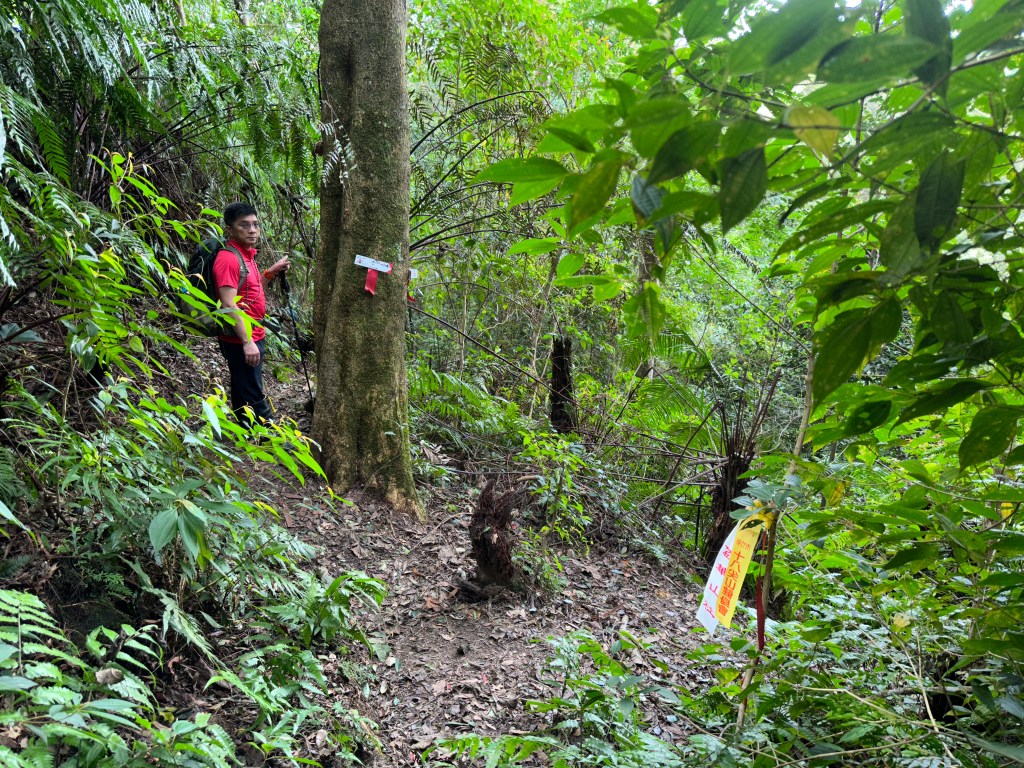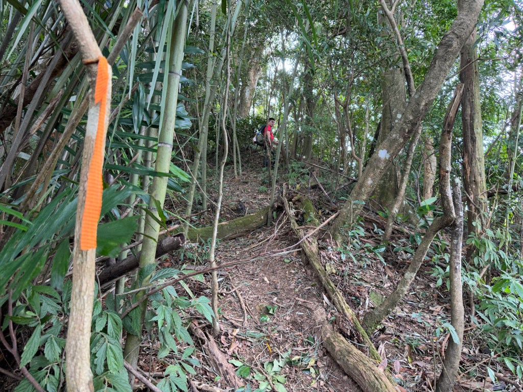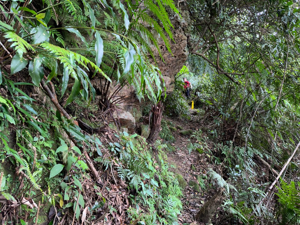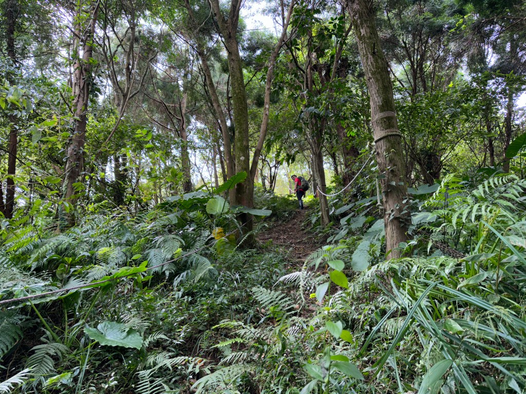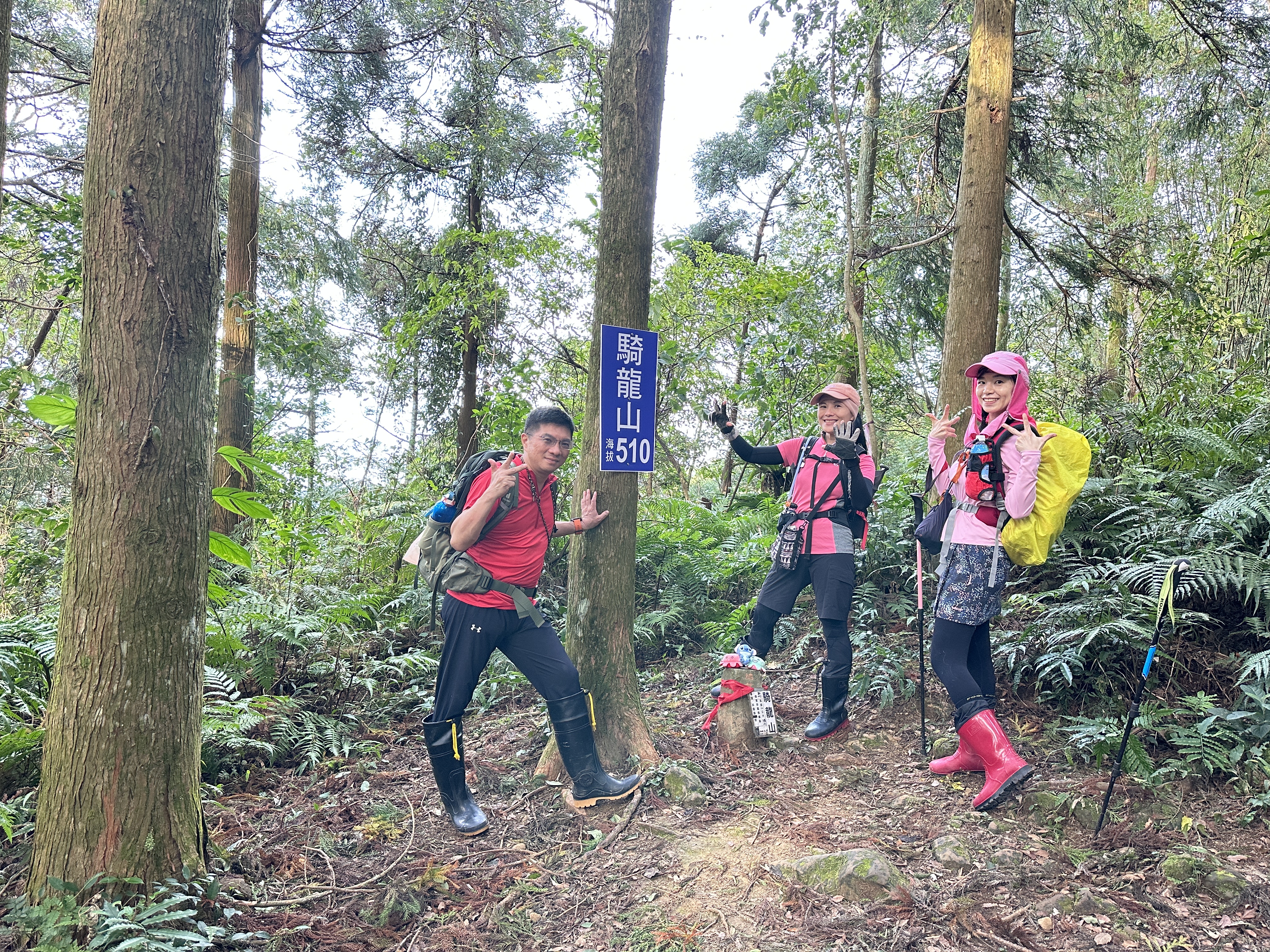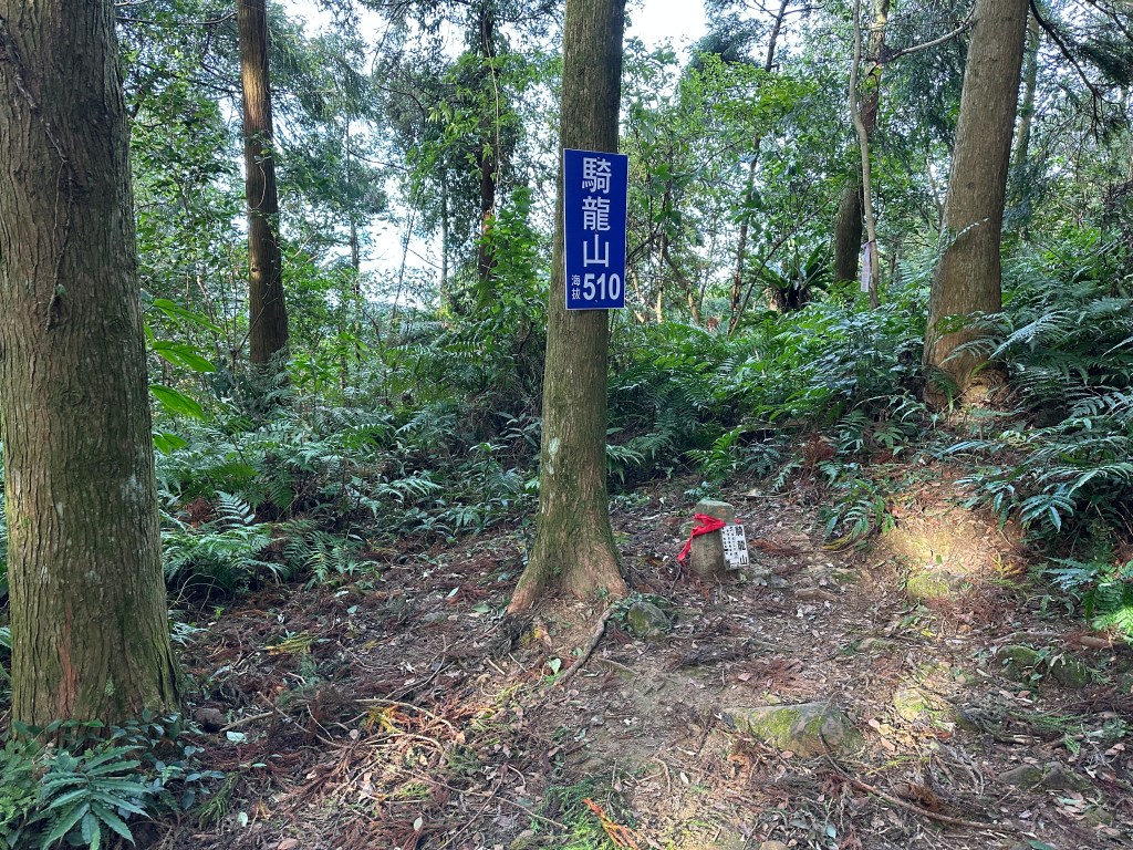 當我們下車與簡大哥互道再見後,看著離線地圖發現,騎龍下山就在路旁,但怎麼找到三角點?原來是要往左側山徑有一塊寫著:「往逃學步道」的方向走,一陡上就往右上走約10m就會抵達騎龍下山!這麼容易?從騎龍下山下走10m後,就接著往右轉入「逃學步道」,沿著逃學步道陡上走約250m就會抵達騎龍山,這已經是我們今天的第8峰了。