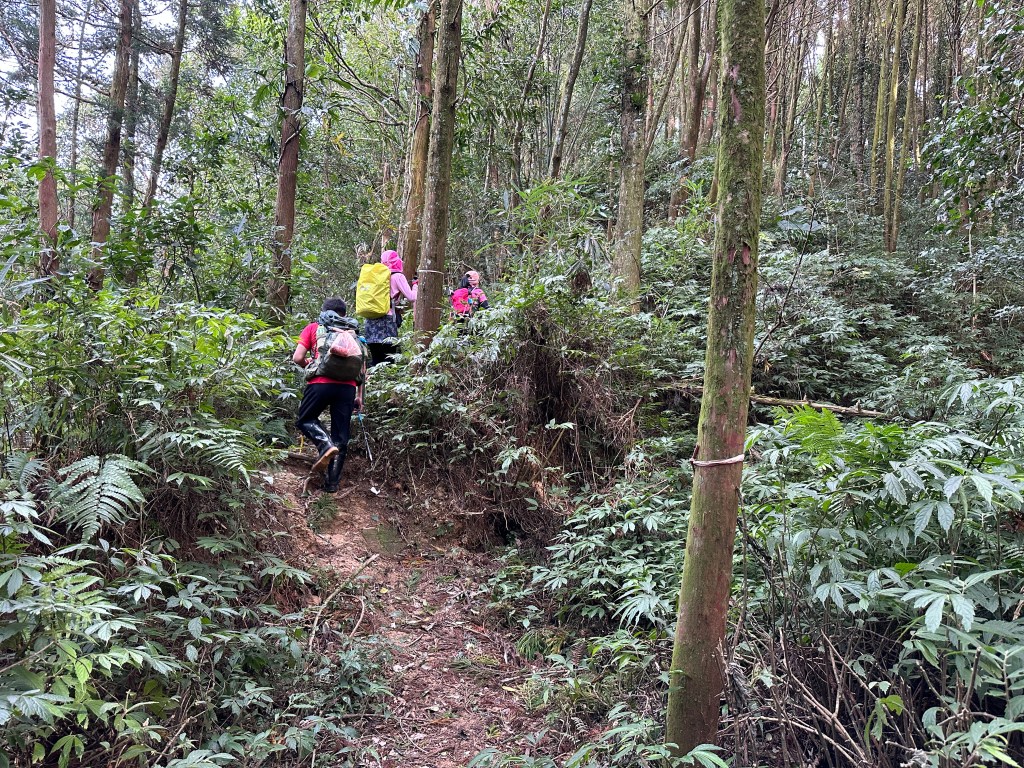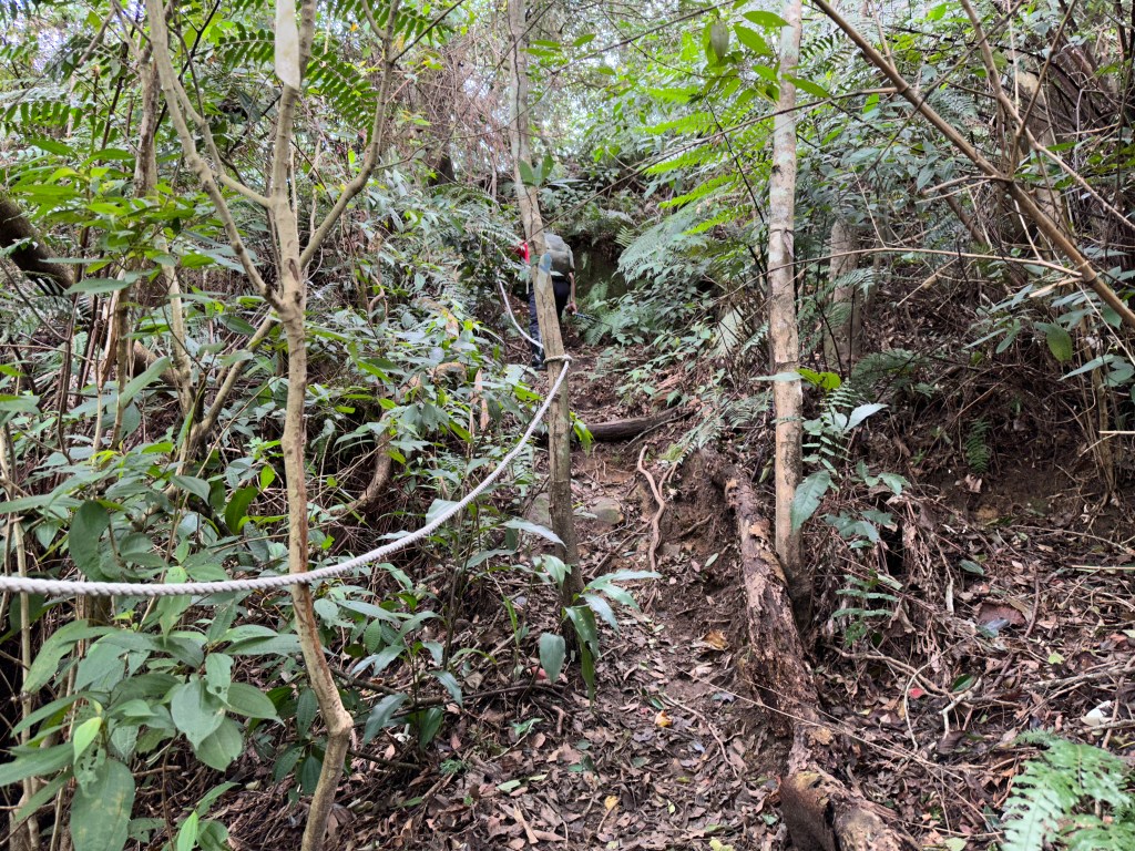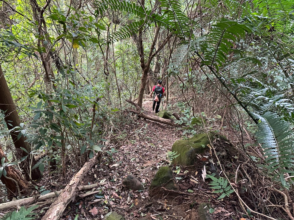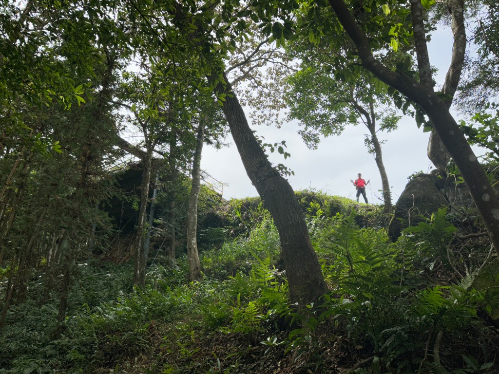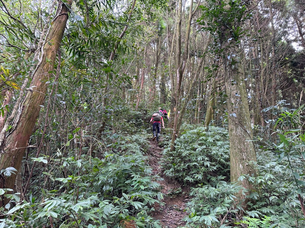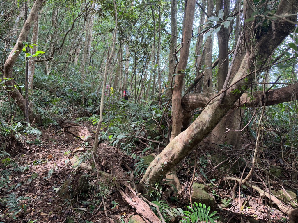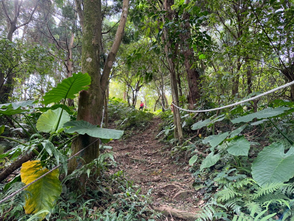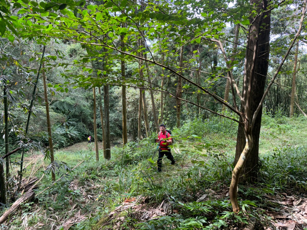 當我們下車與簡大哥互道再見後,看著離線地圖發現,騎龍下山就在路旁,但怎麼找到三角點?原來是要往左側山徑有一塊寫著:「往逃學步道」的方向走,一陡上就往右上走約10m就會抵達騎龍下山!這麼容易?從騎龍下山下走10m後,就接著往右轉入「逃學步道」,沿著逃學步道陡上走約250m就會抵達騎龍山,這已經是我們今天的第8峰了。