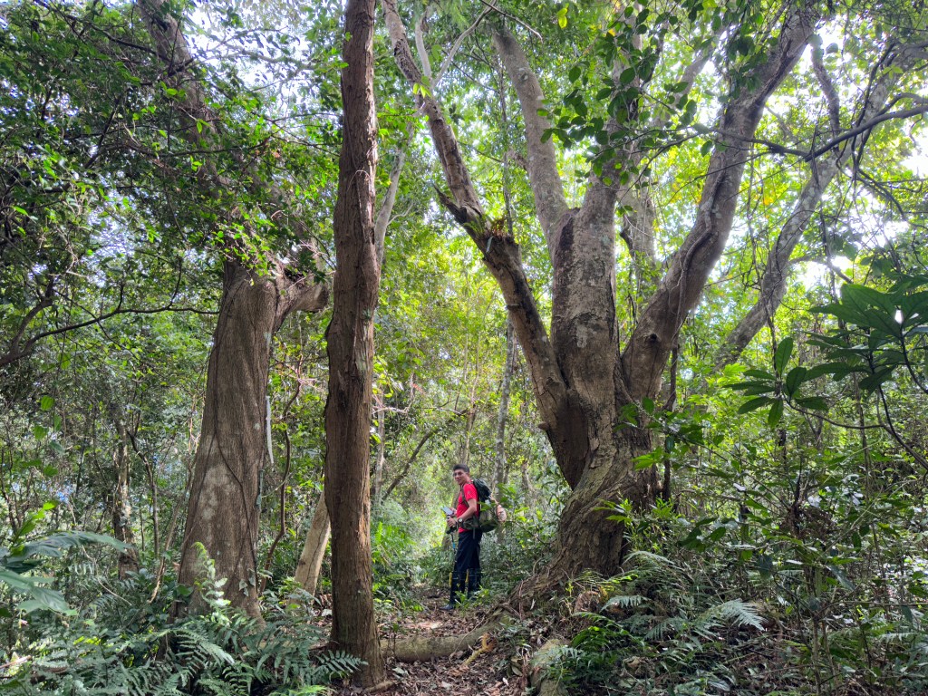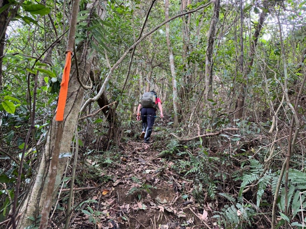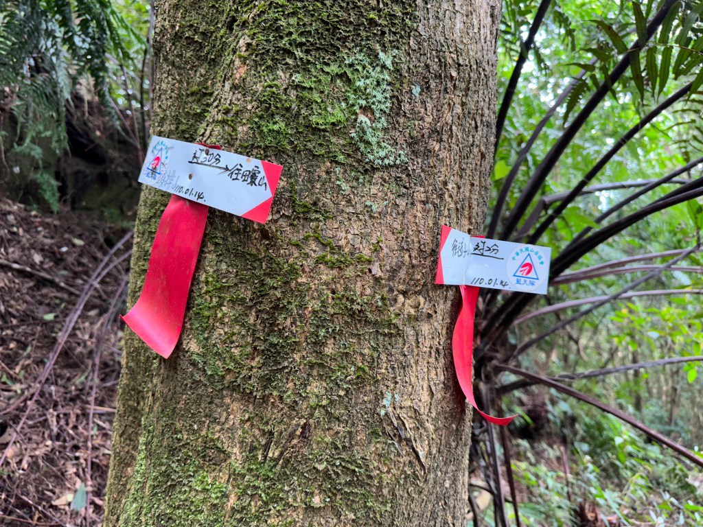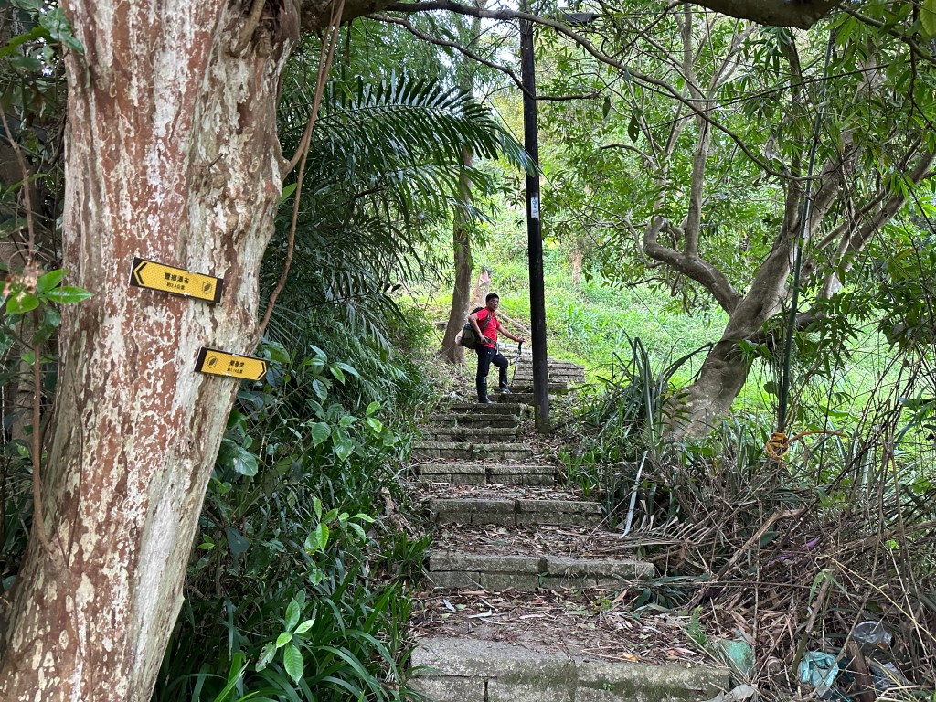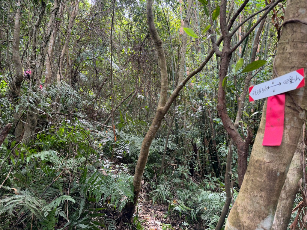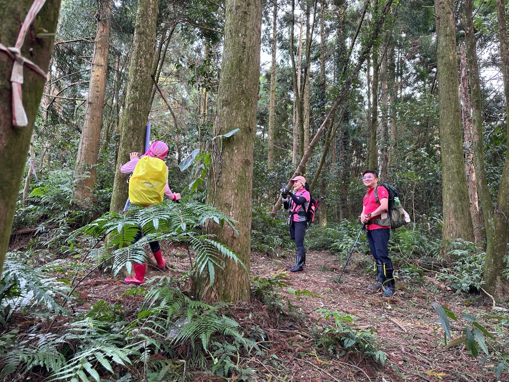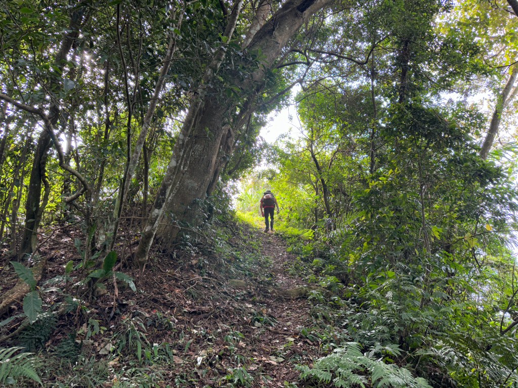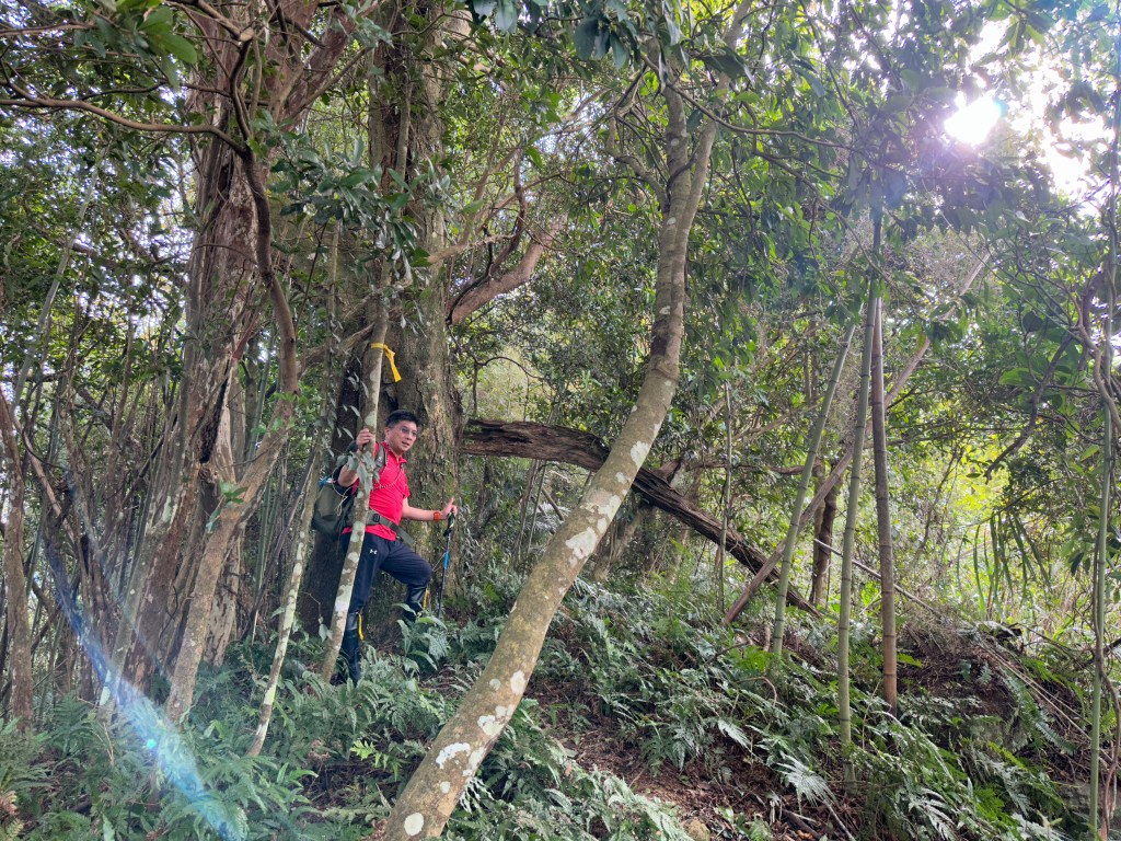 當我們下車與簡大哥互道再見後,看著離線地圖發現,騎龍下山就在路旁,但怎麼找到三角點?原來是要往左側山徑有一塊寫著:「往逃學步道」的方向走,一陡上就往右上走約10m就會抵達騎龍下山!這麼容易?從騎龍下山下走10m後,就接著往右轉入「逃學步道」,沿著逃學步道陡上走約250m就會抵達騎龍山,這已經是我們今天的第8峰了。