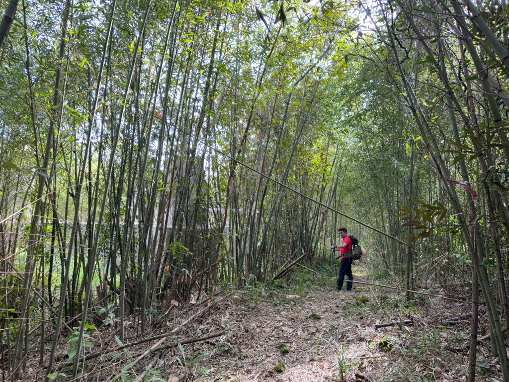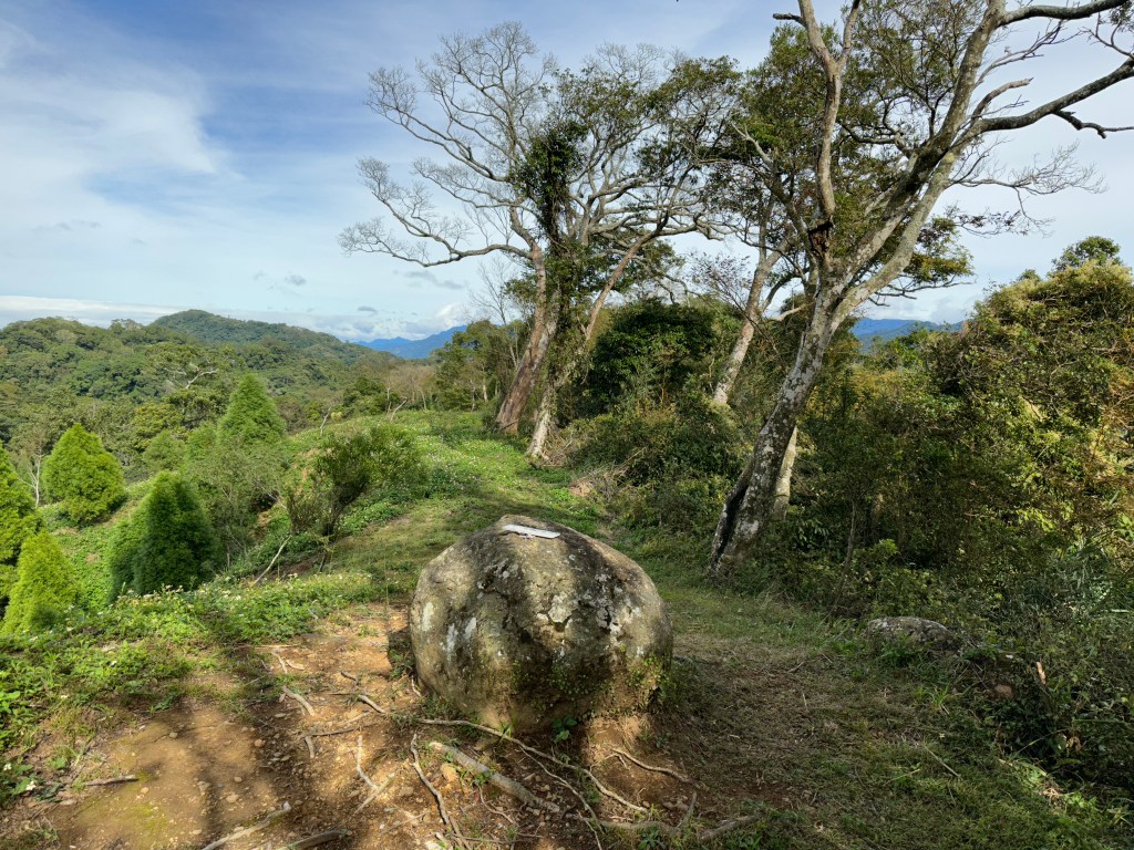 在此開闊山頭旁吃午餐,看著遼闊大景,不知不覺居然在此待了約70分鐘!?接著,往薯園山方向走,一路上的路線都很幽美,邊看著路徑右側的大景,居然就看到一顆石敢當!原來是鎮石山!就是一顆在路徑上圓滾滾的大石!拍完照後,繼續往薯園山走,一路上仍然保有好走的山徑條件,經過竹林後不久就會看到在路徑右側的薯園山。