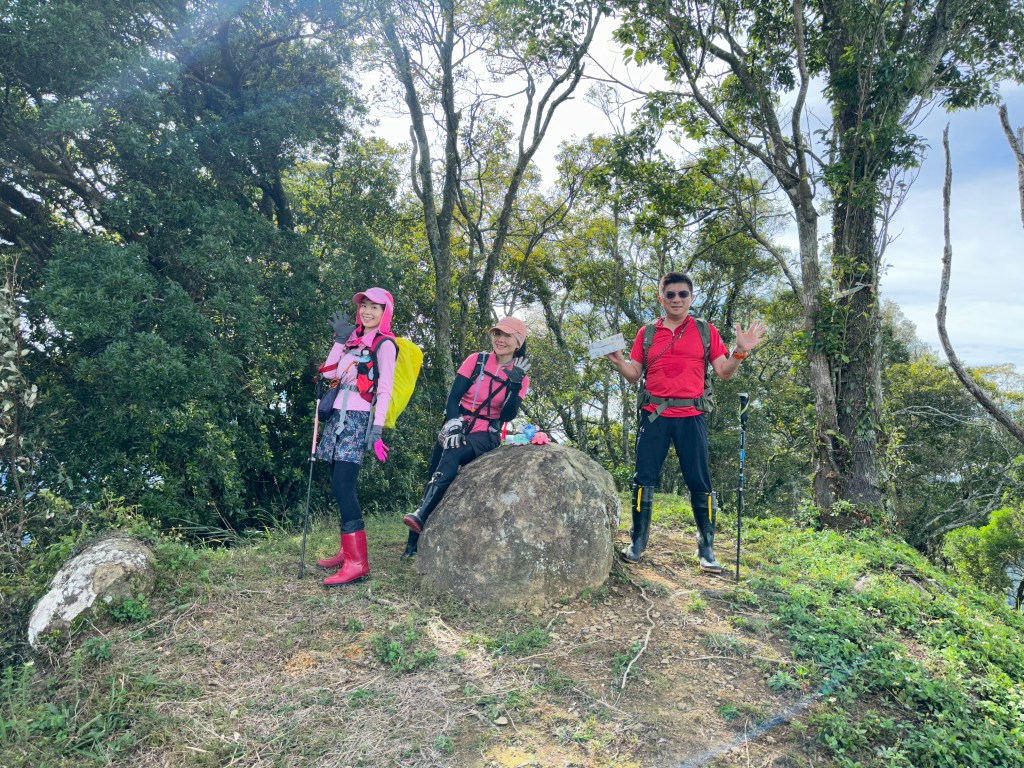 幻燈片:毬子山,今日的第三峰。采庭、妙妙兩位美女,總是在三角點才能看到,其間都走得很快啊!11:31