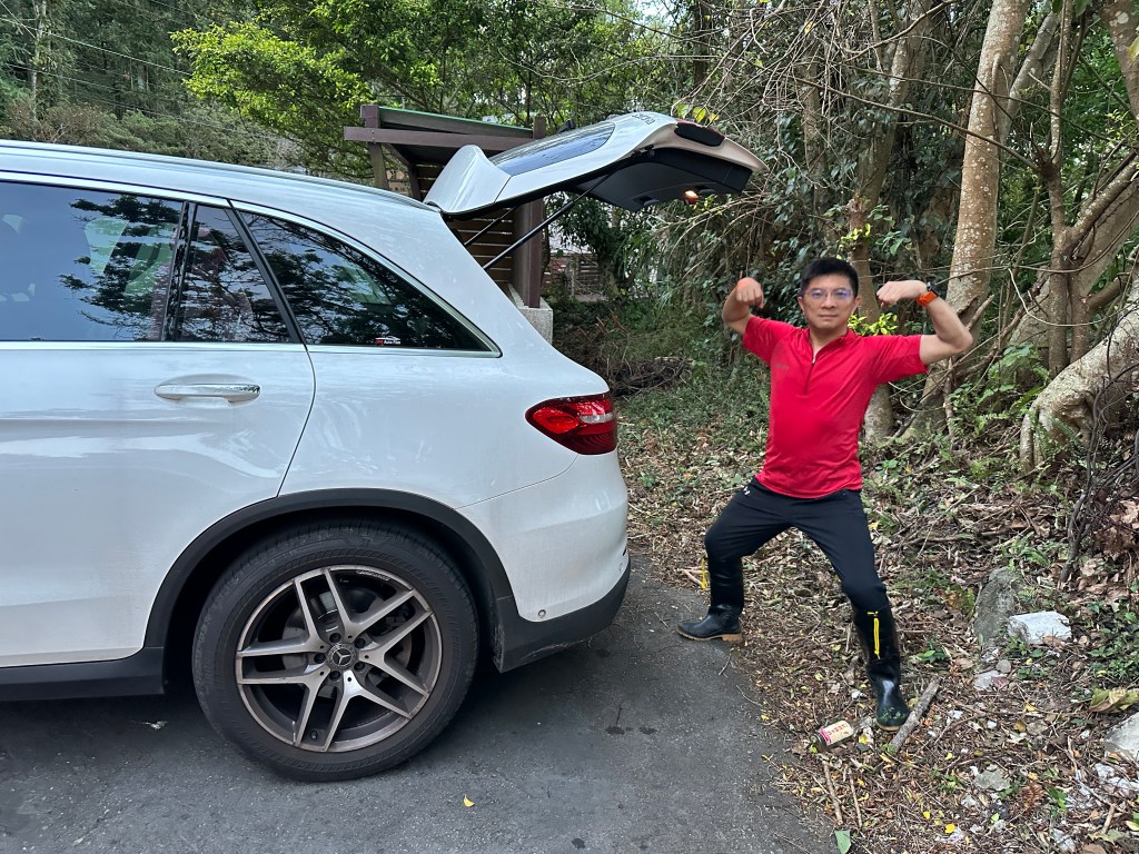 當我們四人正一路隨著產業道路走了約1.2K後,突然發現後方有一台車正在靠近我們,當汽車停止時就發現駕駛人就是簡大哥,開著他的BMW說要載我們過去騎龍下山登山口,齁?實在太令人驚訝了?原來要走約1小時的路程,就這樣用了13分鐘就達成了!真的非常感謝!