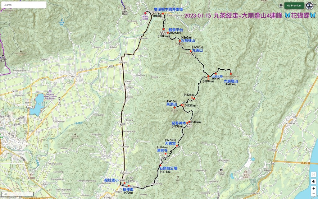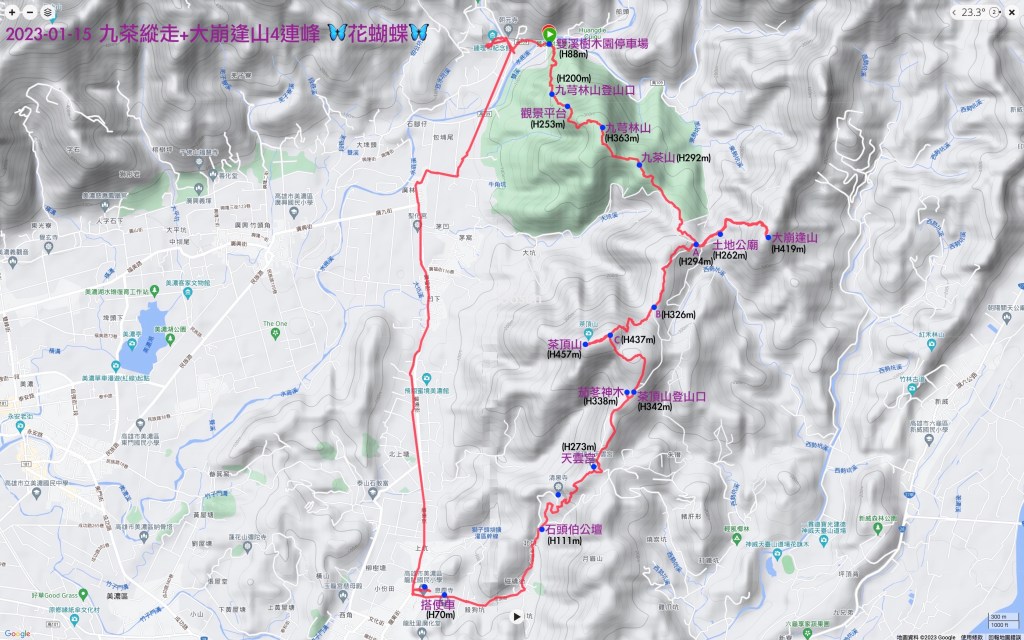 今年(2023)的1月14日冷風過境,預期北台灣必然下雨,但南部天氣仍好,立即揮兵南下,配合Smile兩腳仍在復健中,選一條不要太長的路來走,Smile選擇了九茶縱走。