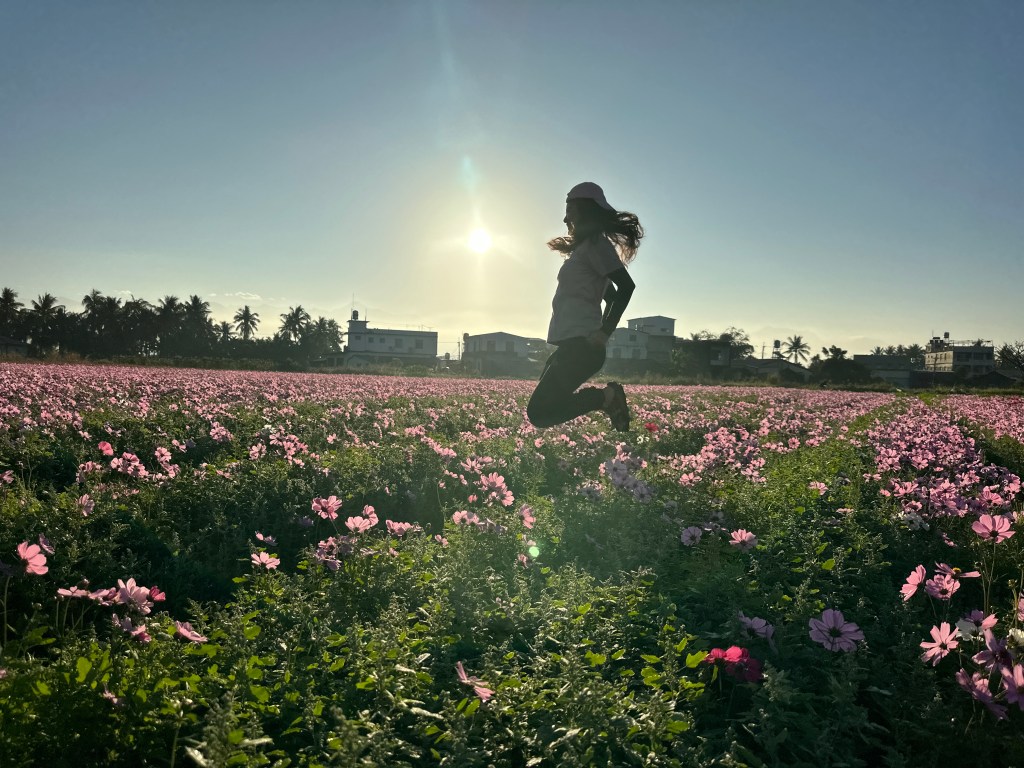 上圖:跳躍的楊咩咩與大波斯菊花。