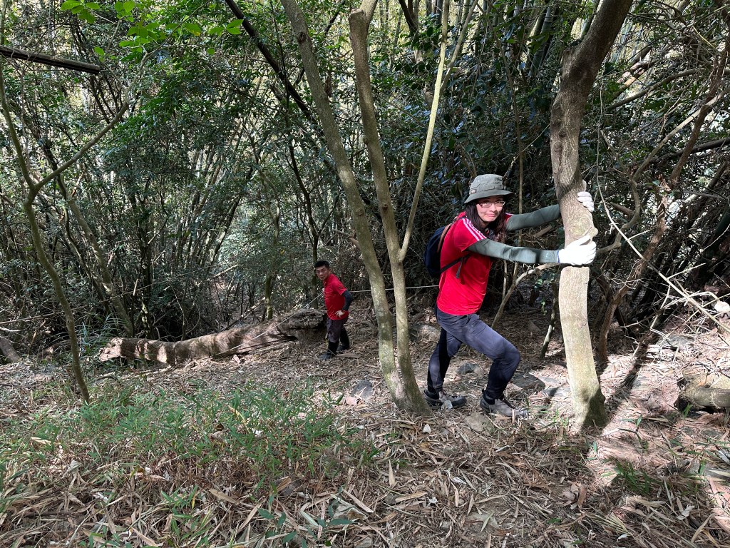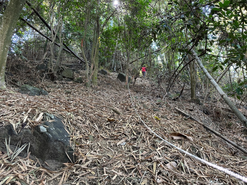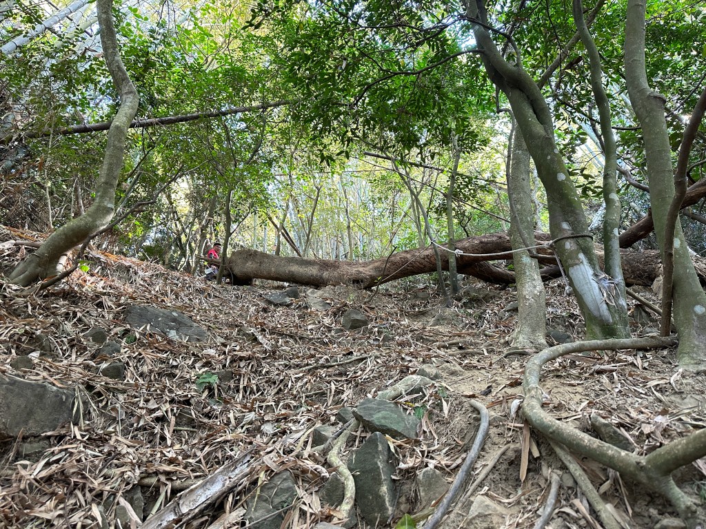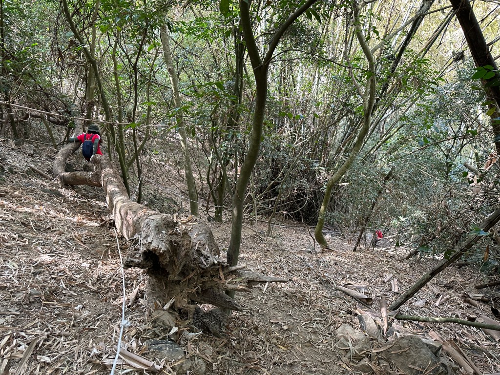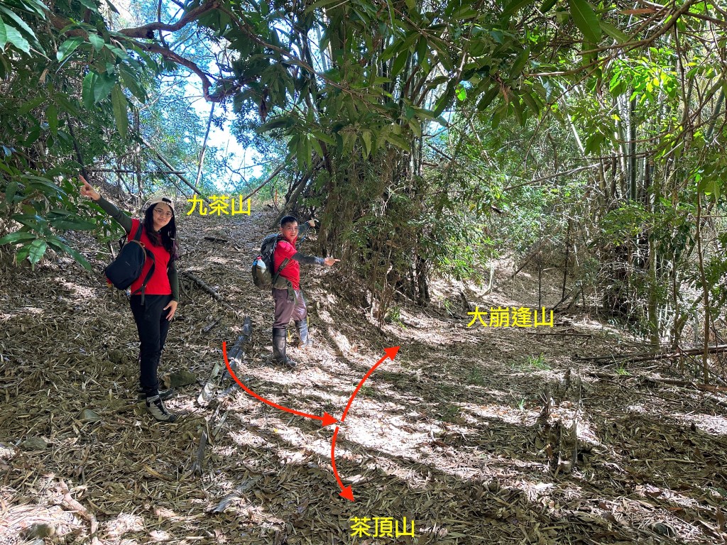 由九茶山開始走往大崩逢山,一離開九茶山,接著的步道都是走在寬大林道上,偶爾有倒木、黃藤、竹林,但都不影響到行走的過程,1.1 K後來到了三叉路口,就是等高線圖上的A 點 ,往左就去大崩逢山,往右就直接往茶頂山方向,我們先往左走,去大崩逢山,單趟要1 K,來回要2K;都是林道的路線,超好走!最後要登頂前200M路徑直接轉極陡,要直接陡上60M的高度,有八段的拉繩走在細砂陡滑的路徑,即可抵達腹地頗大的大崩逢山。