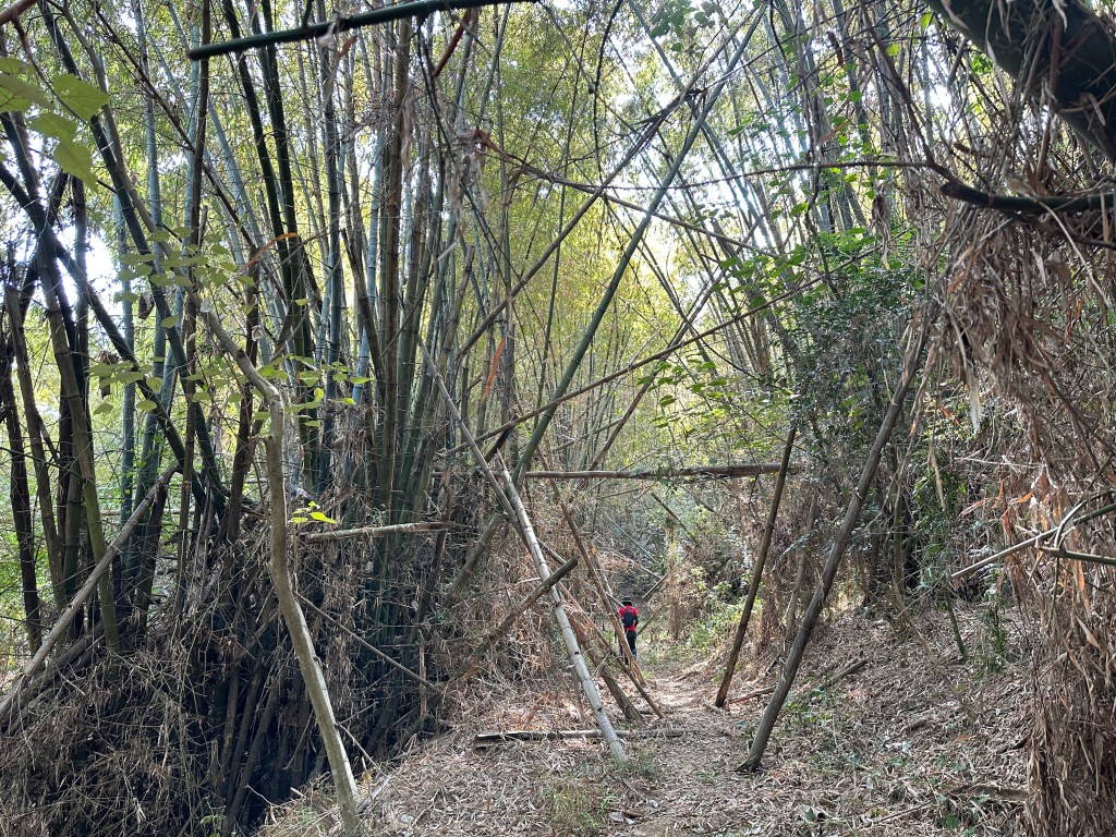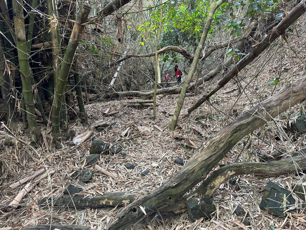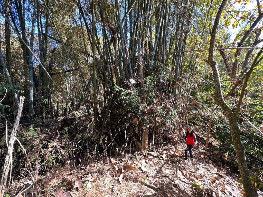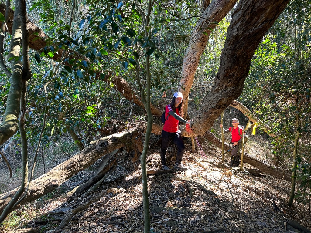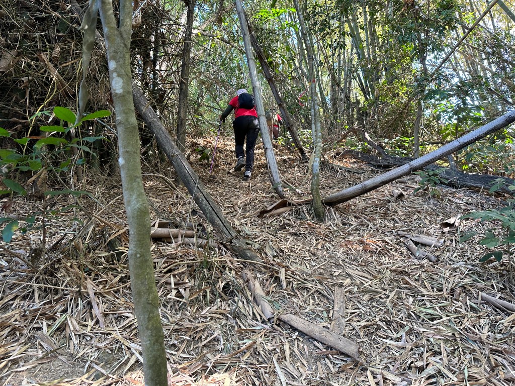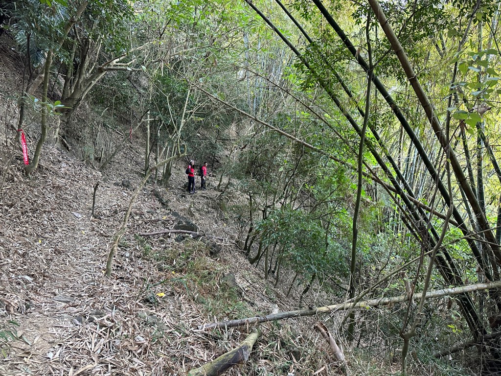 由九茶山開始走往大崩逢山,一離開九茶山,接著的步道都是走在寬大林道上,偶爾有倒木、黃藤、竹林,但都不影響到行走的過程,1.1 K後來到了三叉路口,就是等高線圖上的A 點 ,往左就去大崩逢山,往右就直接往茶頂山方向,我們先往左走,去大崩逢山,單趟要1 K,來回要2K;都是林道的路線,超好走!最後要登頂前200M路徑直接轉極陡,要直接陡上60M的高度,有八段的拉繩走在細砂陡滑的路徑,即可抵達腹地頗大的大崩逢山。
