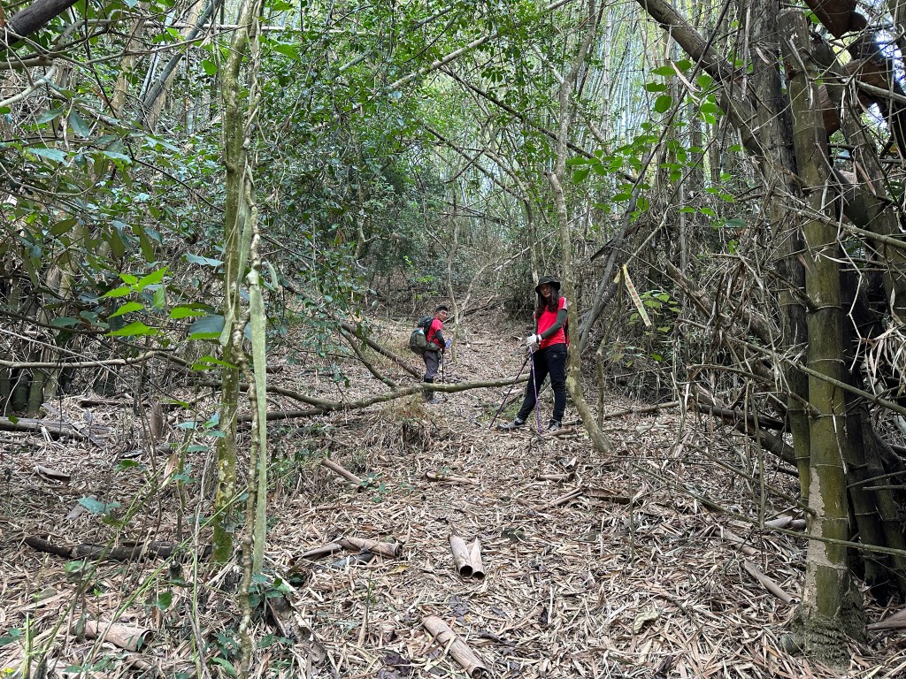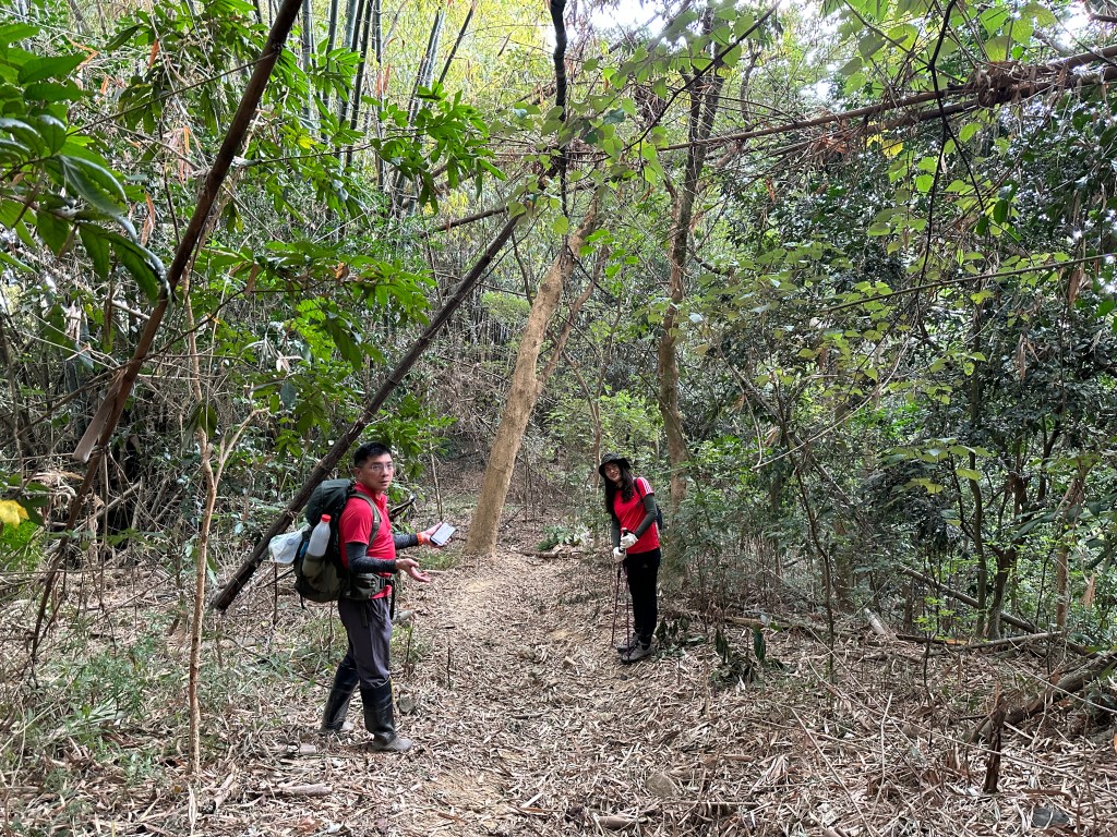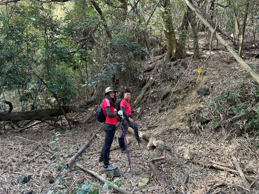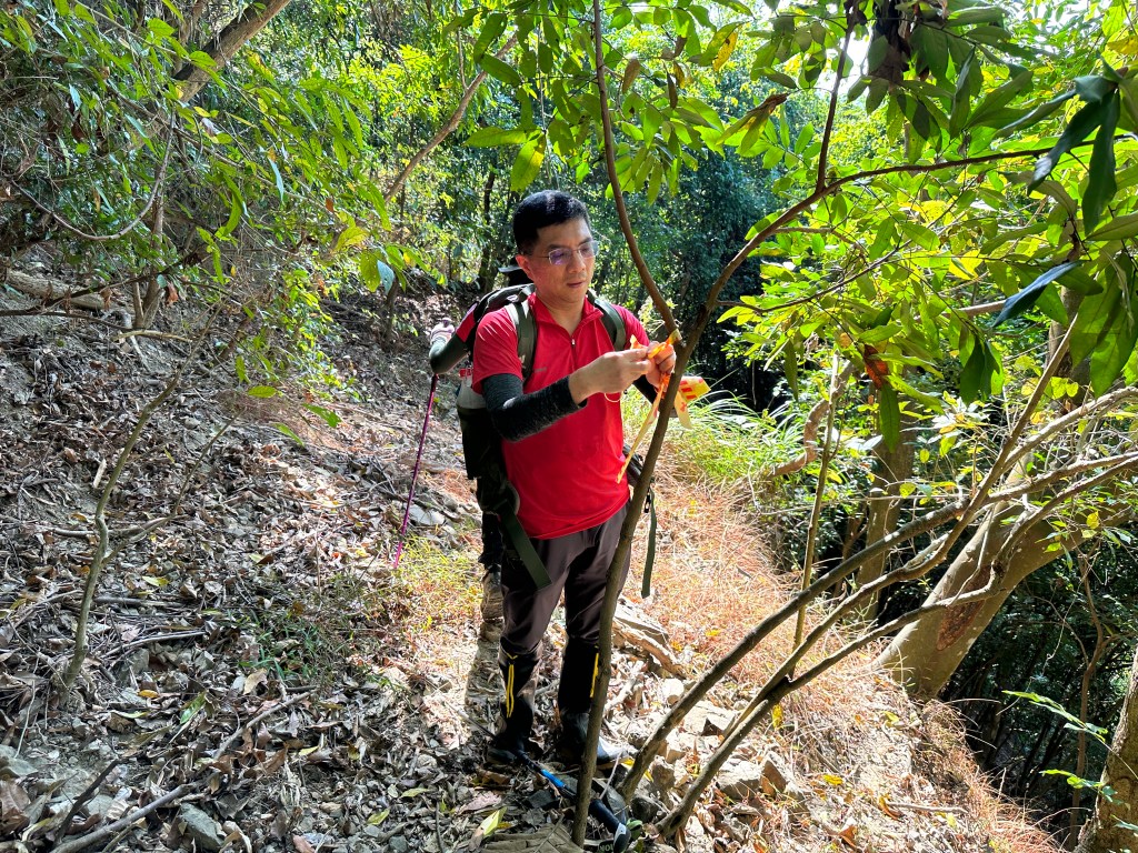 08:32 雙溪樹木園停車場🅿️ (總里程0.0K) 09:04 九芎林山登山口 (總里程0.7K) 09:17-09:22 觀景平台 (總里程1.0K) 09:42-09:53 九芎林山 (總里程1.7K) ——穿越陡峭邊坡黃藤瘦稜 —— 10:50-10:57 九茶山 (總里程2.4K) 11:31-11:36 三岔路口(等高線圖A 點) (總里程3.5K) 11:42 土地公廟 (總里程3.7K) 12:15-12:26 大崩逢山 (總里程4.5K) ——沿著這一段路線補充登山布條 —— 13:07 土地公廟 (總里程5.3K) 13:12 三岔路口(等高線圖A 點) (總里程5.5K) 13:32 三岔路口/水流東伯公 (等高線圖B 點) (總里程6.5K) 13:56 三岔路口(等高線圖C 點) (總里程7.3K) 14:02-14:37 茶頂山(午餐 ) (總里程7.6K) 14:41 三岔路口(等高線圖C 點) (總里程7.9K) 14:56 茶頂山登山口 (總里程8.7K) 14:59-15:03 茄苳神木 (總里程8.8K) 15:13 天雲宮 (總里程9.8K) ——桃花心木步道 —— 15:39 石頭伯公壇 (總里程11.2K) 16:04 龍肚國小前200m搭便車 (總里程12.6K) . ——搭便車,距離為7.0K —— 16:42 雙溪樹木園停車場🅿️ (總里程19.6K)
