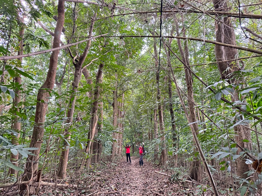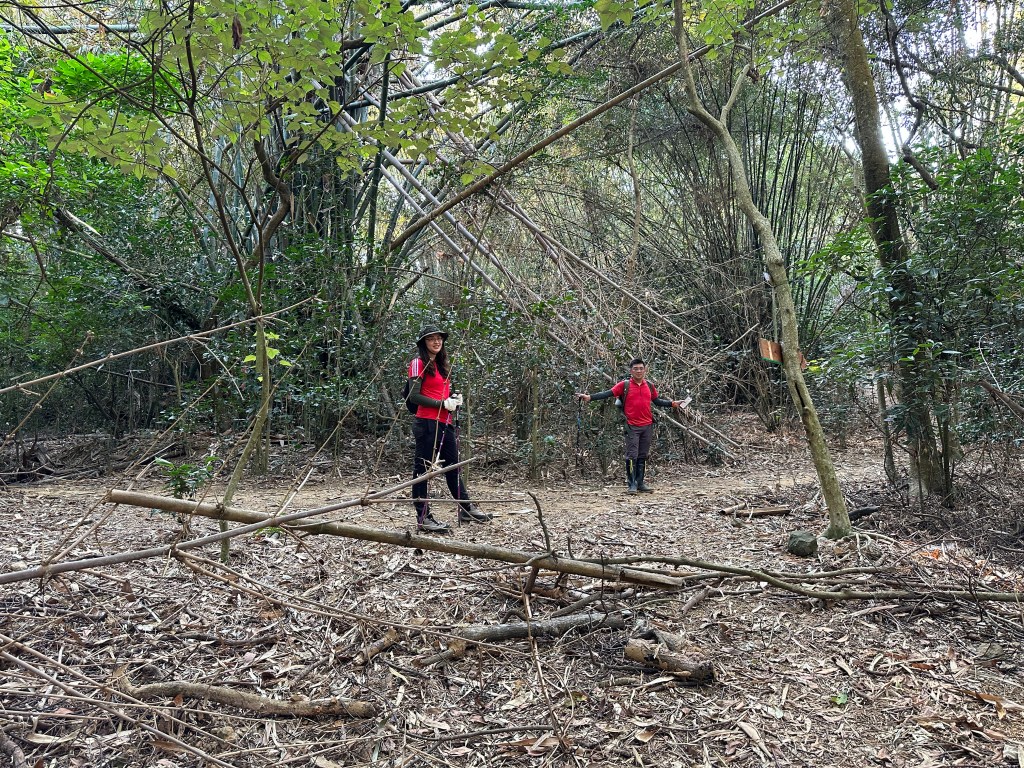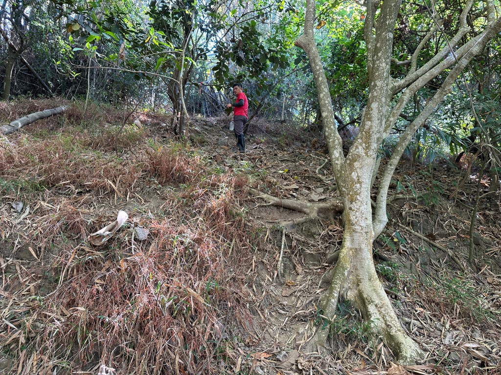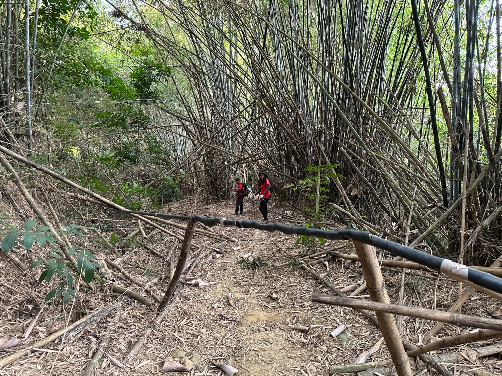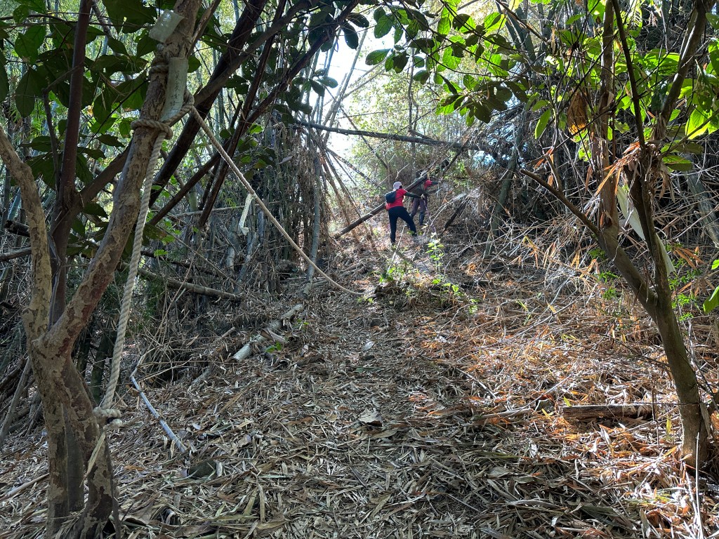 08:32 雙溪樹木園停車場🅿️ (總里程0.0K) 09:04 九芎林山登山口 (總里程0.7K) 09:17-09:22 觀景平台 (總里程1.0K) 09:42-09:53 九芎林山 (總里程1.7K) ——穿越陡峭邊坡黃藤瘦稜 —— 10:50-10:57 九茶山 (總里程2.4K) 11:31-11:36 三岔路口(等高線圖A 點) (總里程3.5K) 11:42 土地公廟 (總里程3.7K) 12:15-12:26 大崩逢山 (總里程4.5K) ——沿著這一段路線補充登山布條 —— 13:07 土地公廟 (總里程5.3K) 13:12 三岔路口(等高線圖A 點) (總里程5.5K) 13:32 三岔路口/水流東伯公 (等高線圖B 點) (總里程6.5K) 13:56 三岔路口(等高線圖C 點) (總里程7.3K) 14:02-14:37 茶頂山(午餐 ) (總里程7.6K) 14:41 三岔路口(等高線圖C 點) (總里程7.9K) 14:56 茶頂山登山口 (總里程8.7K) 14:59-15:03 茄苳神木 (總里程8.8K) 15:13 天雲宮 (總里程9.8K) ——桃花心木步道 —— 15:39 石頭伯公壇 (總里程11.2K) 16:04 龍肚國小前200m搭便車 (總里程12.6K) . ——搭便車,距離為7.0K —— 16:42 雙溪樹木園停車場🅿️ (總里程19.6K)