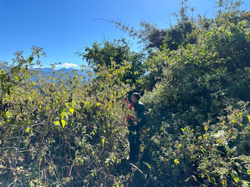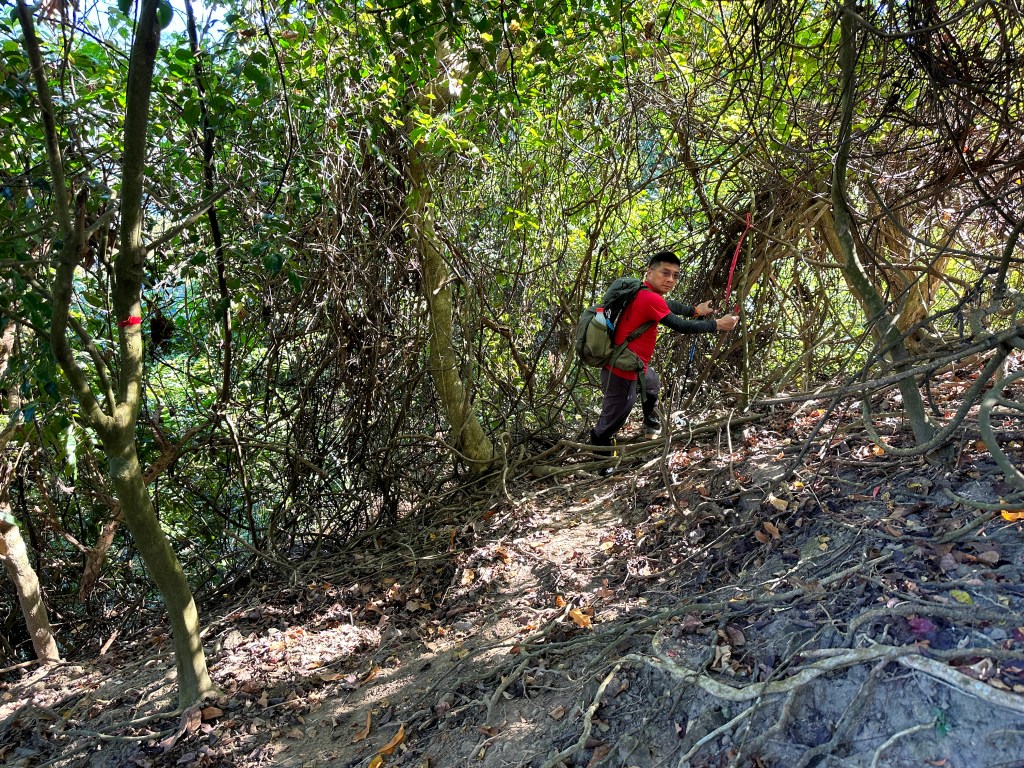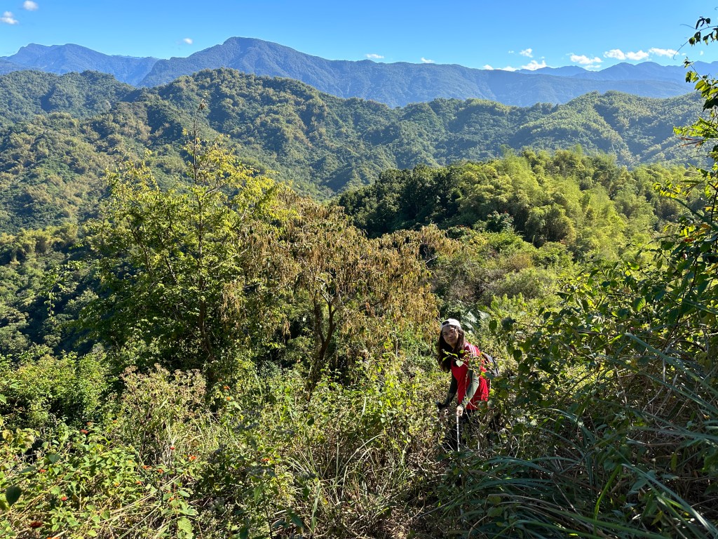 繼續往第二峰九茶山走,距離為700m,剛開始很好走,隨著高度越來越高,上了稜線後的路徑非常崎嶇,左側是極陡的邊坡,稜線上有一大堆的灌木叢也長滿了一大堆的樹藤,也夾了不少的刺藤。還好,陡滑處都有架上繩索,偶爾也會出現展望,還可以看到遠處的北大武、南大武以及霧頭山,還有不時在遠處探一點小頭的卑南主山。雖不好走,但有展望,聊以慰心,辛苦的抵達九茶山,到目前為止,萬里無雲,氣溫25 ℃。