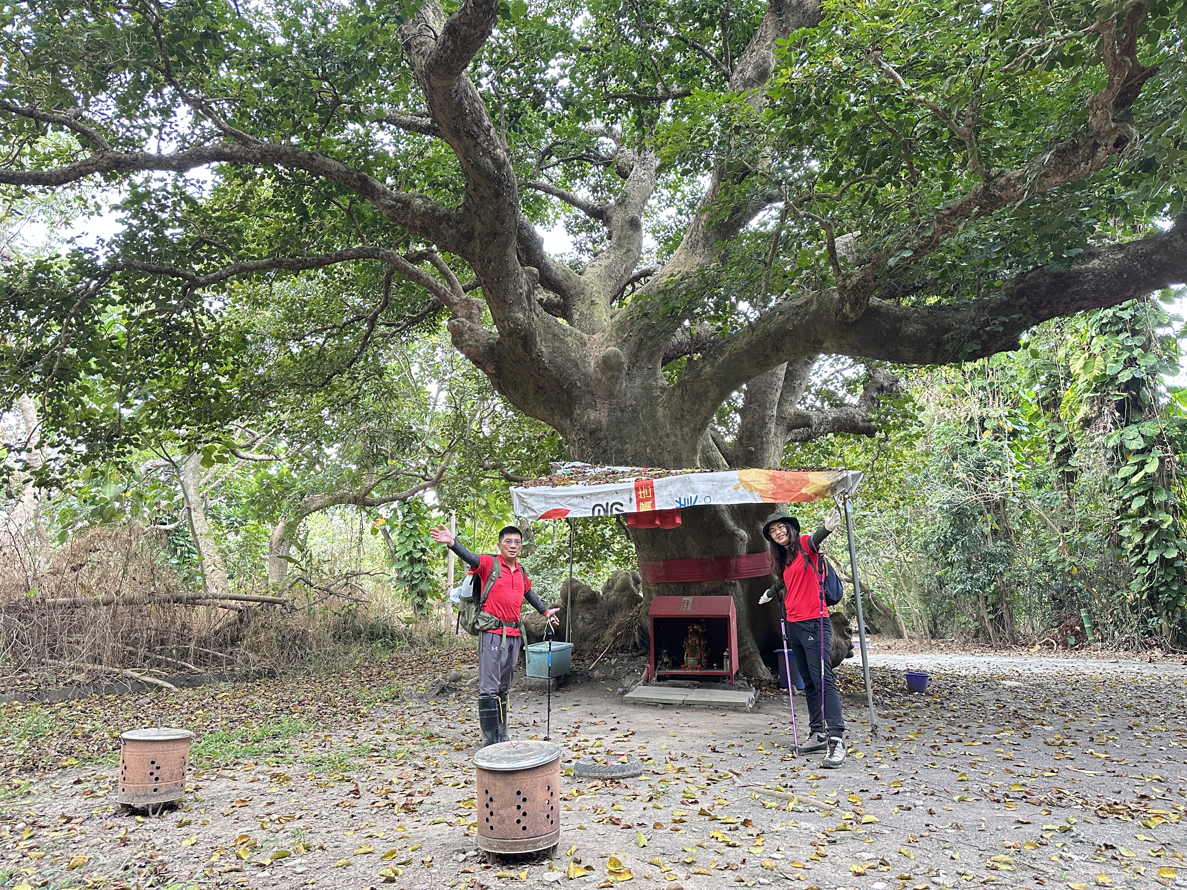 下山,先走0.3K+0.8K到O型岔路口,接上水泥產業道路,也就是等高線圖上的C 點 ,這裡就是茶頂山登山口。往前再走100M,右轉進入50M的距離就抵茄苳神木!三人狂拍一陣,接著一路沿著產業道路而下,1K後來到天雲宮,接著走0.8K的桃花心木步道來到清泉寺,再0.6K到石頭伯公壇。再走1.6K到龍肚國小接上高109線道路,其實還要6.8K的距離踢馬路走回雙溪樹木園。