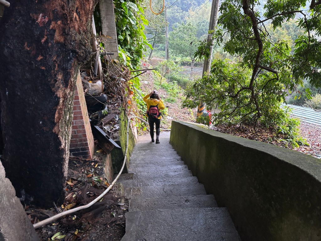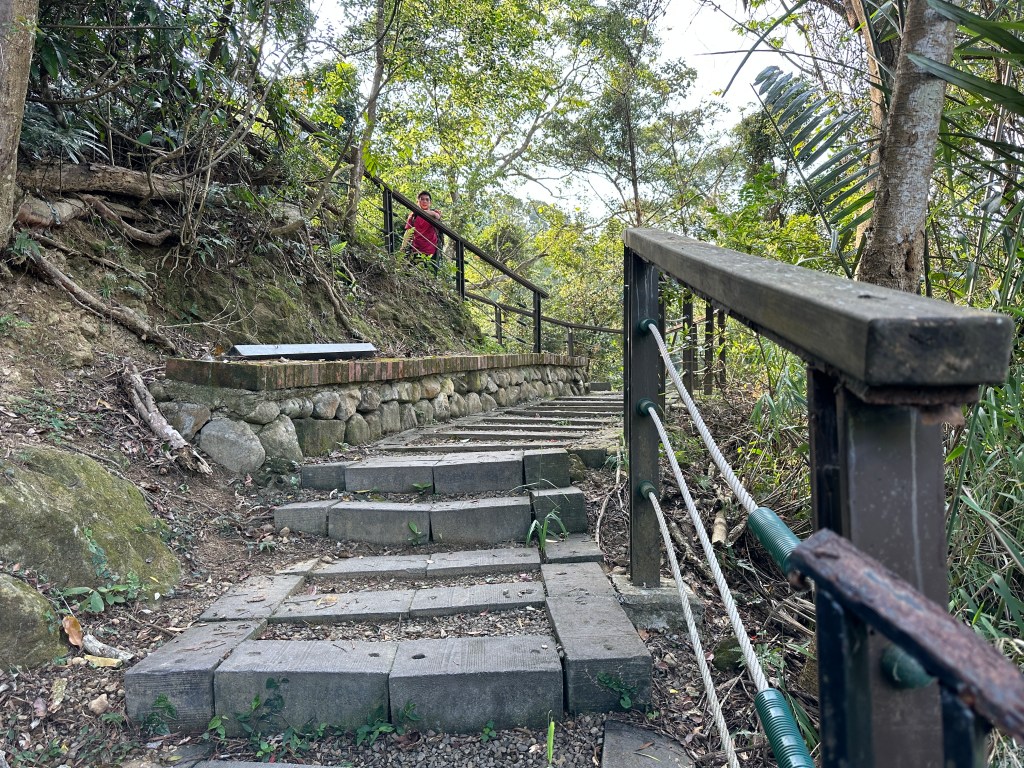 接下來,由藤坪古道觀景台左岔下長長的階梯,下到親子亭接上六寮古道,地圖上顯示往前走100m有一階梯路,可以陡上100m的距離接上獅山古道,但,實際上這一個階梯路已經不存在!因此,改為繼續再往前走100m,左轉,接上萬佛庵步道,此時楊咩咩表示想去看看水濂洞,因此,我們三人分道揚鑣,Smile與我(Gosen)繼續往萬佛庵步道走,在145m的距離裡由海拔H178m直上到H212m並接上獅山古道。