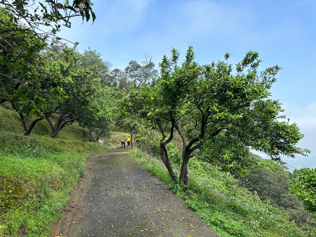 今天,我們倒過來走,龍頂山→獅頭山→猿山,先走比較有不確定狀態的龍頂山,我們將車停在獅山遊客中心停車場,由龍頂山的東登山口進入,最後登頂前的100m是果園的高點盡頭,但此時看不到明確的路徑路跡,只好根據離線地圖的既有軌跡,硬是上攻穿梭在植披刺藤很厚的路徑,上到龍頂山三角點後轉由西登山口出,這一段500m距離的陡下過程,可以大大感受到被山友們的整理,路徑變得清楚很多且沿路有布條指引,超級感謝!