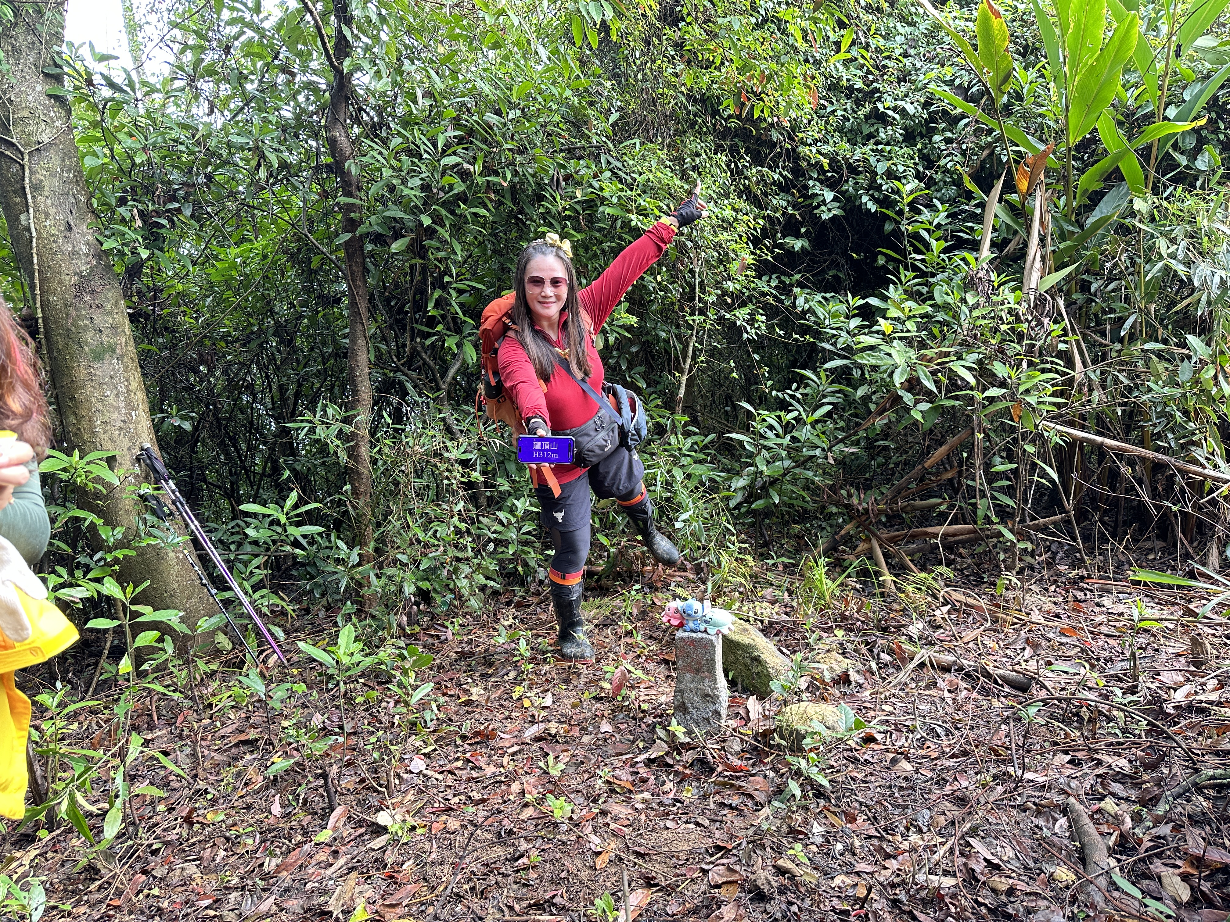 出龍頂山後沿著產業道路往元光寺的方向陡上,抵達在望月亭旁的獅頭山小吃店,接著走500m抵獅頭山,這中途,Smile突然腳抽筋,且一直上氣不接下氣,就因為近三週天氣一直不佳沒有安排登山,一下子要陡上陡下其實是很具壓力的,由獅頭山回到望月亭,三人就在此休息午餐並給Smile休喘一下!