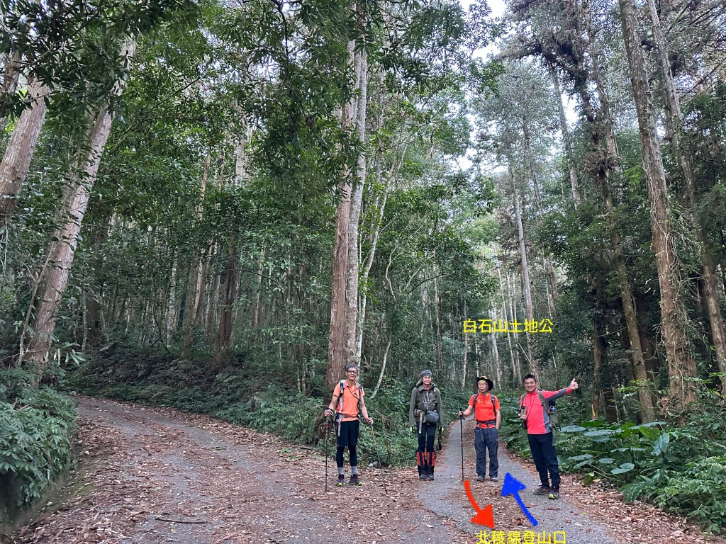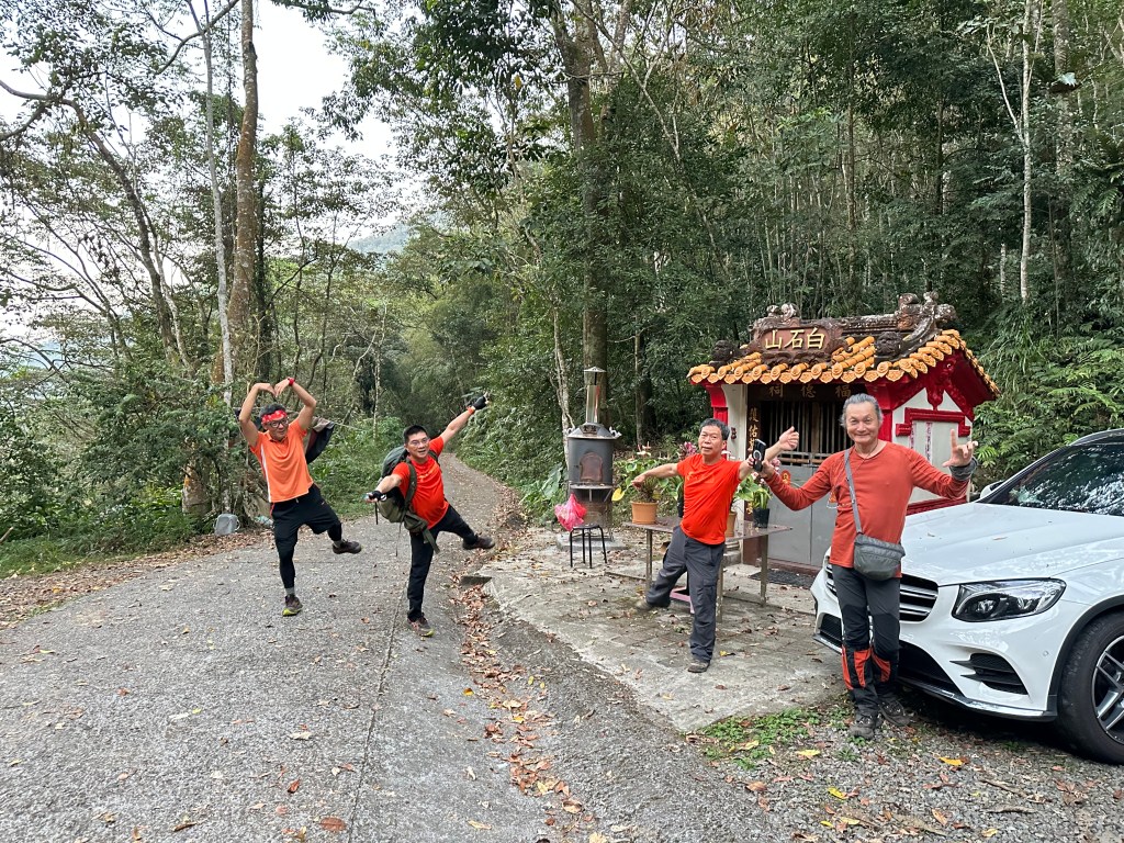 我們是自行開車,因為是走O型,會建議將汽車停在北稜線登山口(直接點按即可進入Google導航地圖)就好,此登山口位置在白石山土地公產業道路上。我們是將汽車停到更深入的白石山土地公,但由北稜線登山口開入到白石山土地公還需要2.6K的距離,且路徑狹小不容易會車,因此會建議不要開入。
