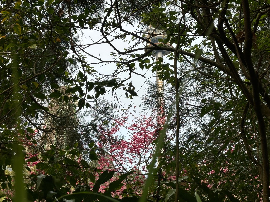 產業道路的左側是九族文化村的圍牆,一路上看到簇踴粉嫩的櫻花,當發現九族文化村的大怒神(實際名稱是UFO自由落體!哈哈,稱為大怒神好像比較好記!)出現在眼簾時,也就表示北稜線登山口到了!