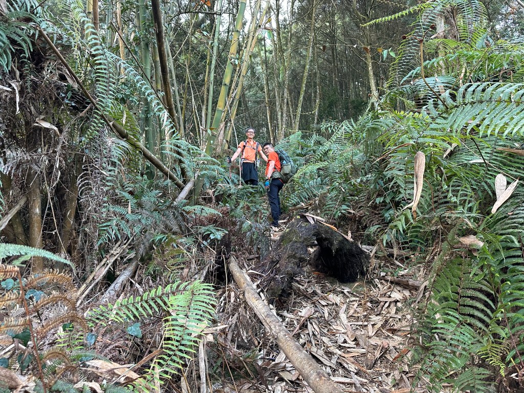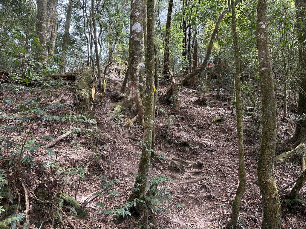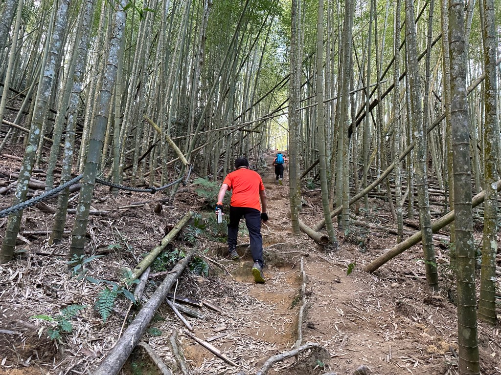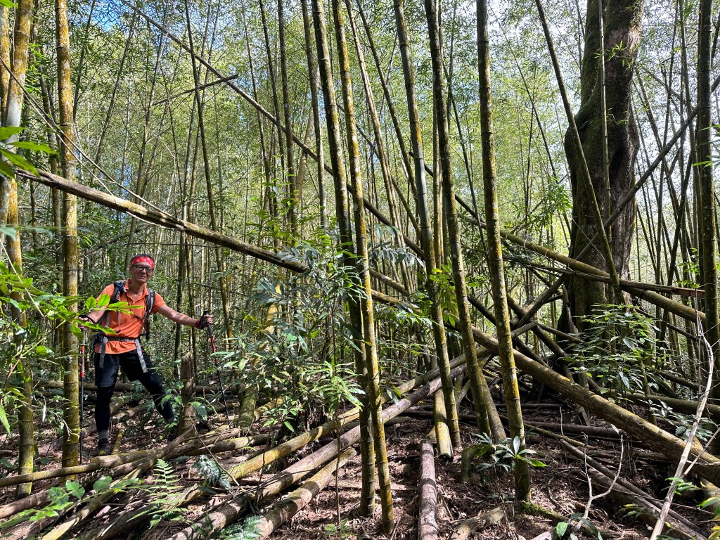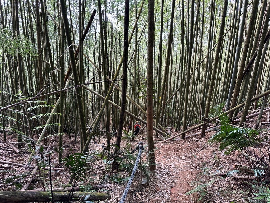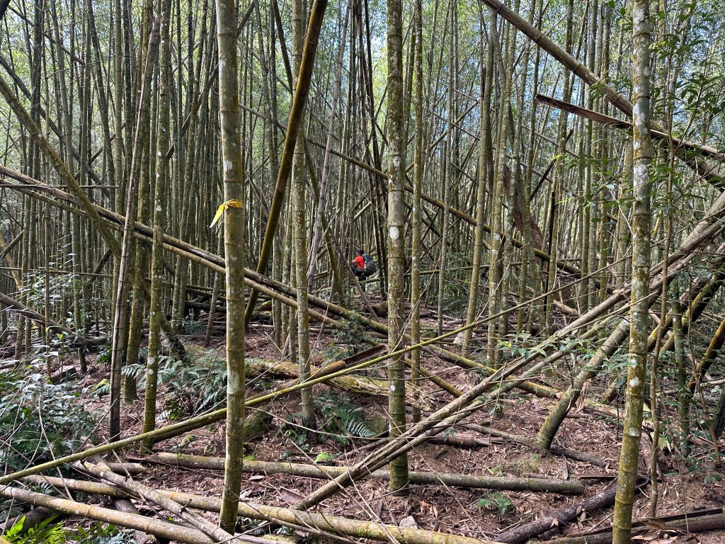 過了頂城山岔後,路徑轉為緩上但開始出現一些倒竹,超過海拔H1460m後,密集的倒竹區出現,整個稜線呈現的是寬稜,再加上登山布條不多,這一段容易偏離路徑,下載離線地圖來對照比較保險。一直到海拔H1520m才脫離倒竹區,接著又一路超陡的陡上。