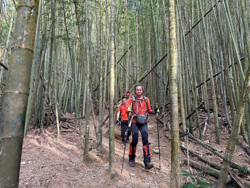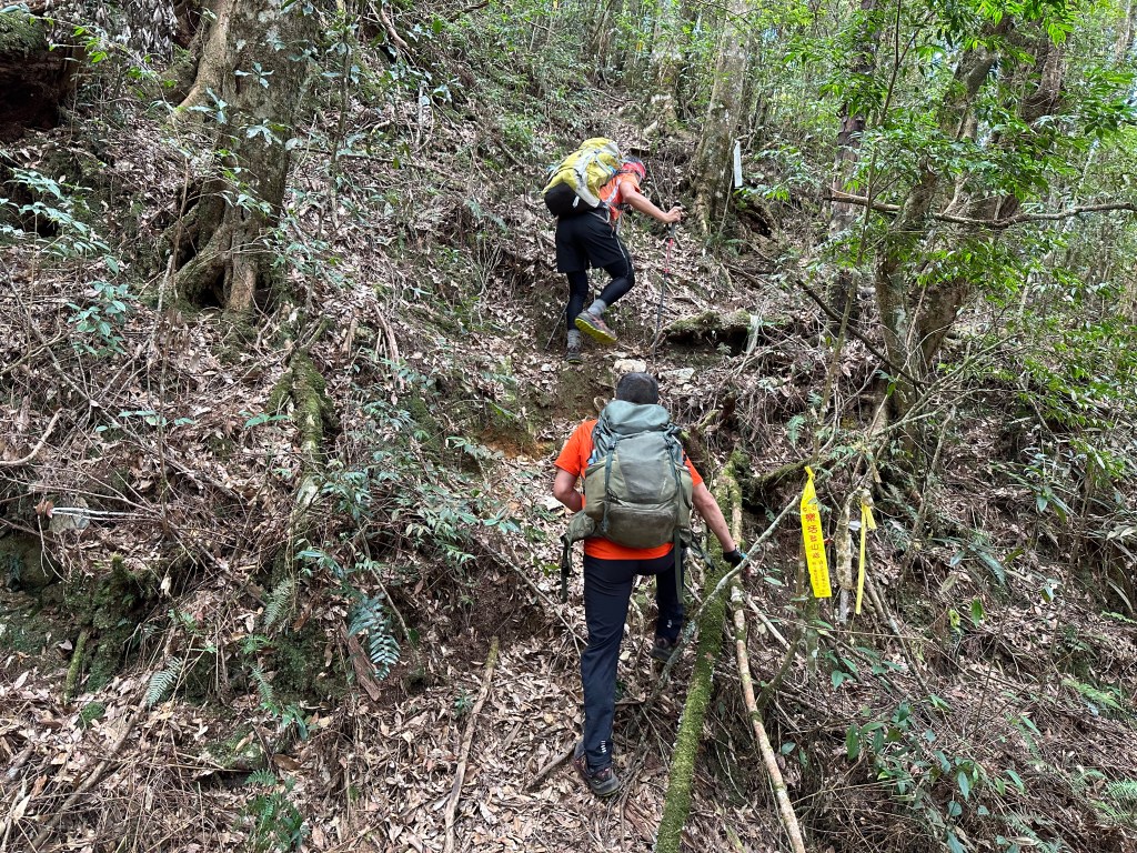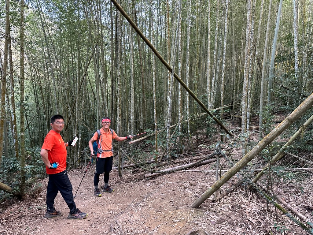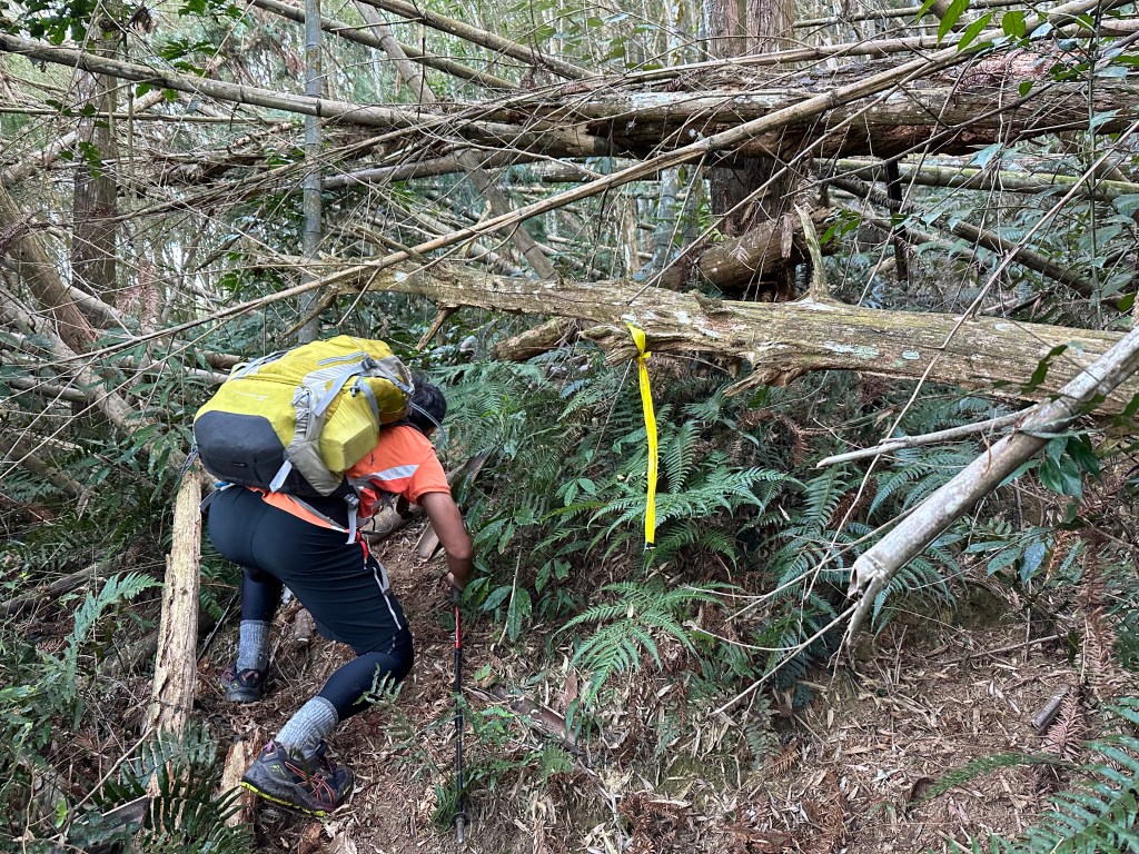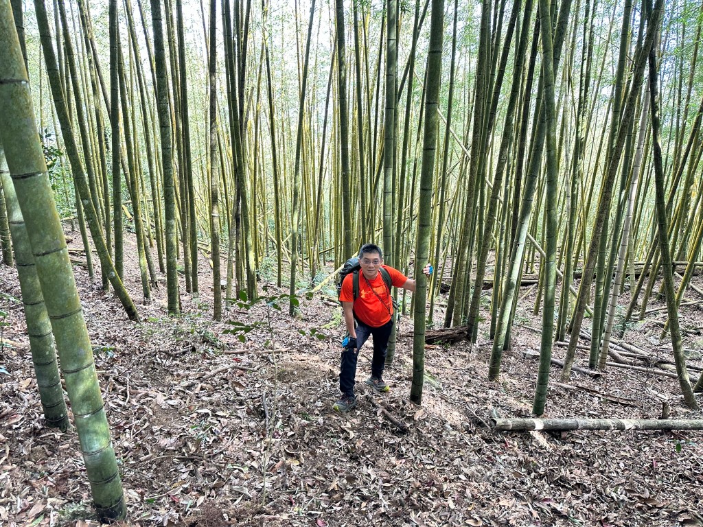 過了頂城山岔後,路徑轉為緩上但開始出現一些倒竹,超過海拔H1460m後,密集的倒竹區出現,整個稜線呈現的是寬稜,再加上登山布條不多,這一段容易偏離路徑,下載離線地圖來對照比較保險。一直到海拔H1520m才脫離倒竹區,接著又一路超陡的陡上。