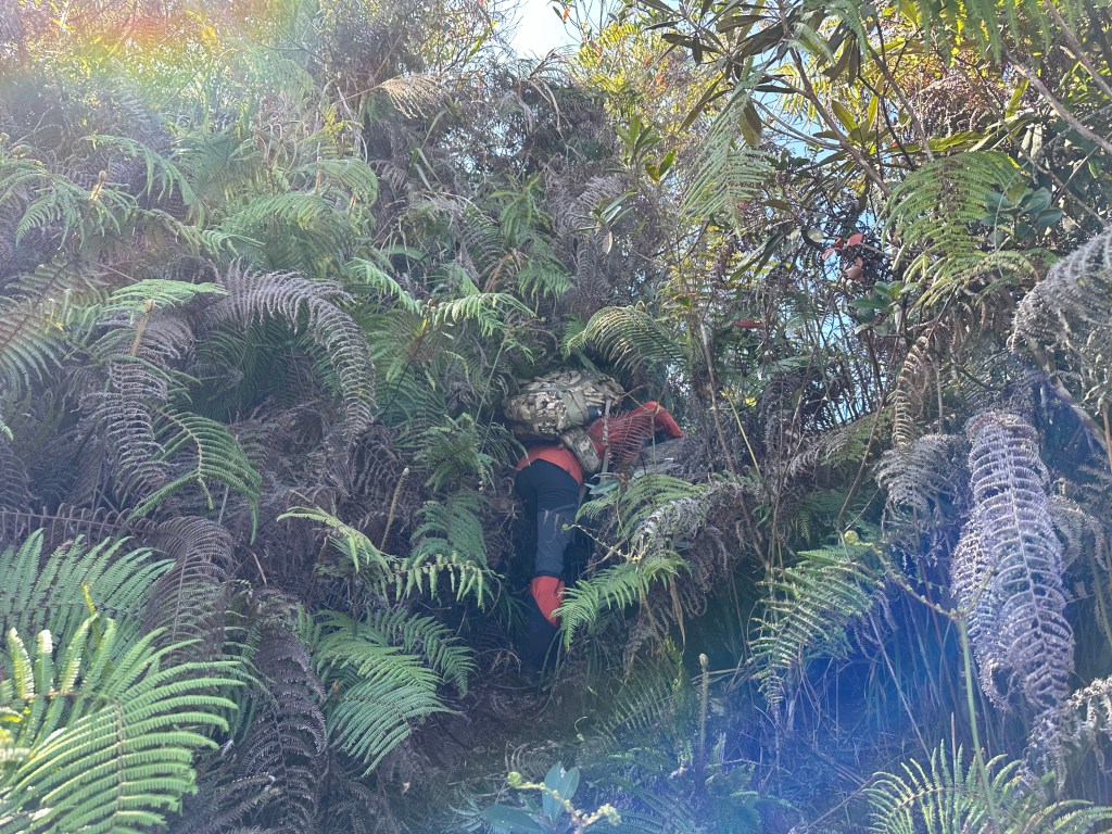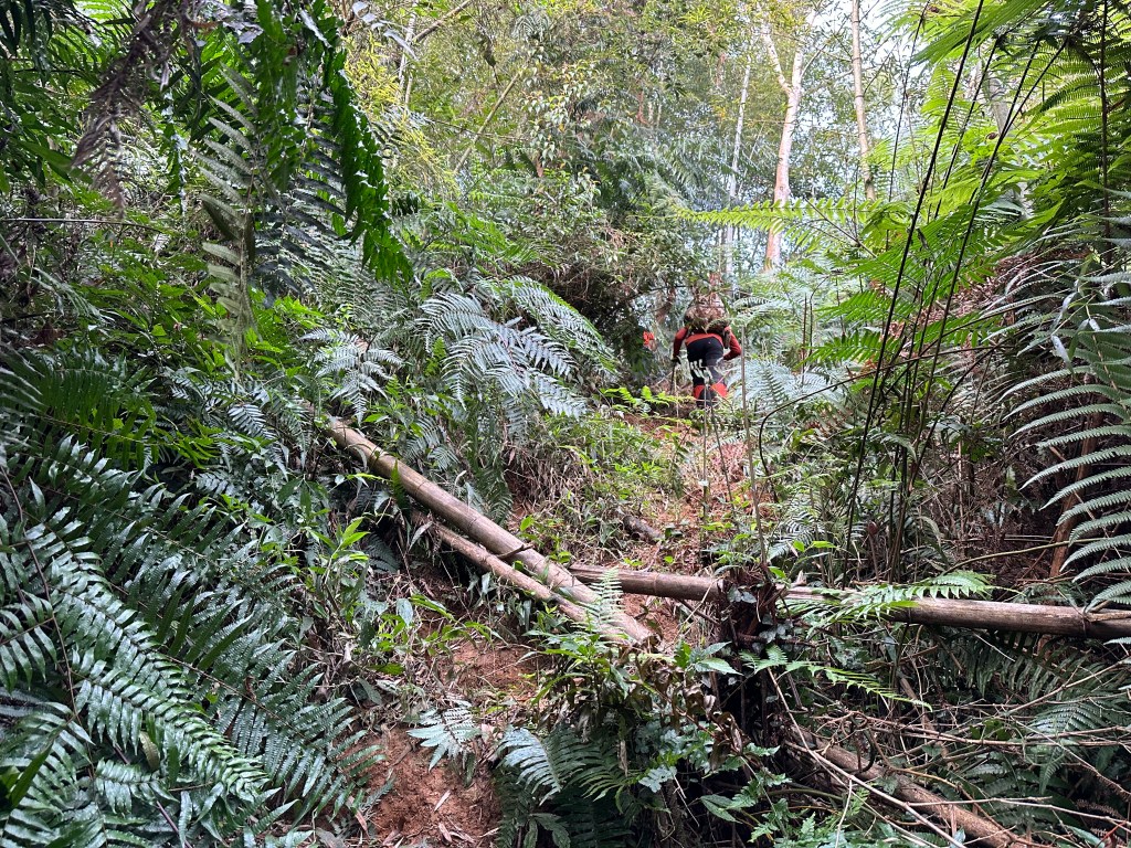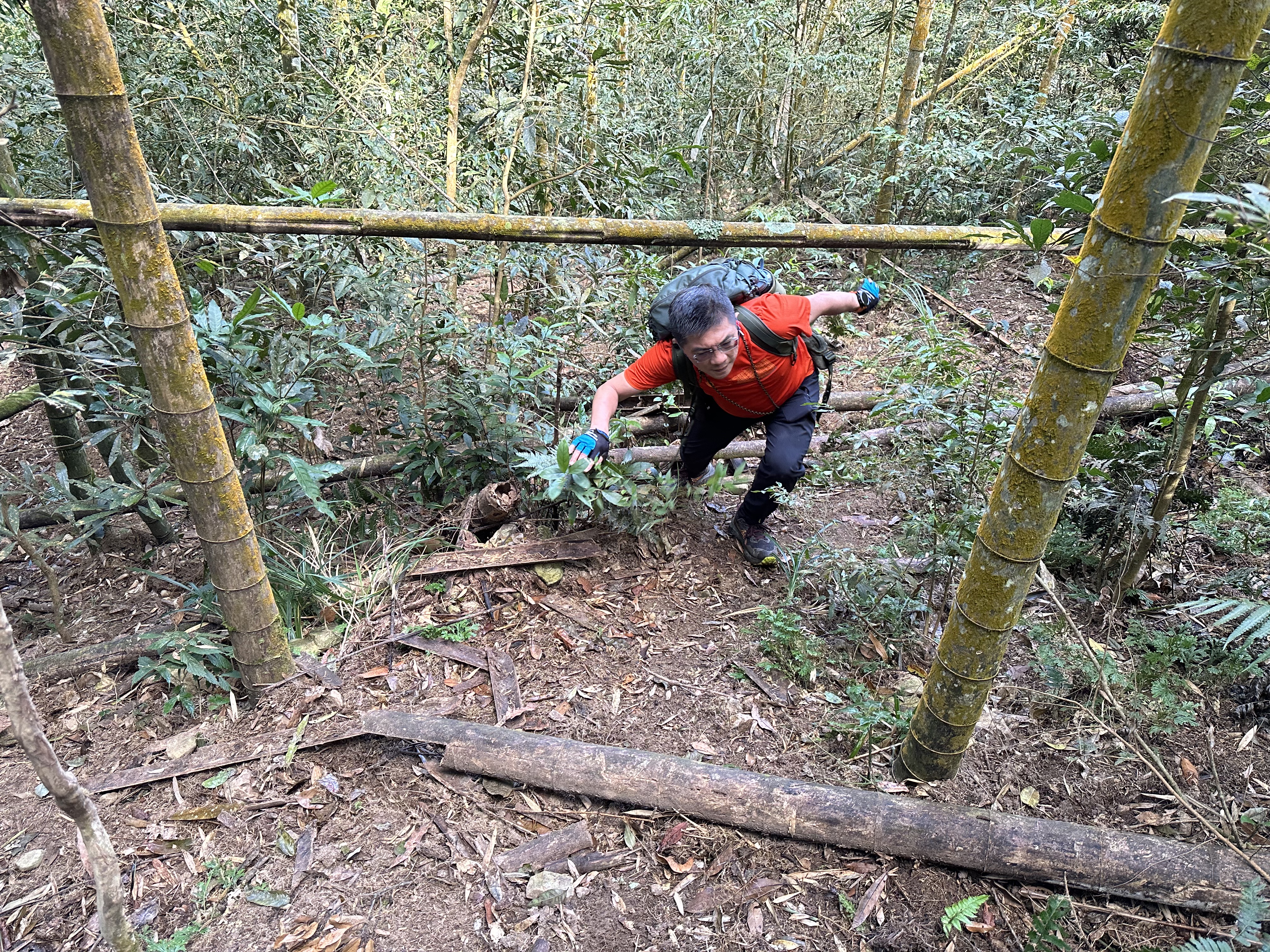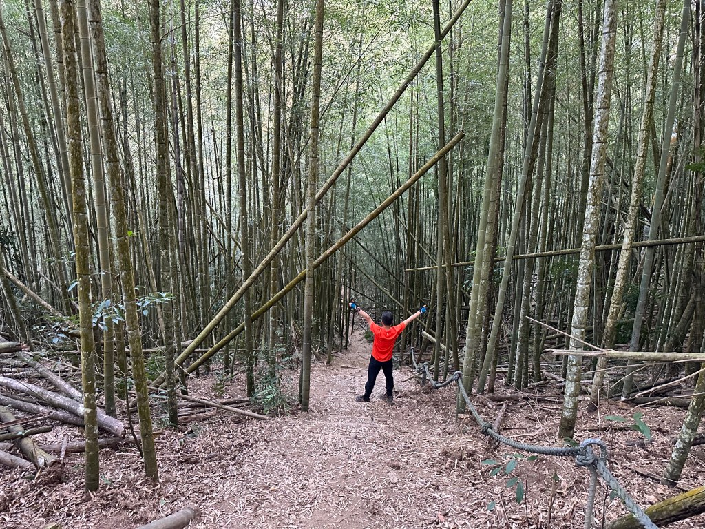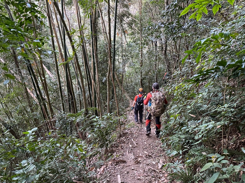 過了頂城山岔後,路徑轉為緩上但開始出現一些倒竹,超過海拔H1460m後,密集的倒竹區出現,整個稜線呈現的是寬稜,再加上登山布條不多,這一段容易偏離路徑,下載離線地圖來對照比較保險。一直到海拔H1520m才脫離倒竹區,接著又一路超陡的陡上。