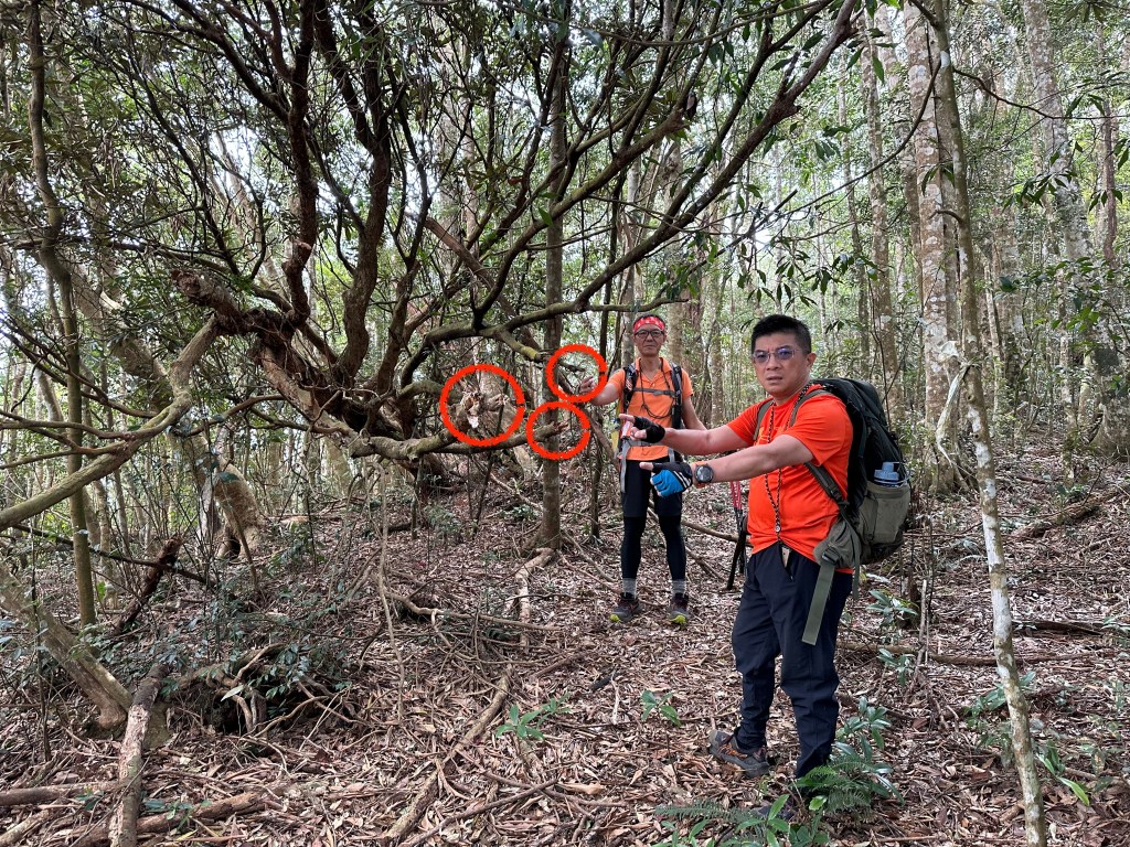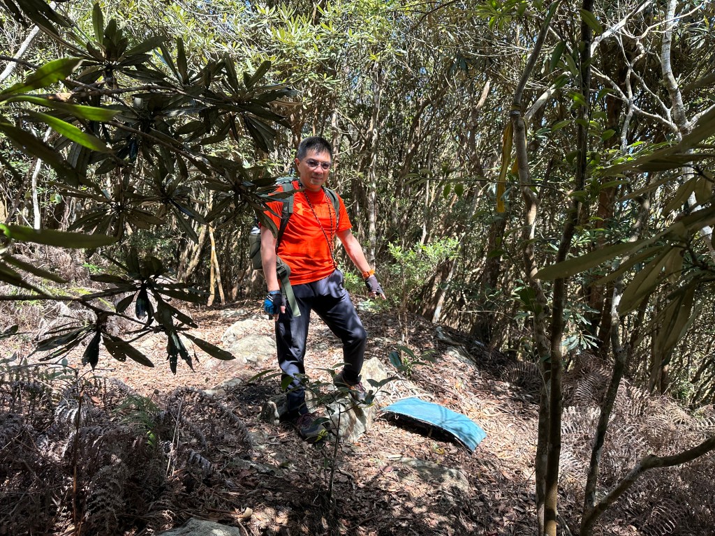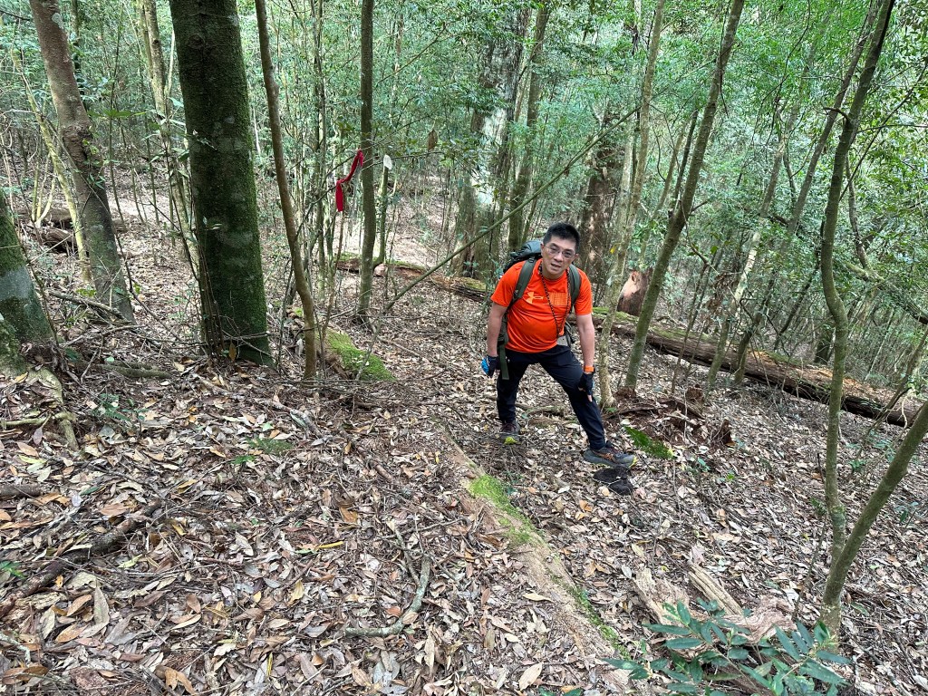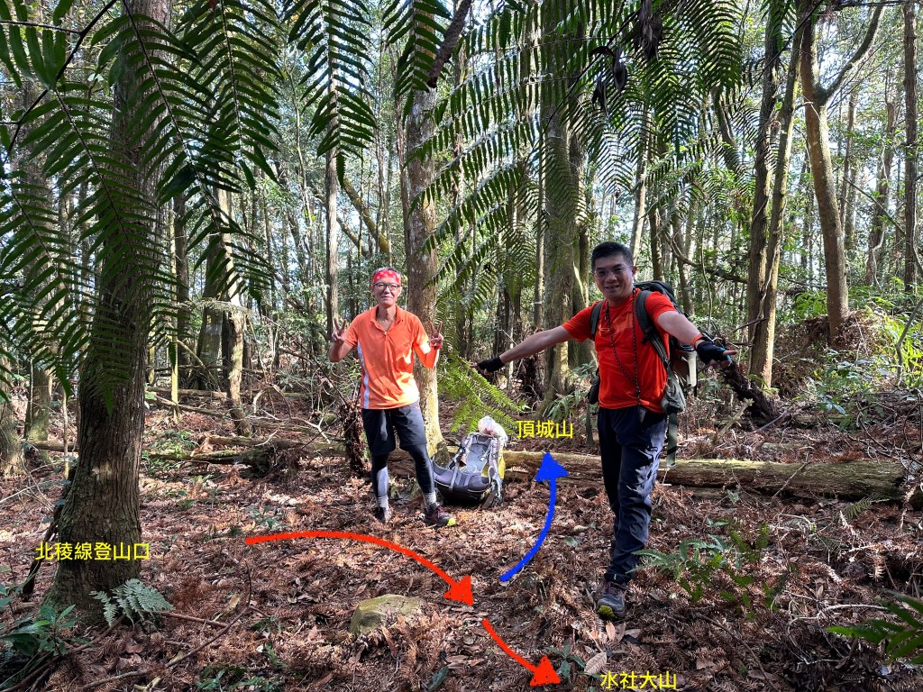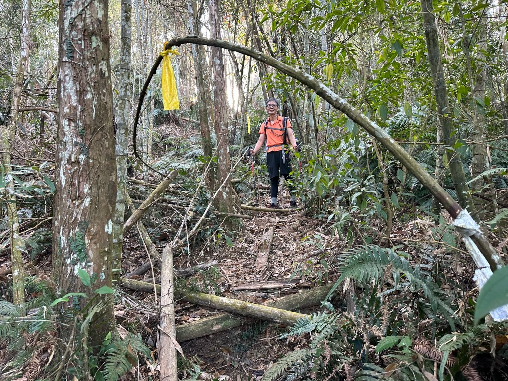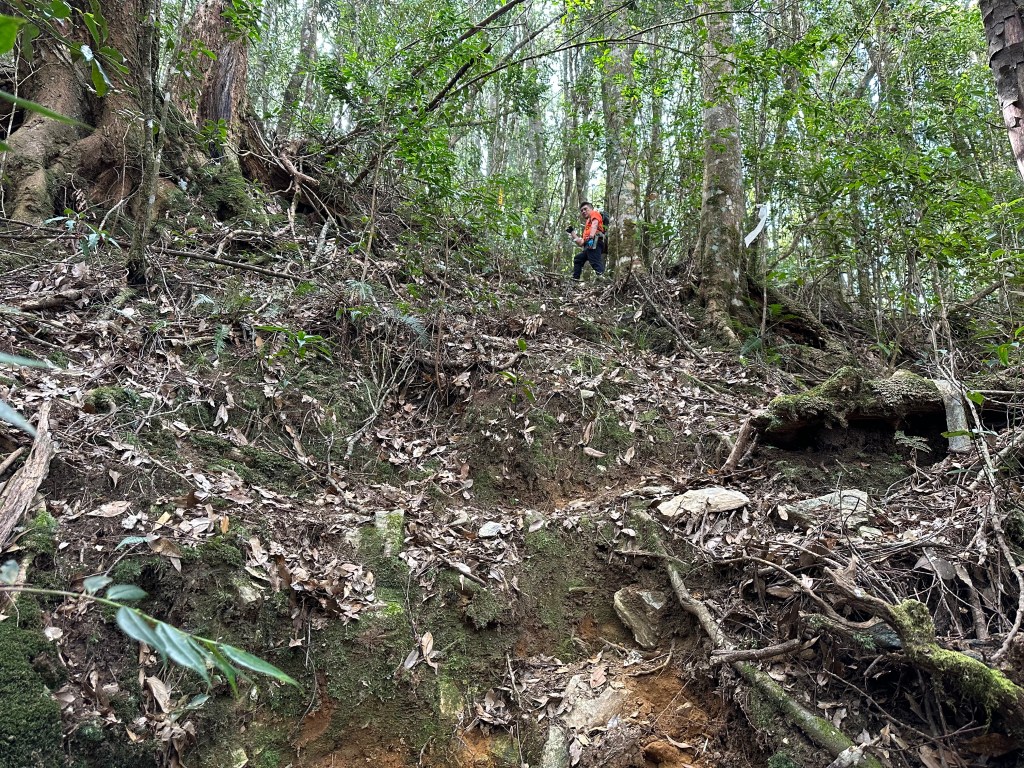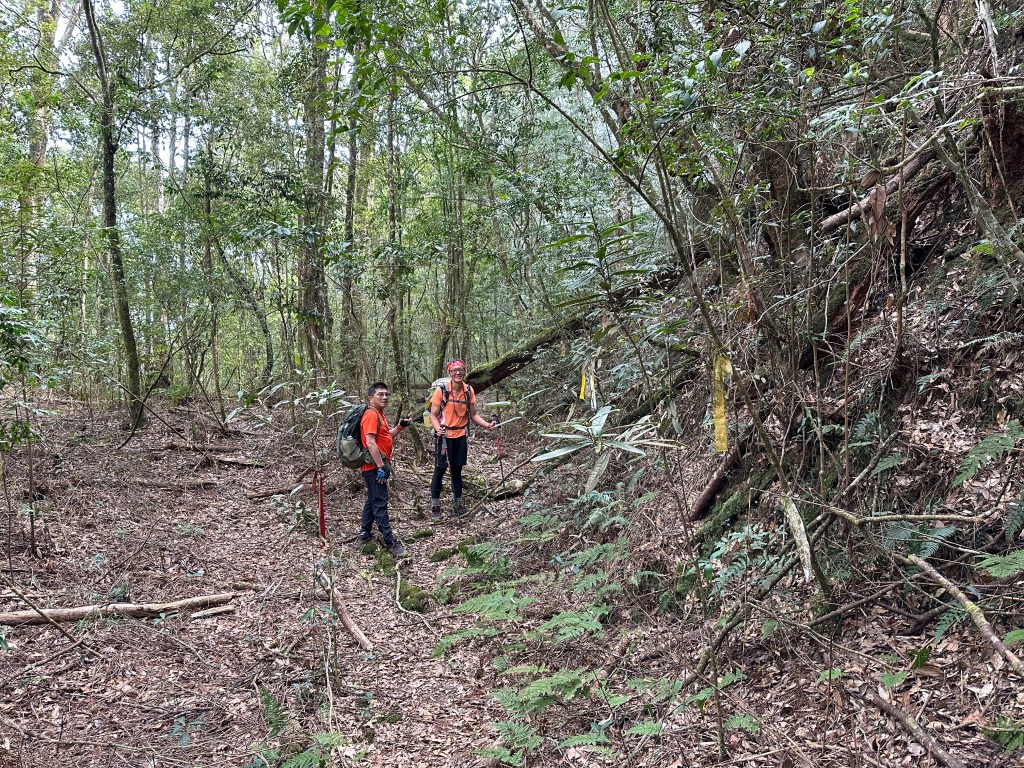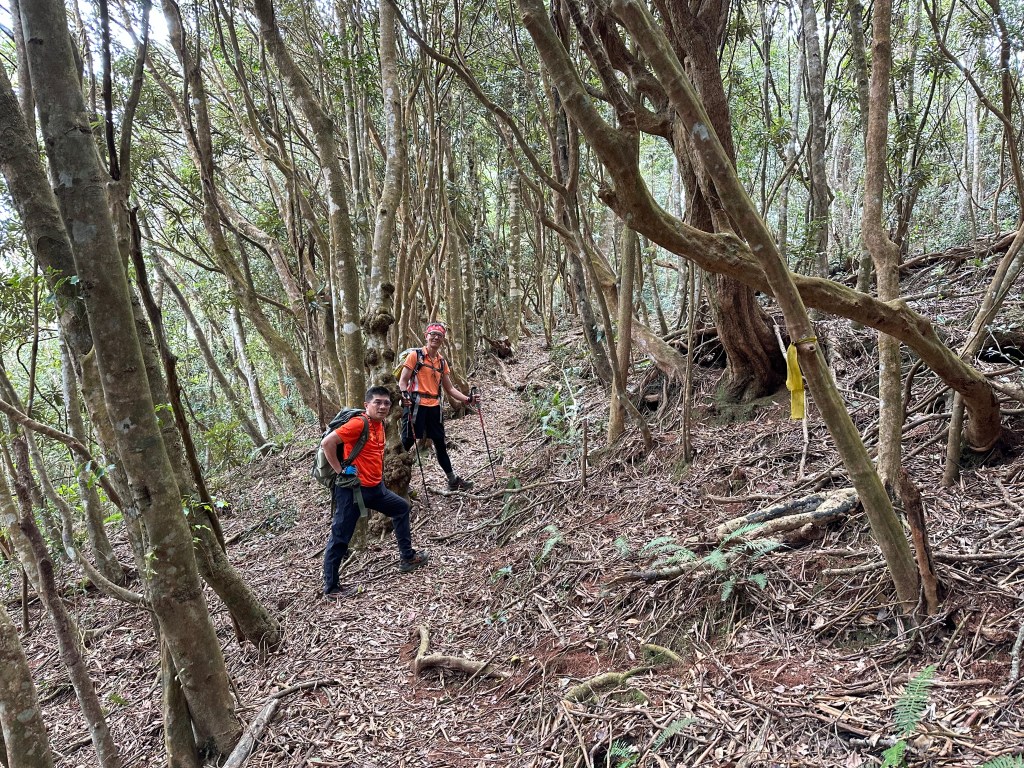 北稜線的步道陡得很吃腳力,但路徑是落葉鬆軟型態,剛開始偶爾有倒竹擋路,走到海拔H1317m時左側出現岔路,拿出離線地圖來看,地圖上並沒有這一段的路徑軌跡?但之前做功課時,看過有山友走過這一條路線可以往下通往頂城山,一行5人就在此岔休息了一下。