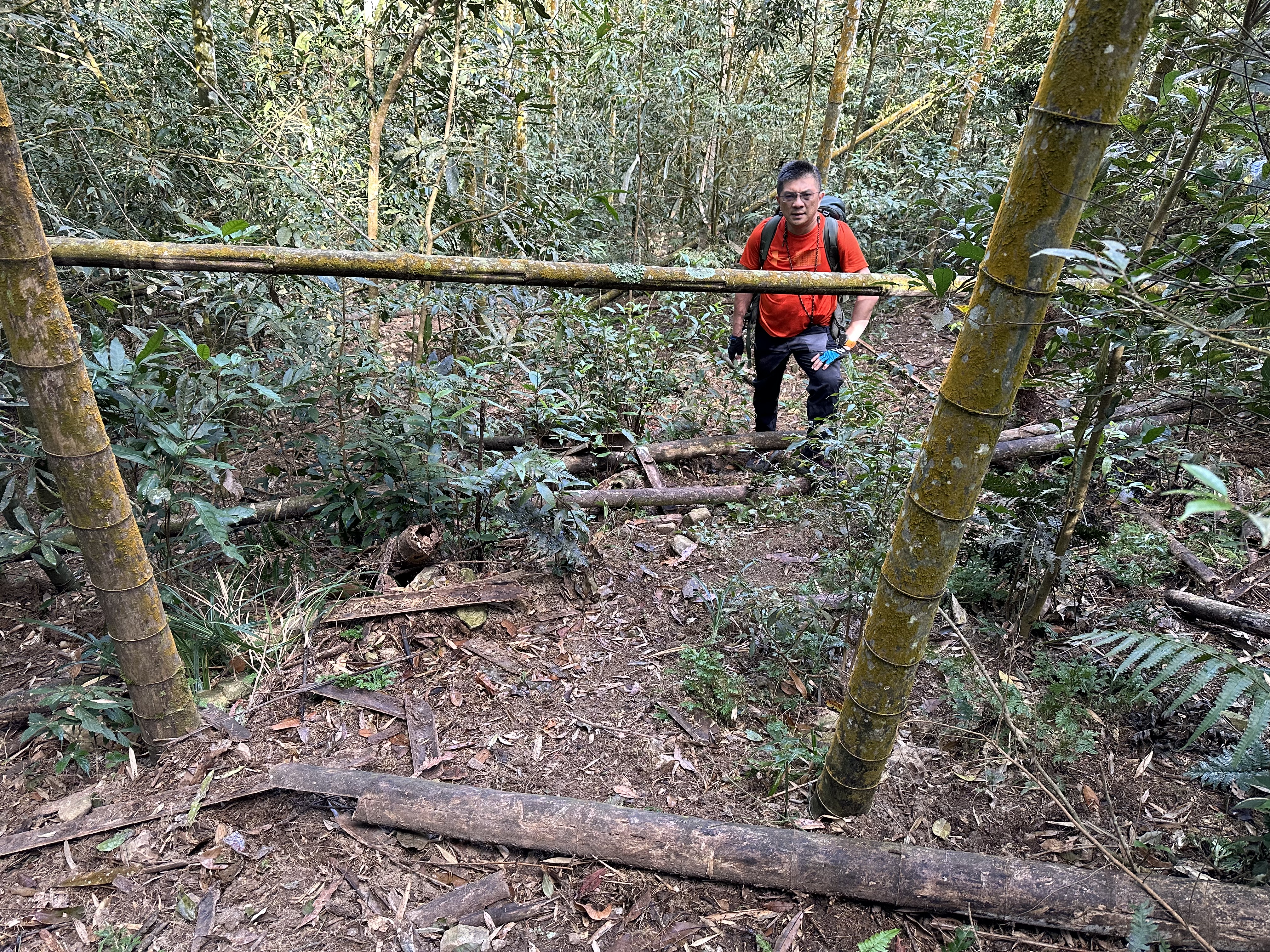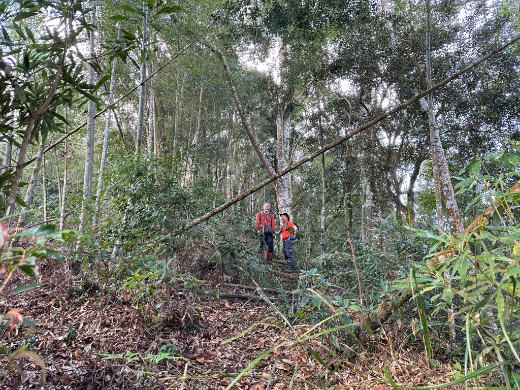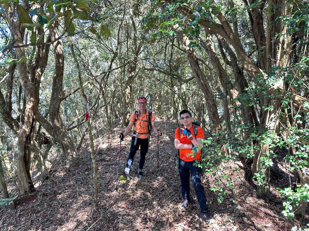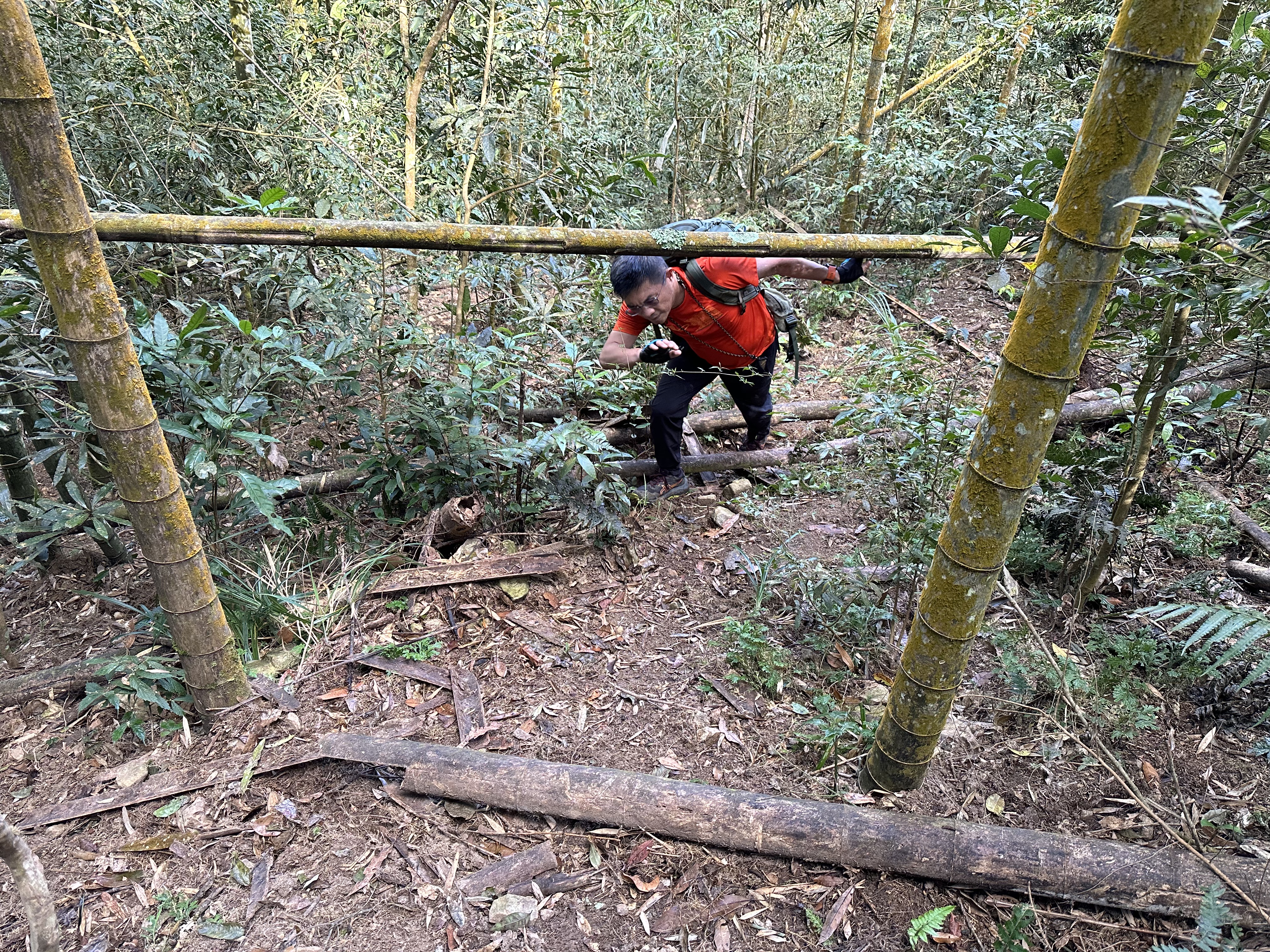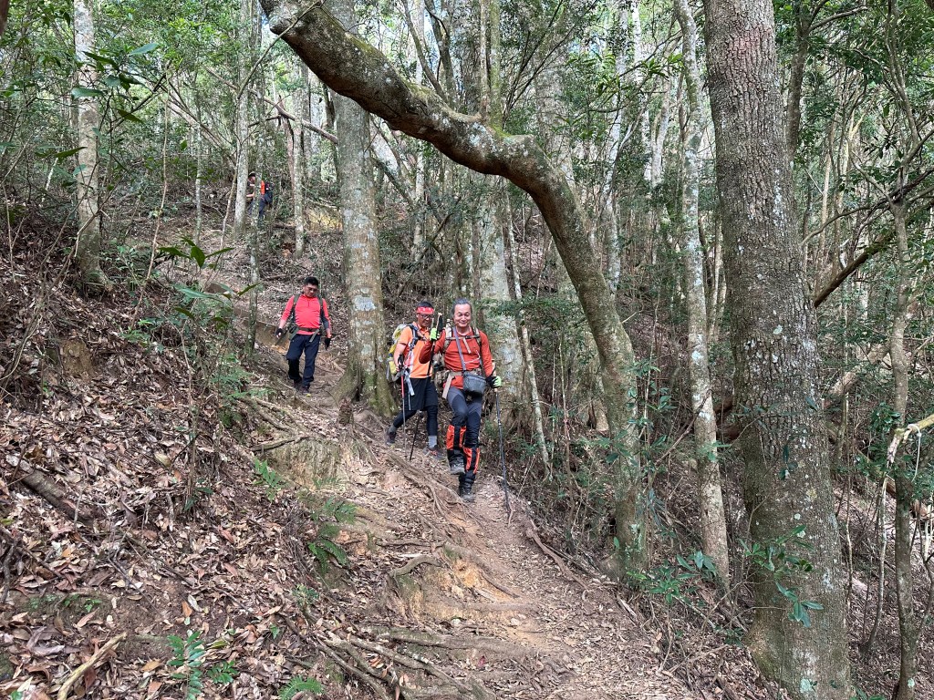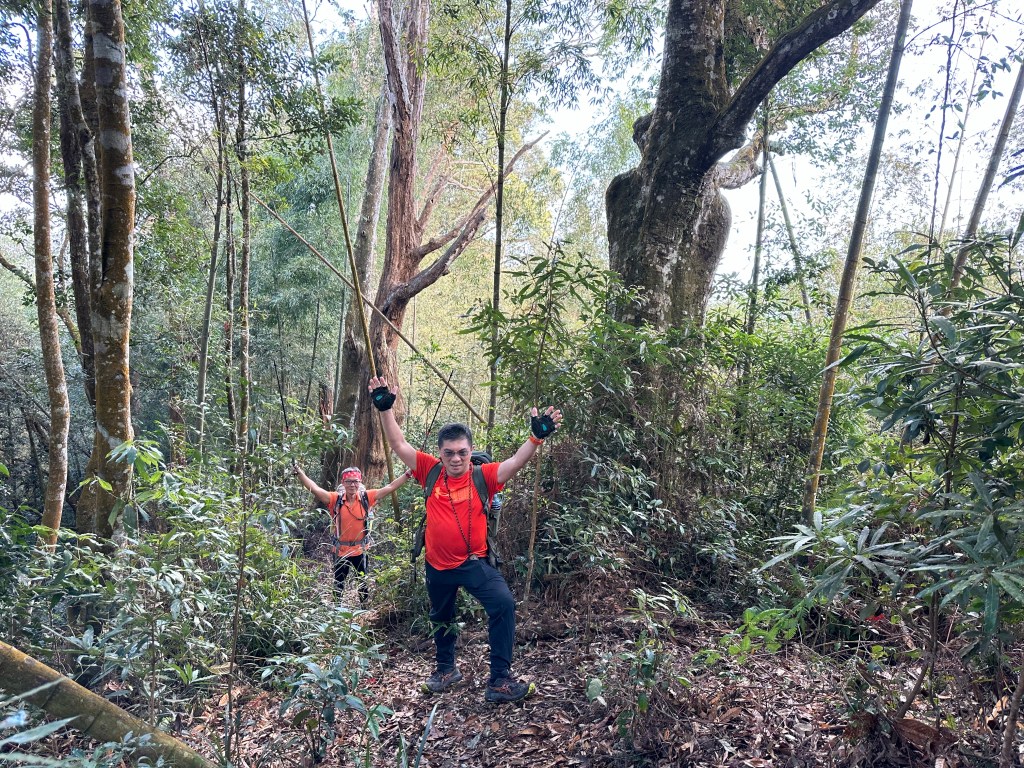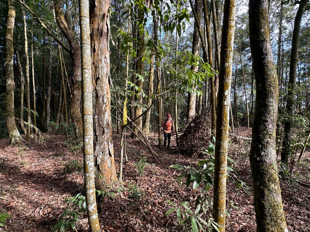 北稜線的步道陡得很吃腳力,但路徑是落葉鬆軟型態,剛開始偶爾有倒竹擋路,走到海拔H1317m時左側出現岔路,拿出離線地圖來看,地圖上並沒有這一段的路徑軌跡?但之前做功課時,看過有山友走過這一條路線可以往下通往頂城山,一行5人就在此岔休息了一下。