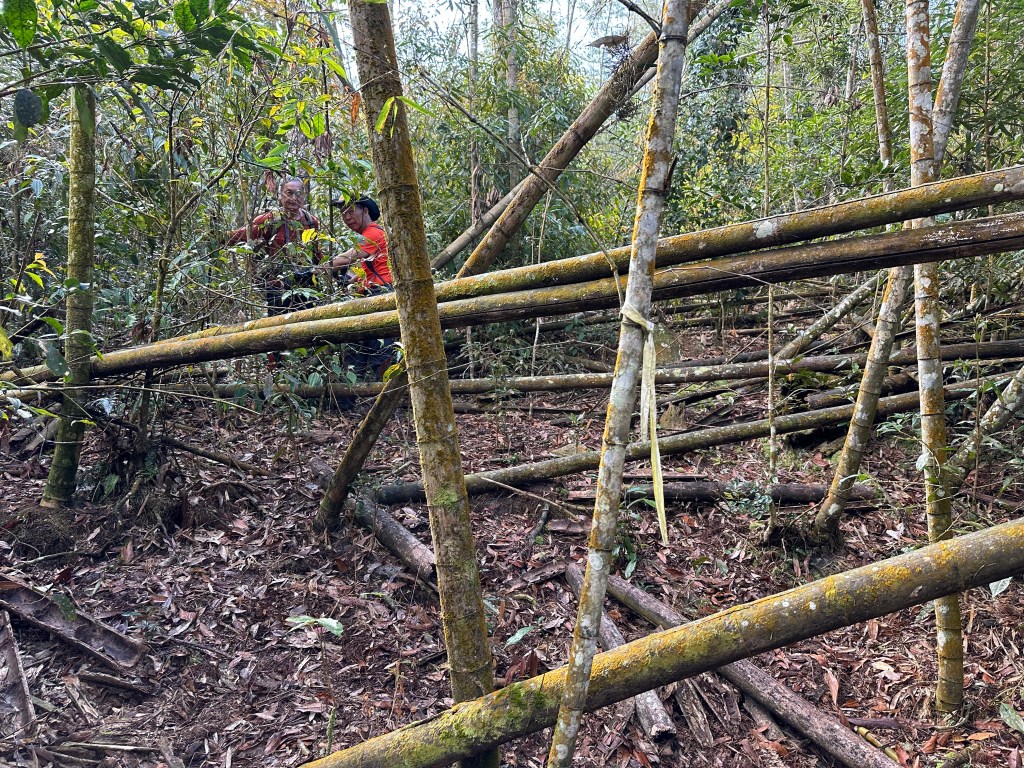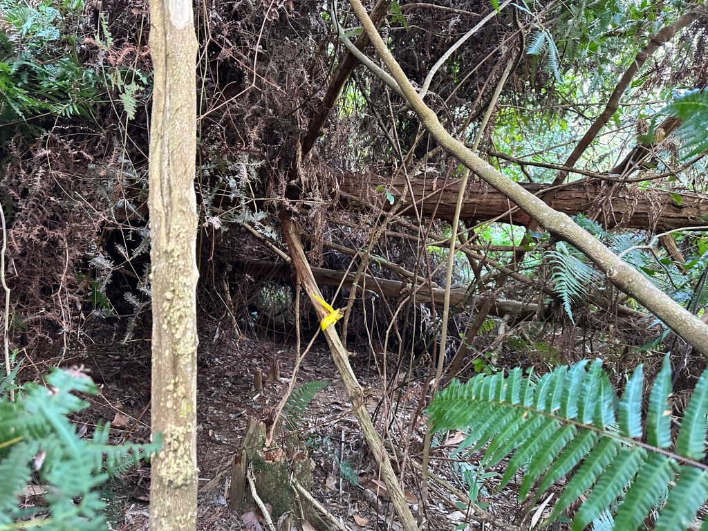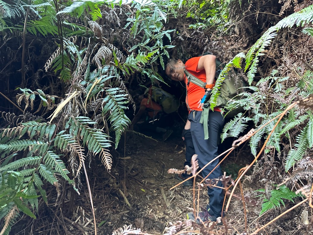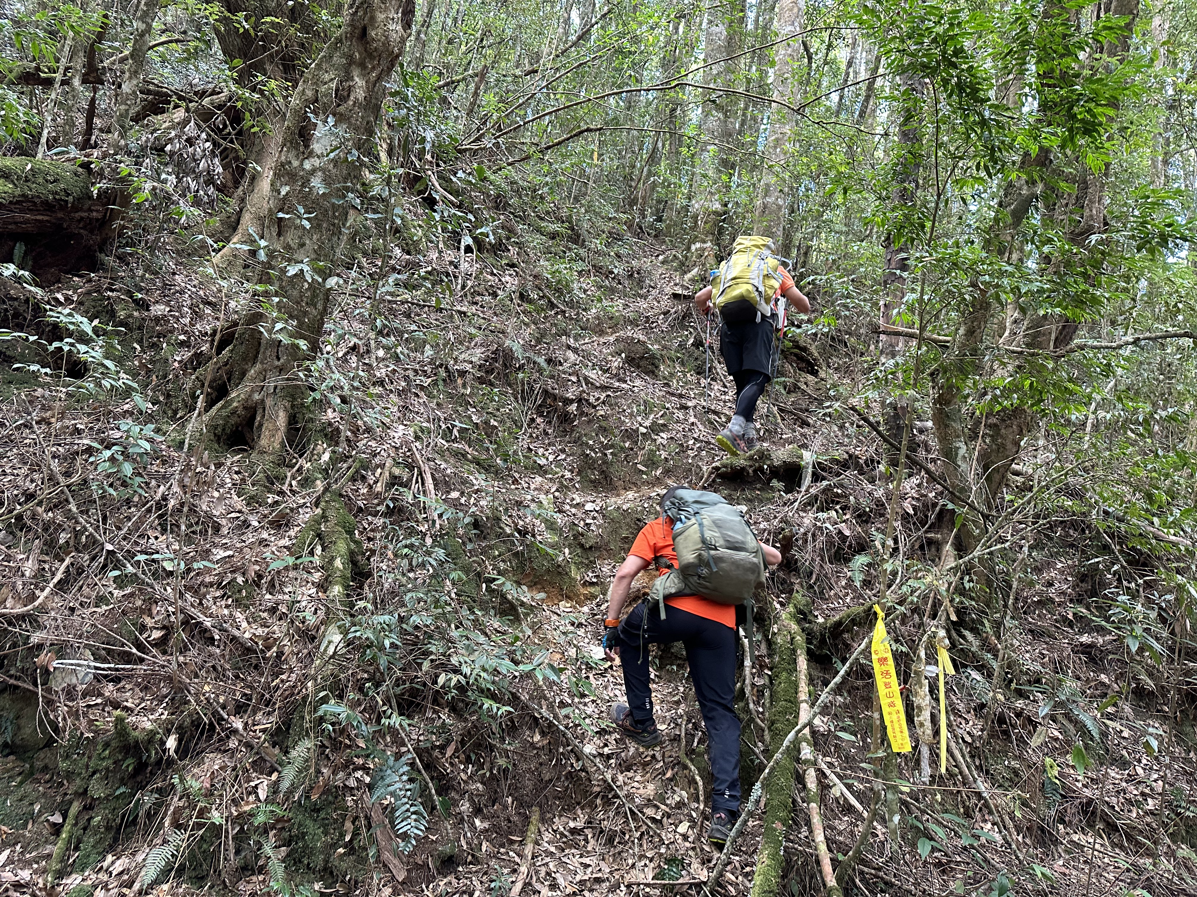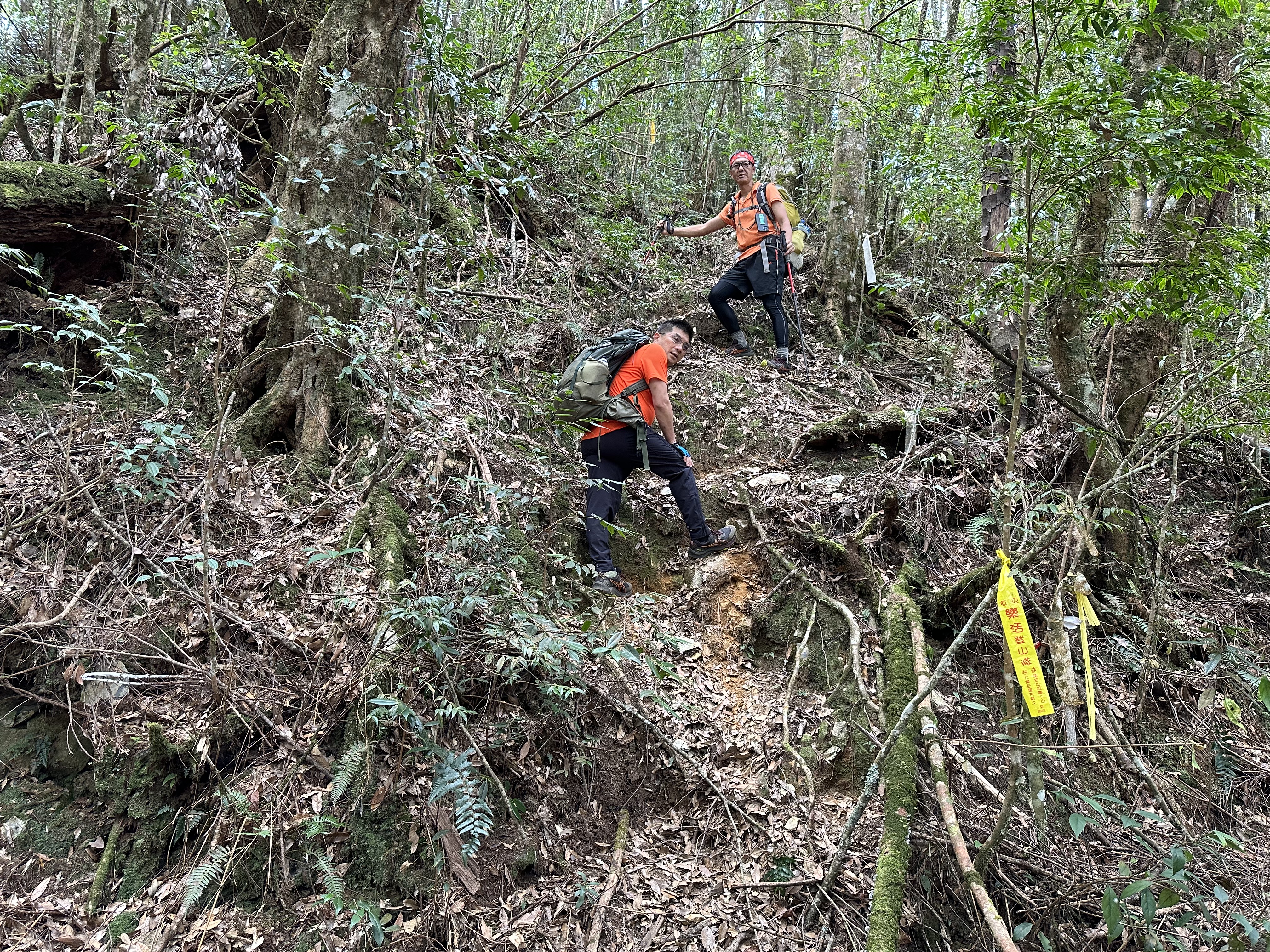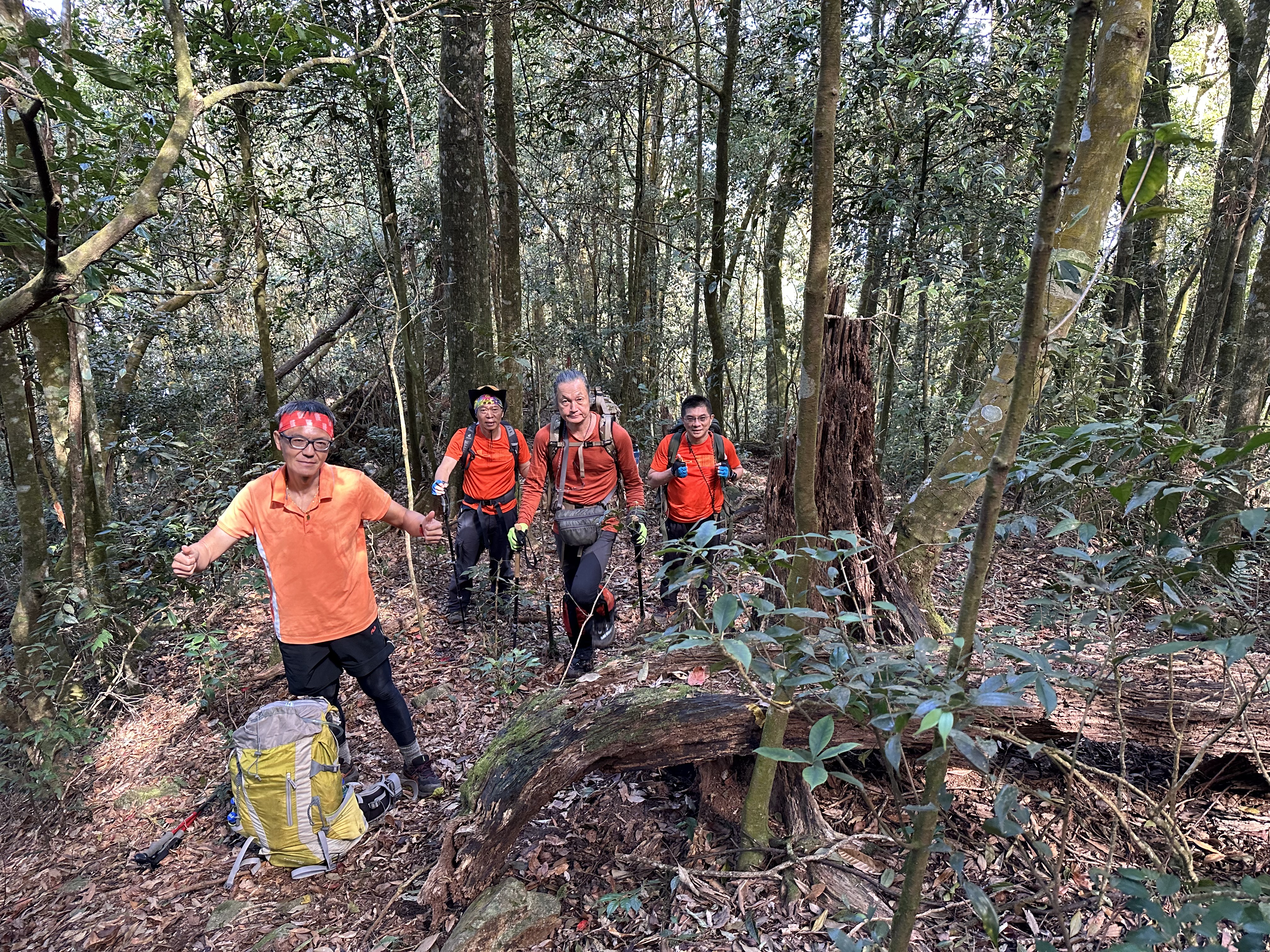 北稜線的步道陡得很吃腳力,但路徑是落葉鬆軟型態,剛開始偶爾有倒竹擋路,走到海拔H1317m時左側出現岔路,拿出離線地圖來看,地圖上並沒有這一段的路徑軌跡?但之前做功課時,看過有山友走過這一條路線可以往下通往頂城山,一行5人就在此岔休息了一下。