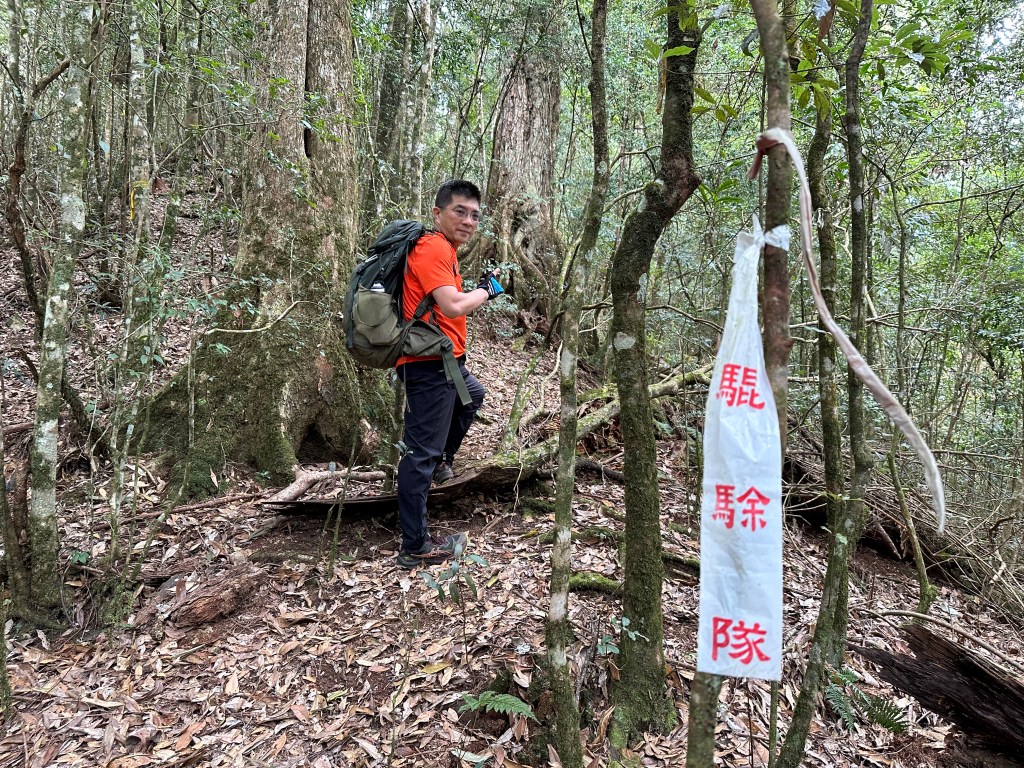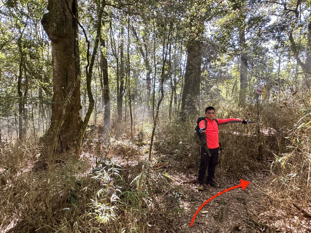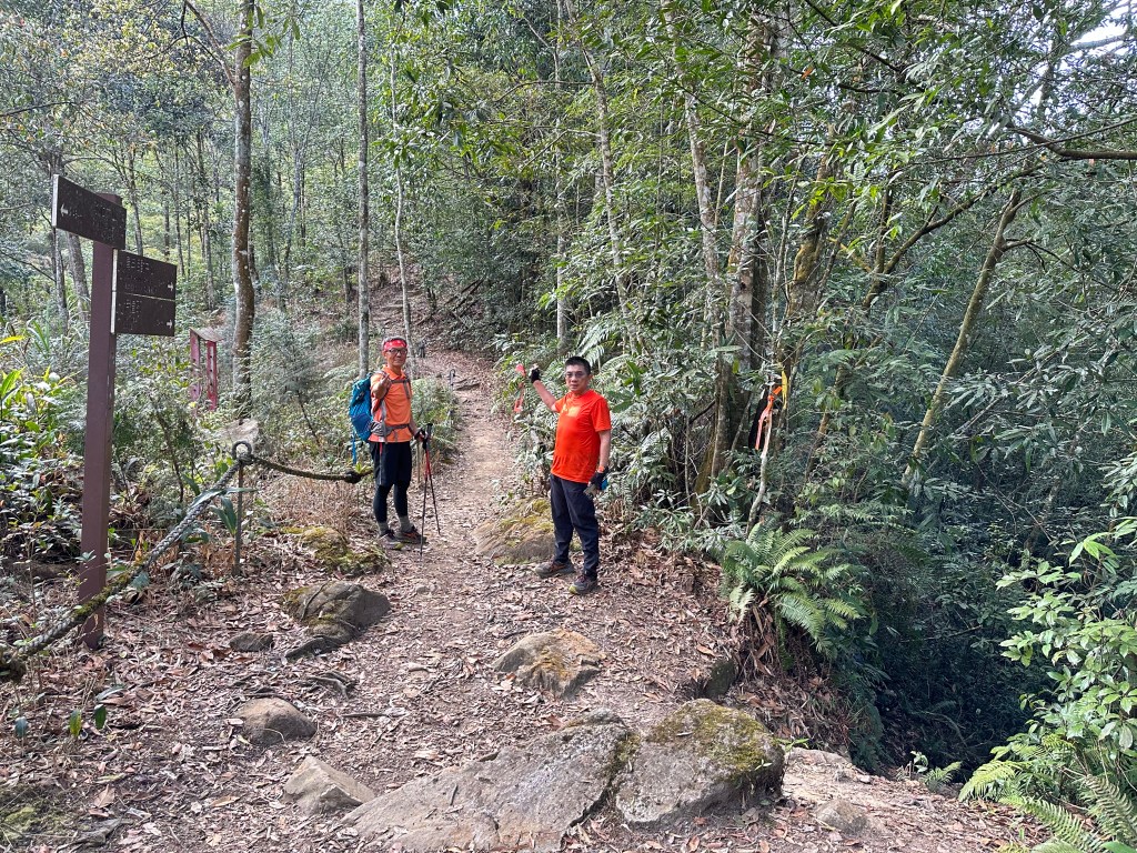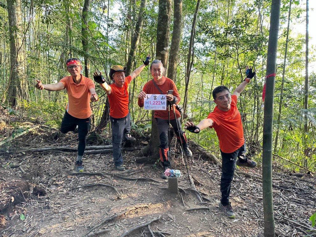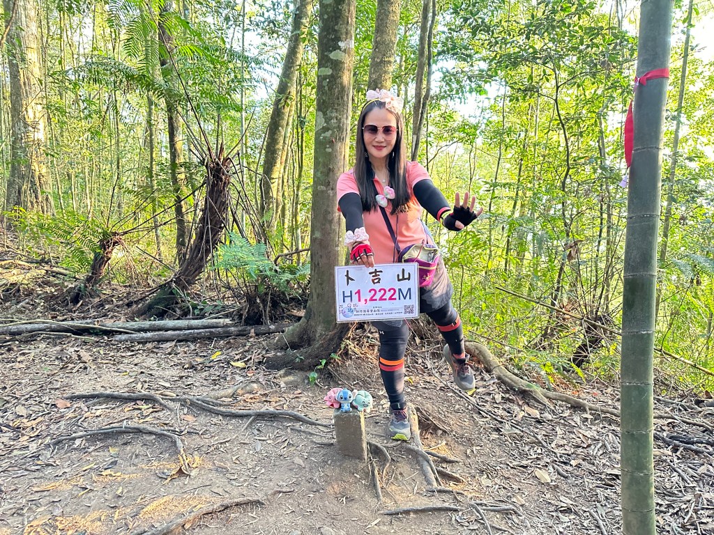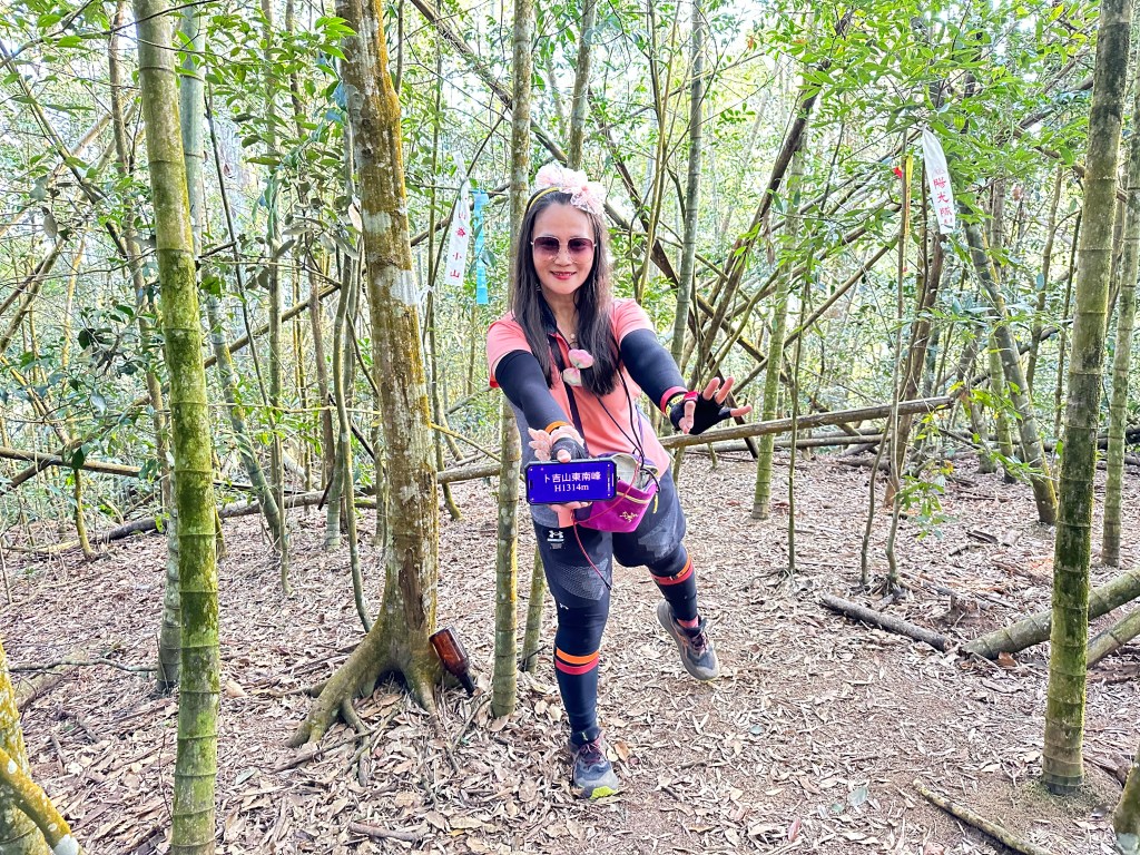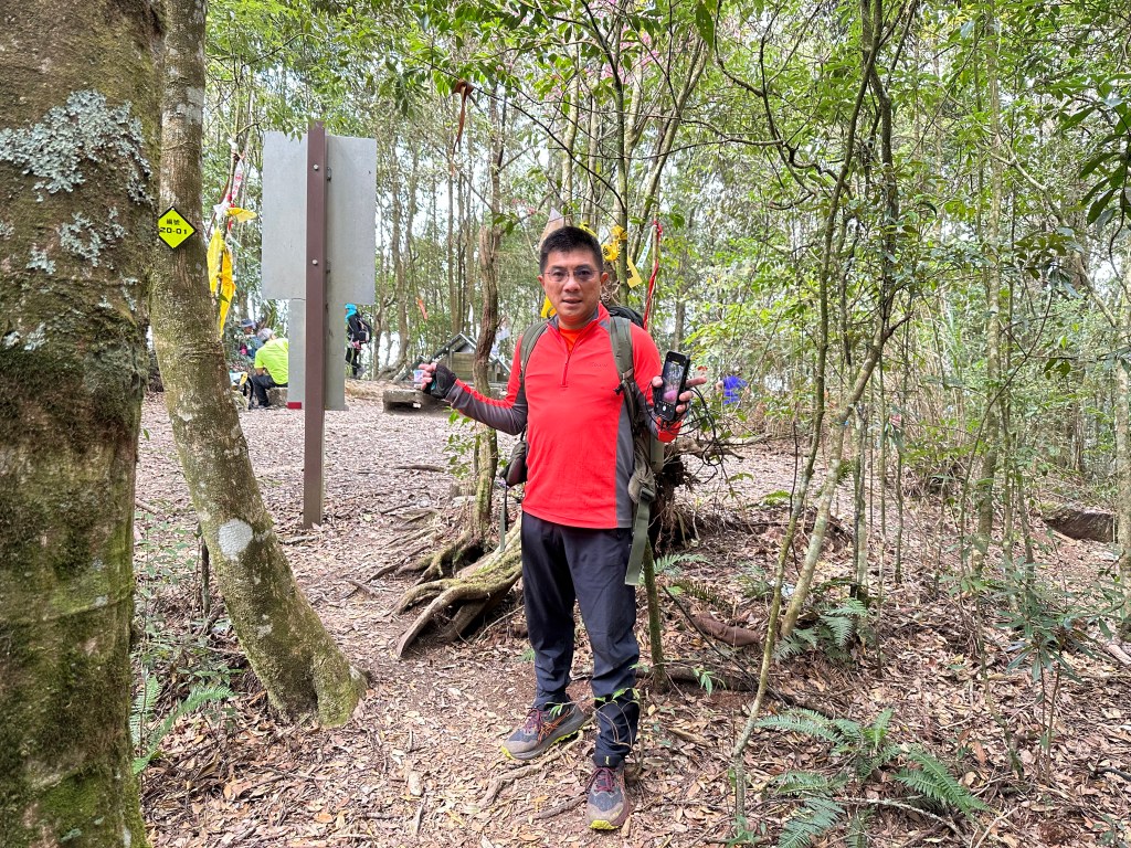 在土地公岔這裡,我們將背包給留下,繼續沿著步道往2.8K的卜吉山東南峰走,這一段要一路的陡上真是小魔王啊!在2.8K這裡左轉脫離步道走進100m的距離來到卜吉山東南峰,這裡是一個小山頭,但沒有三角點啊?只好自行利用APP製作名牌拍照。