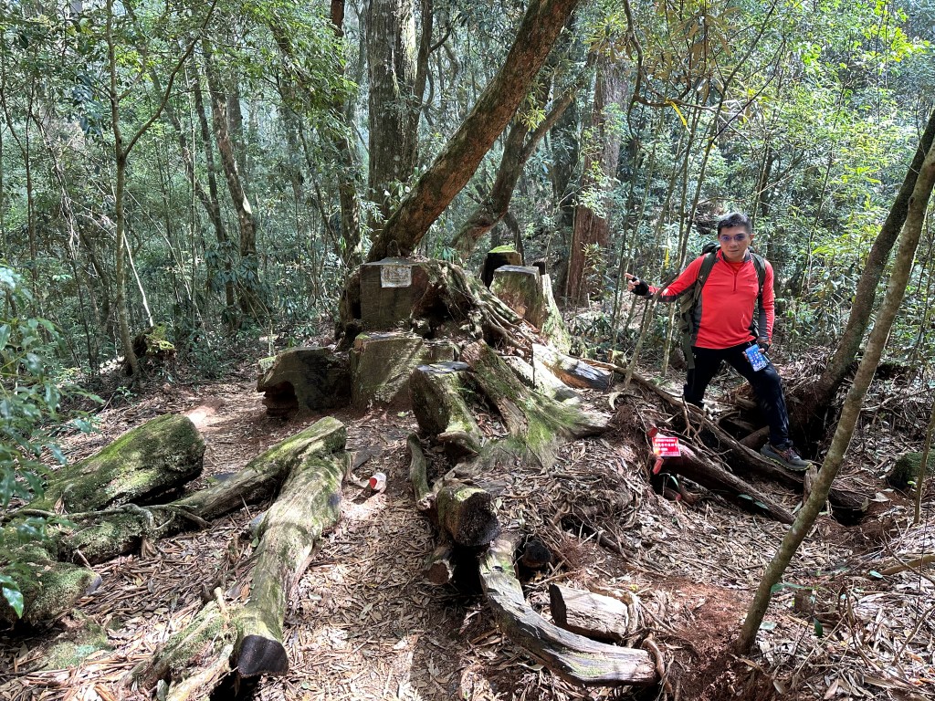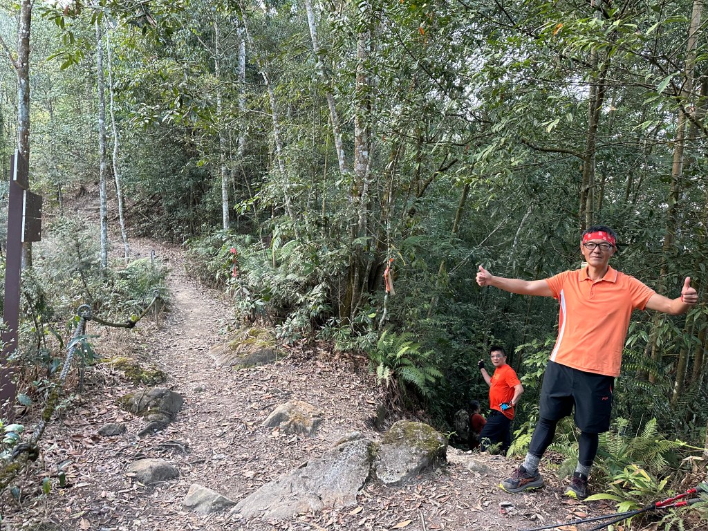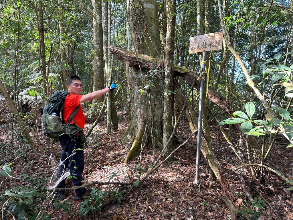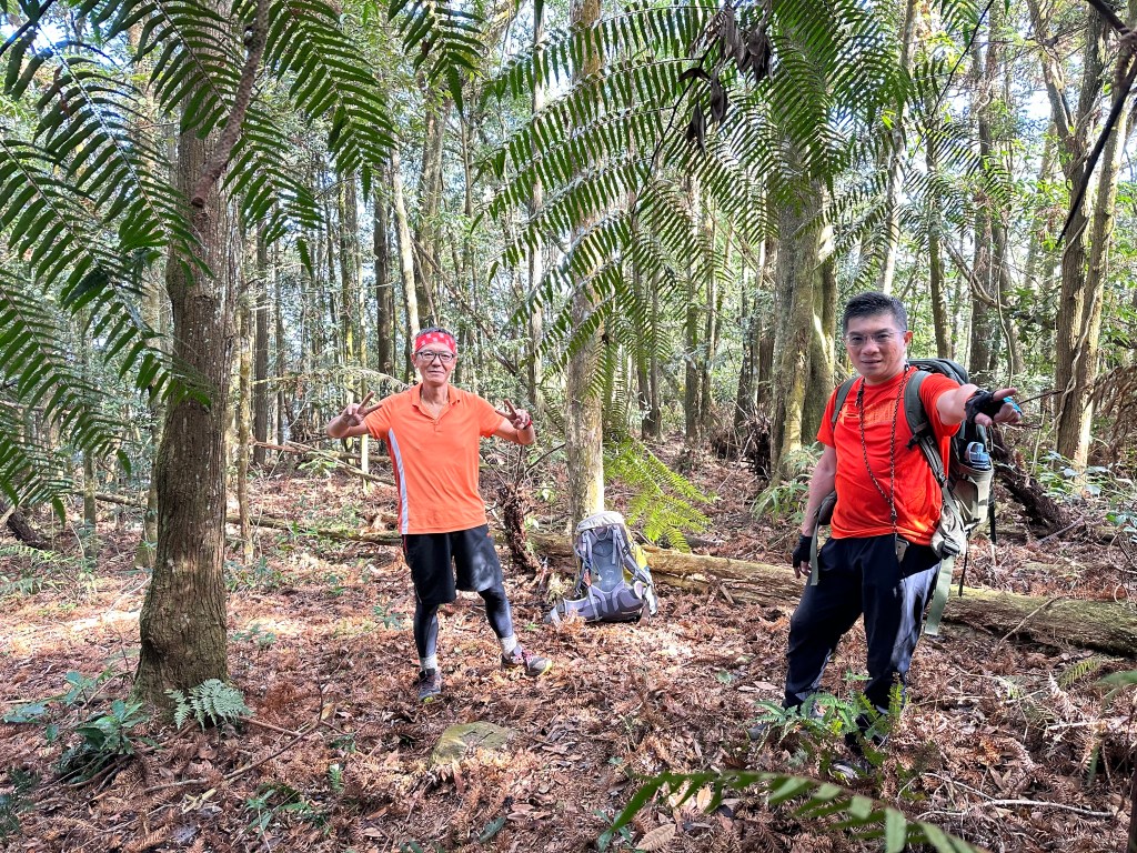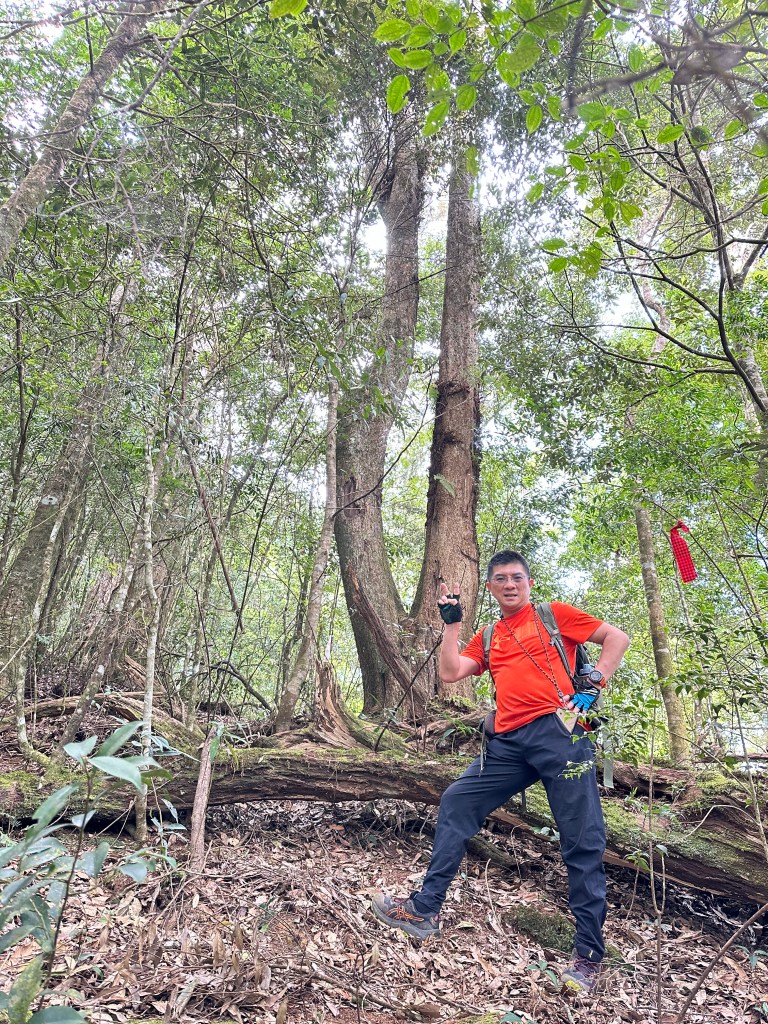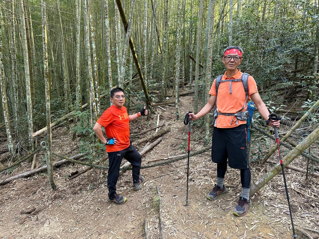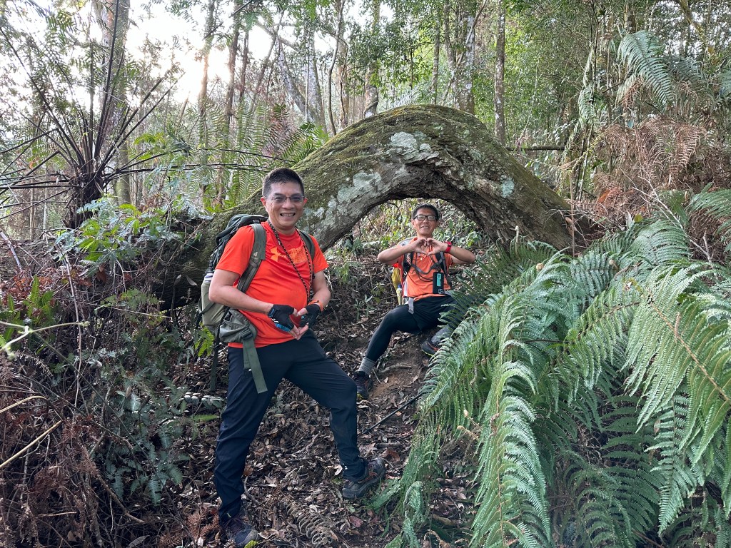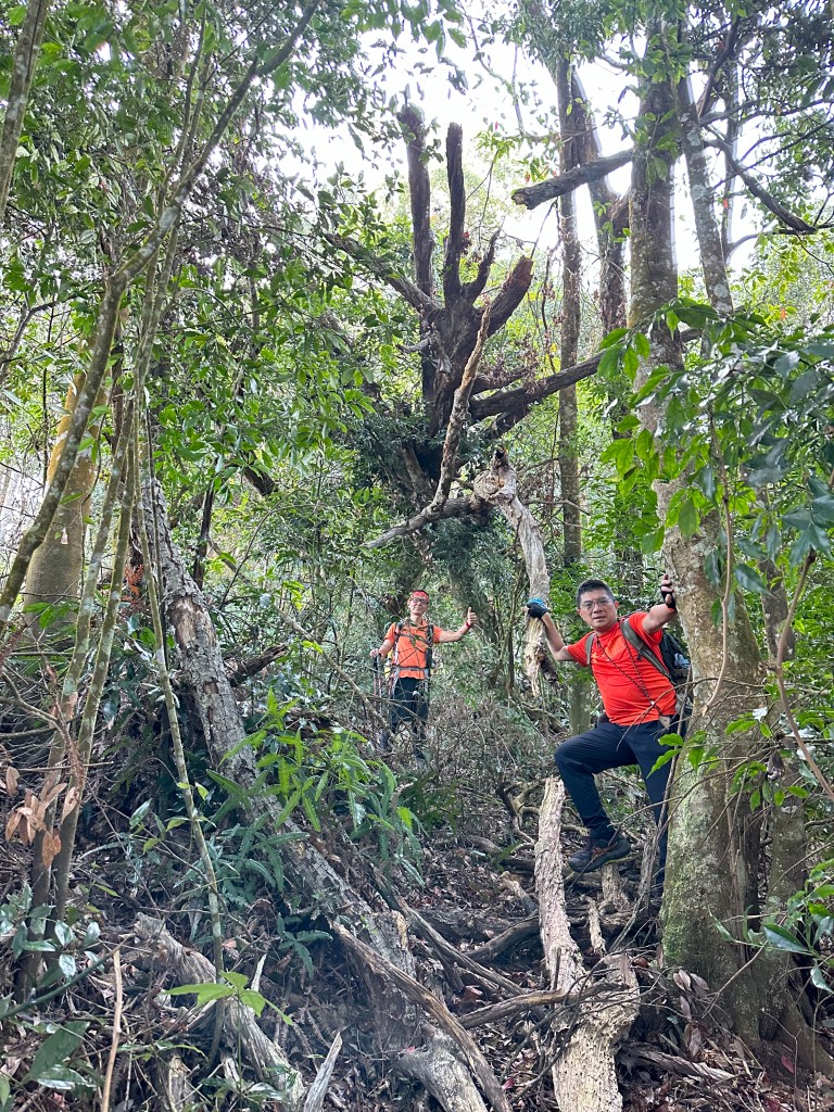 在土地公岔這裡,我們將背包給留下,繼續沿著步道往2.8K的卜吉山東南峰走,這一段要一路的陡上真是小魔王啊!在2.8K這裡左轉脫離步道走進100m的距離來到卜吉山東南峰,這裡是一個小山頭,但沒有三角點啊?只好自行利用APP製作名牌拍照。