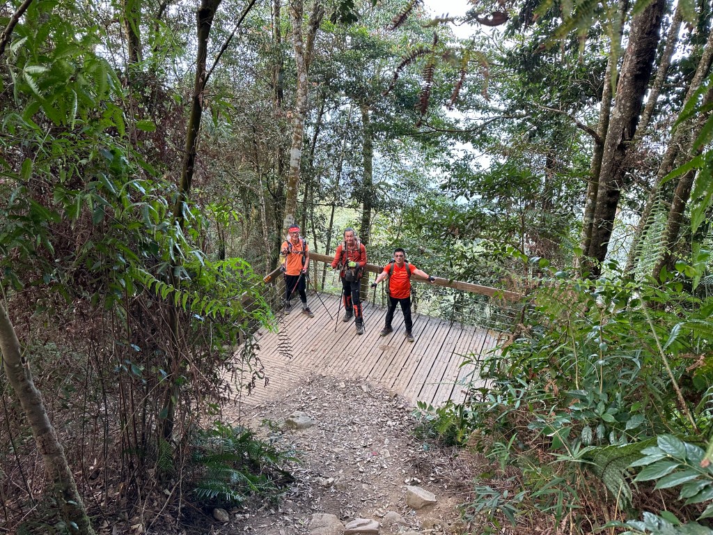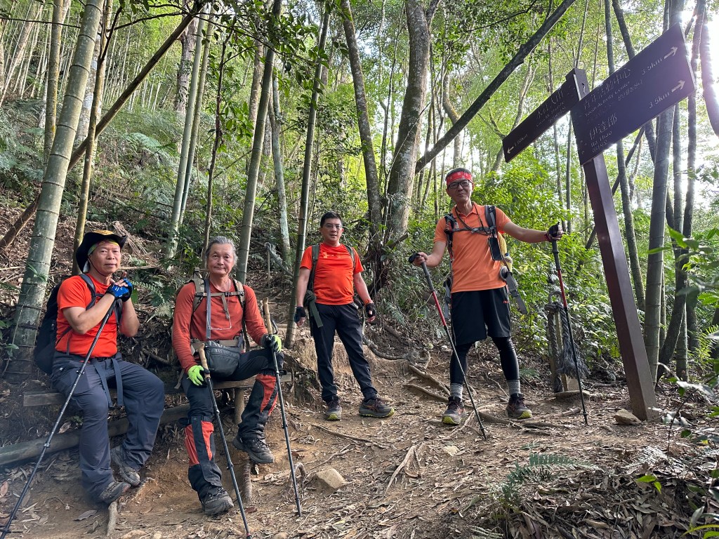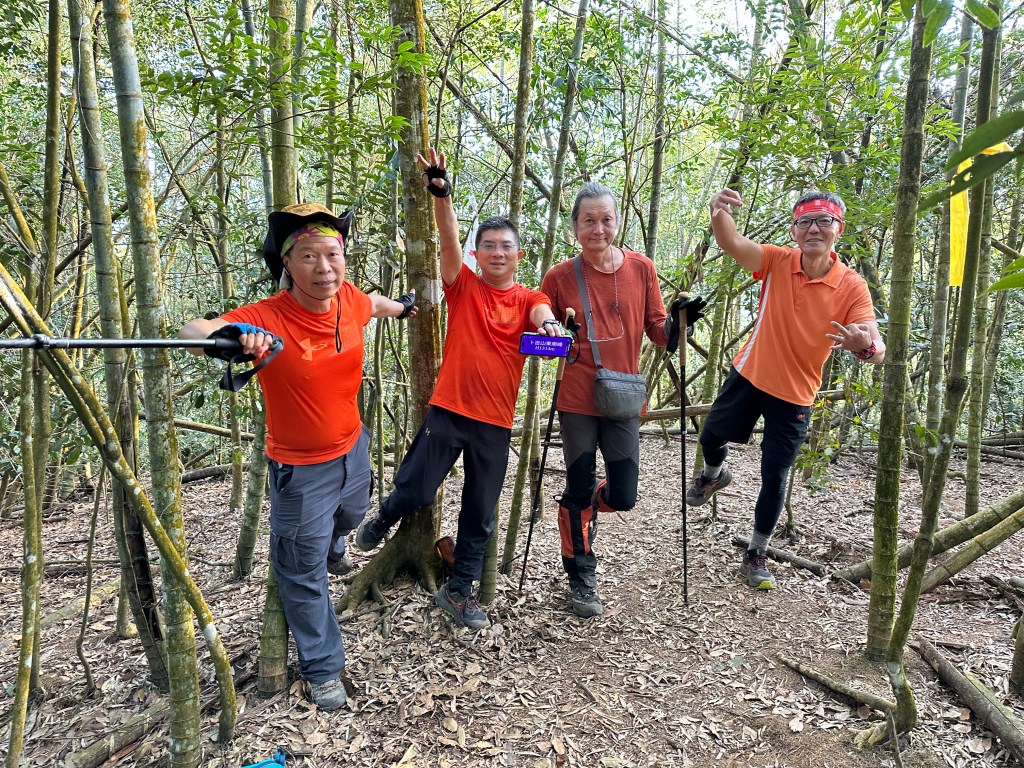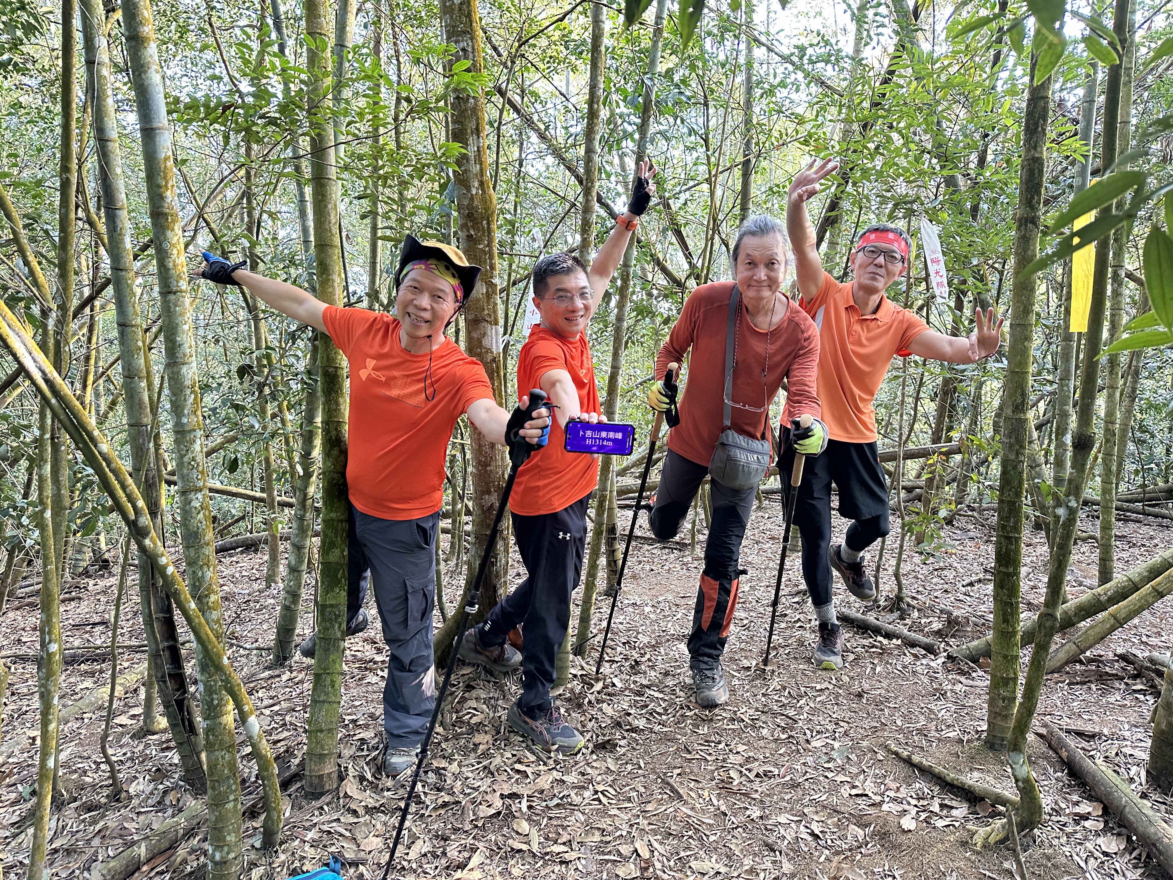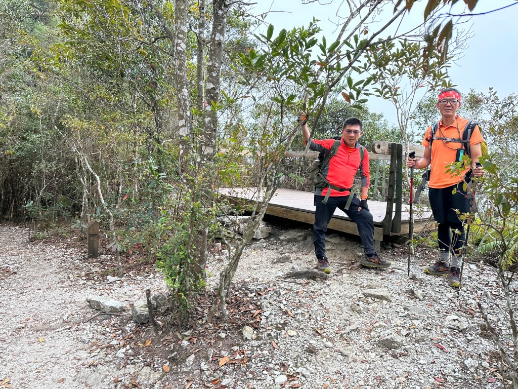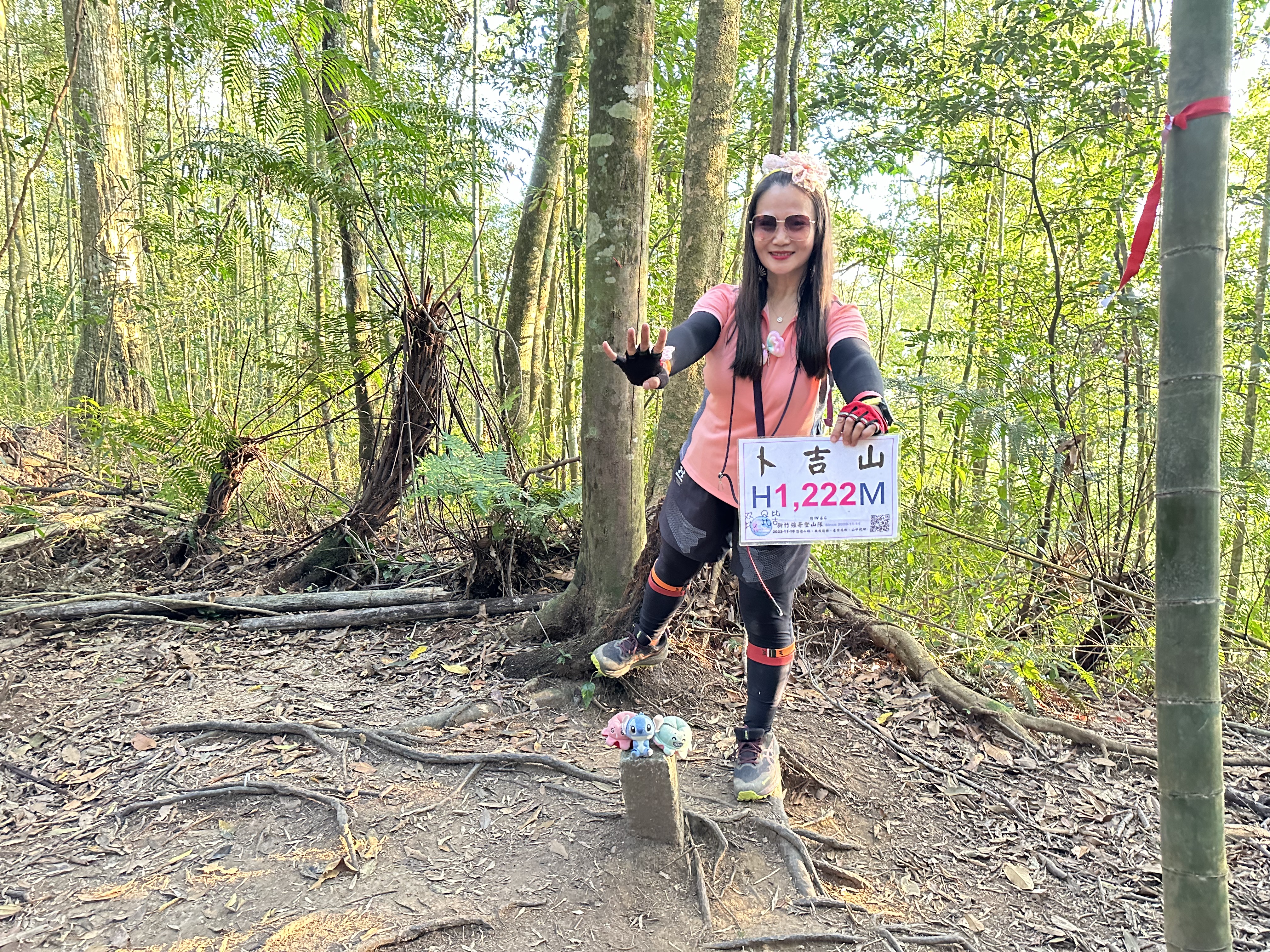 在土地公岔這裡,我們將背包給留下,繼續沿著步道往2.8K的卜吉山東南峰走,這一段要一路的陡上真是小魔王啊!在2.8K這裡左轉脫離步道走進100m的距離來到卜吉山東南峰,這裡是一個小山頭,但沒有三角點啊?只好自行利用APP製作名牌拍照。