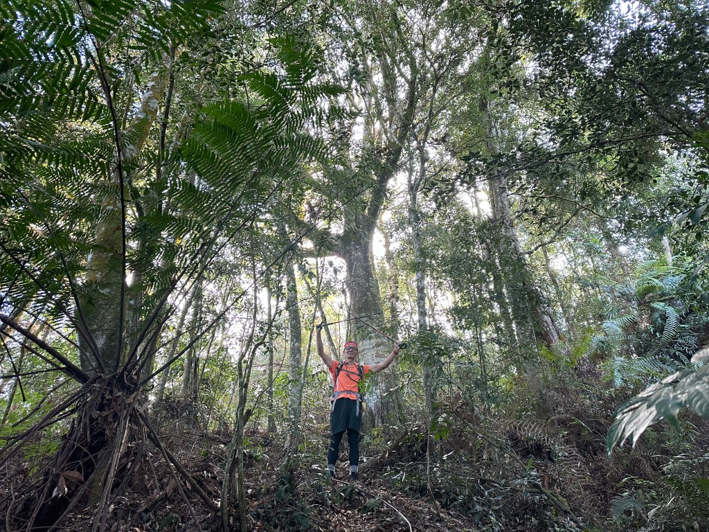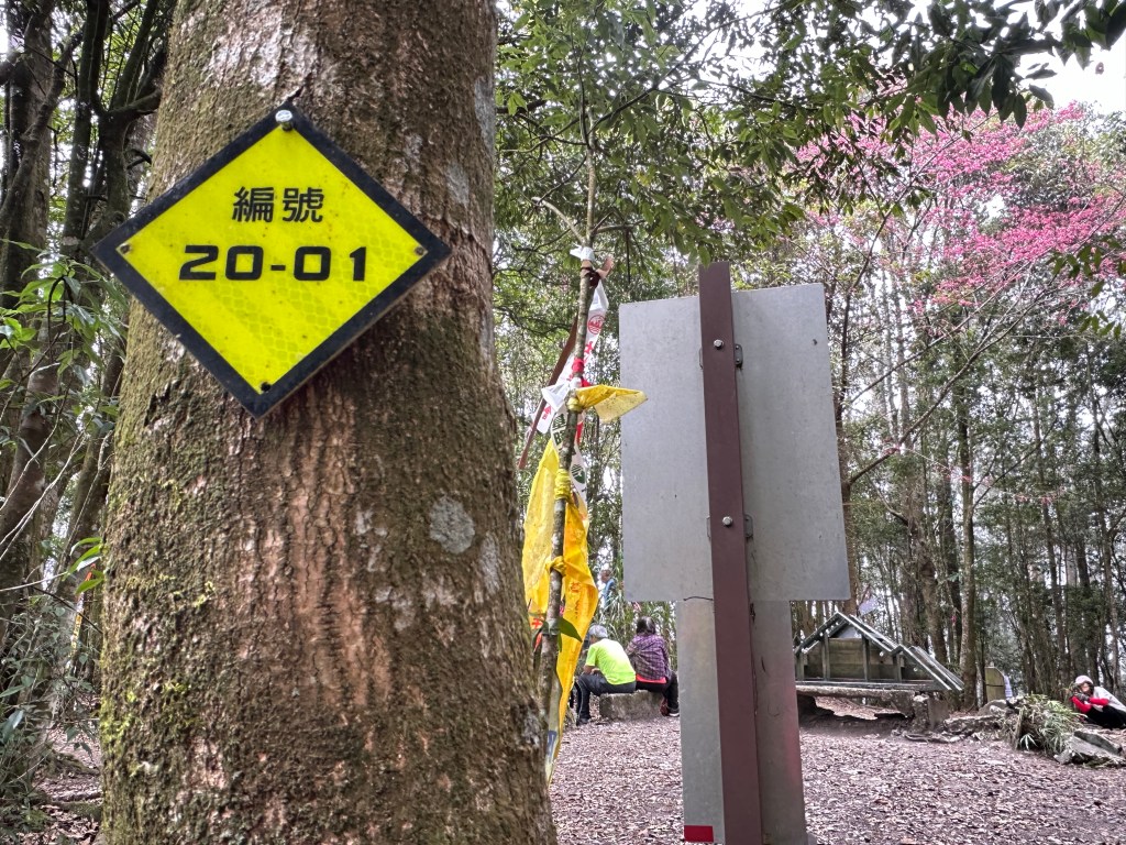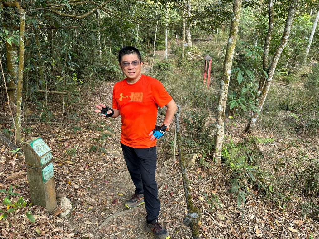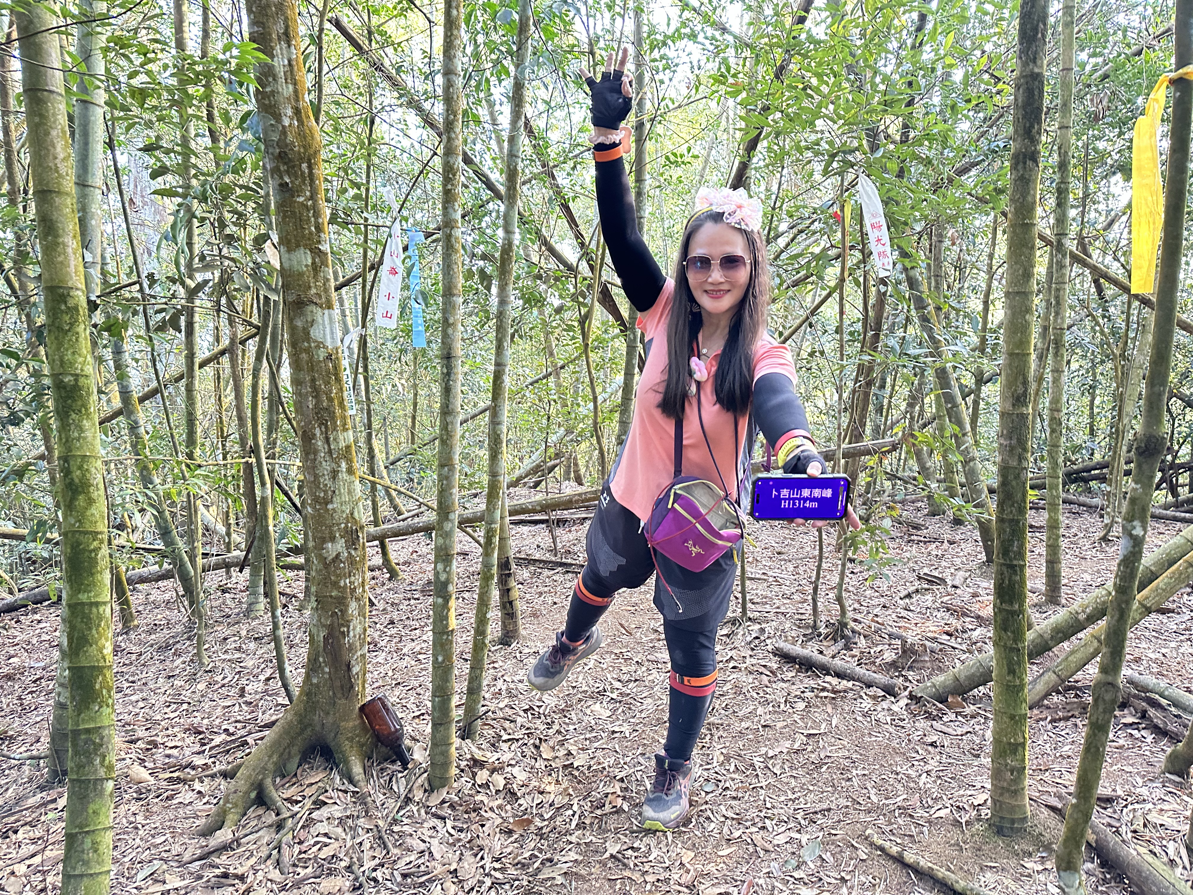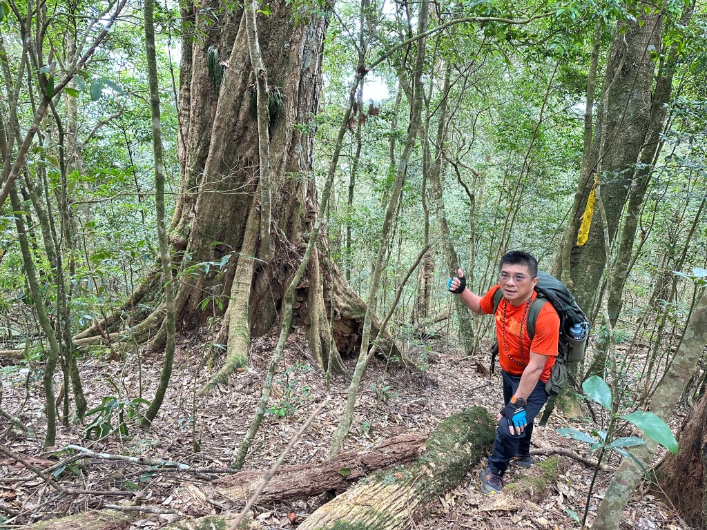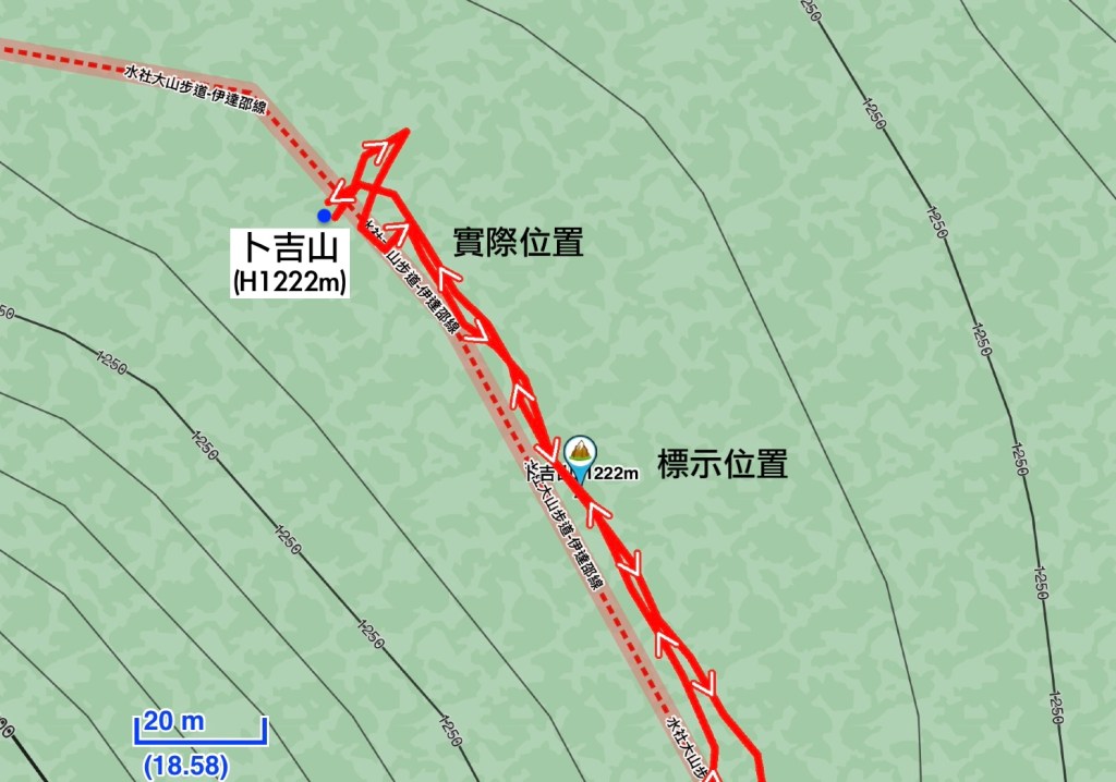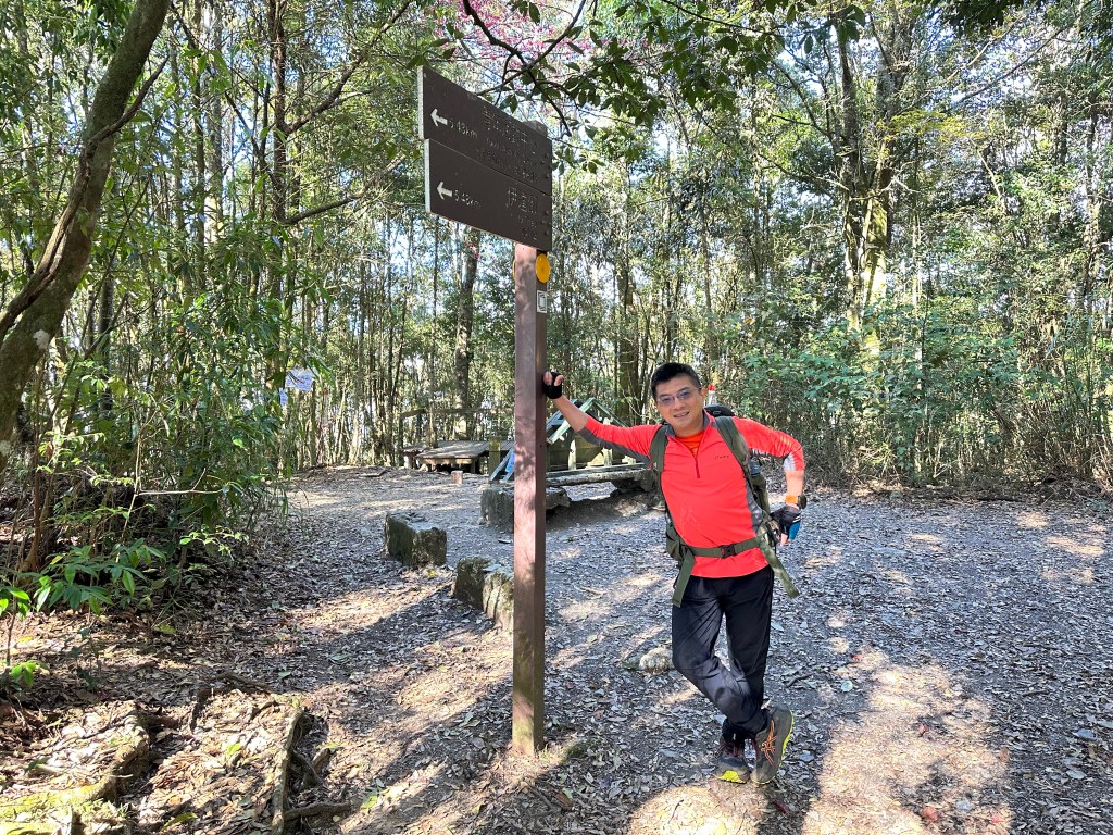 在土地公岔這裡,我們將背包給留下,繼續沿著步道往2.8K的卜吉山東南峰走,這一段要一路的陡上真是小魔王啊!在2.8K這裡左轉脫離步道走進100m的距離來到卜吉山東南峰,這裡是一個小山頭,但沒有三角點啊?只好自行利用APP製作名牌拍照。