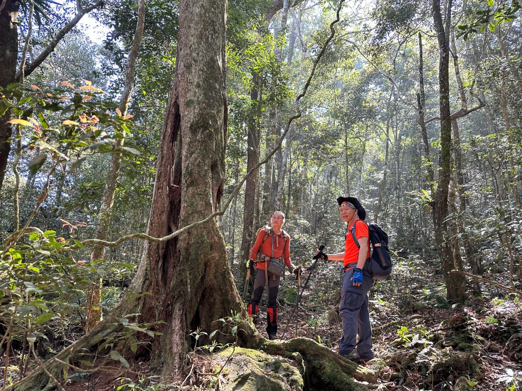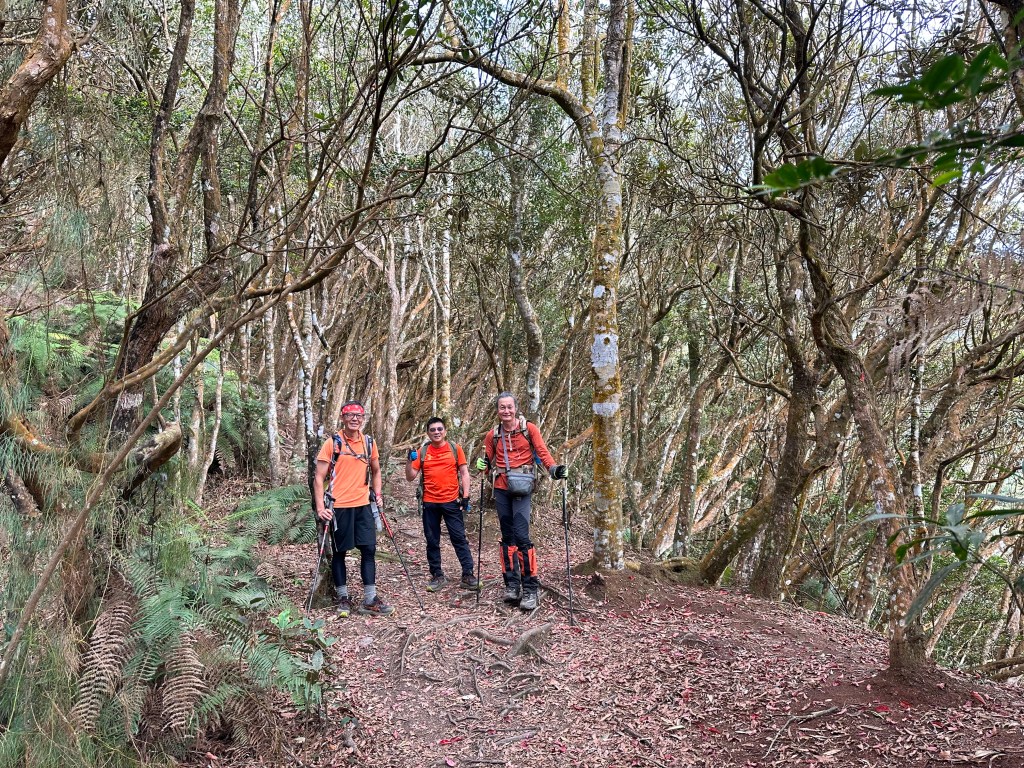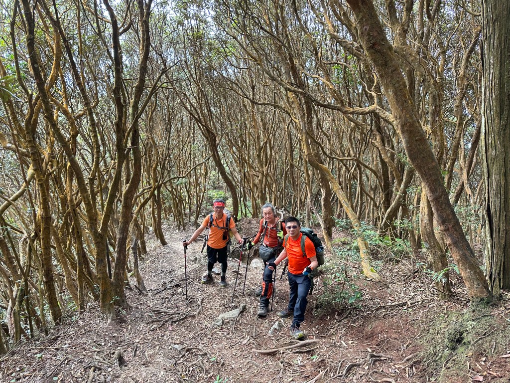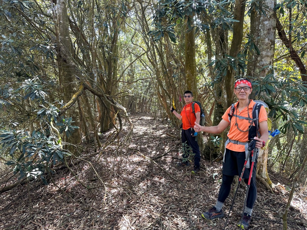 到了H1765m後路徑轉為平緩,整個路徑被杜鵑林所籠罩,很美,尤其是杜鵑林上方有陽光普照!沒有想到,從登山口到這裡,Smile爬升的能力好像恢復了,我們四人都一直覺得納悶,Smile今天走得不算慢啊!