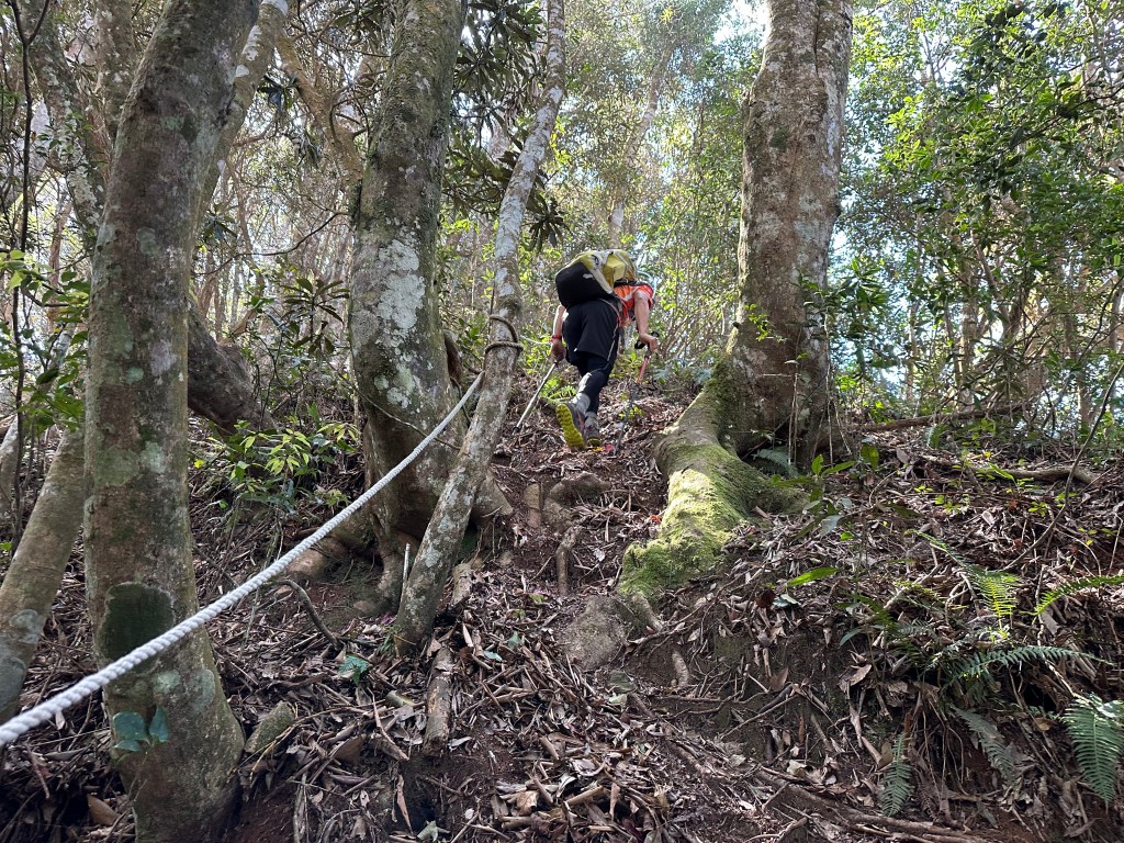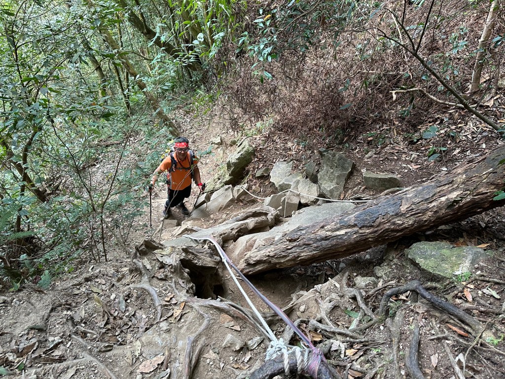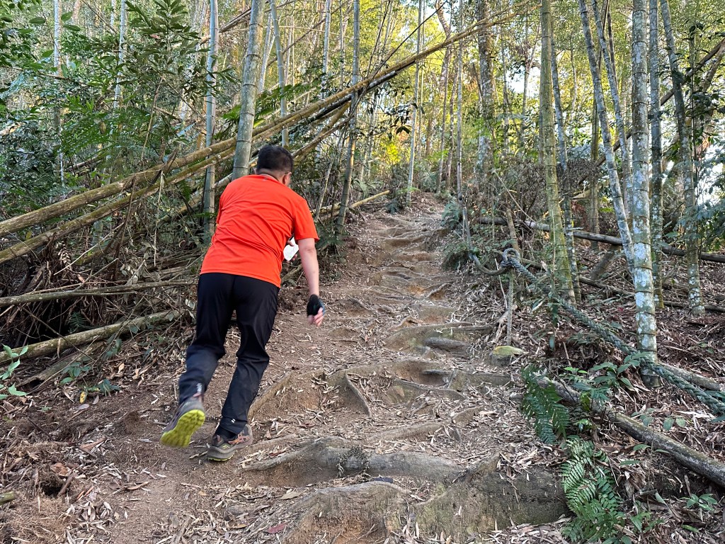 由北稜線登山口一直到水社大山,距離上為4.2K(Gaia GPS標示的是4K),要陡上有1300公尺的高度,平均1K要陡上325公尺,還沒走進入步道前,自己幻想這一段不會像是鵝公髻西南稜那麼難走?還是像內大坪山到大南坑越嶺鞍部路徑的難搞?不過,當一走進步道陡上一段後,內心有種感覺,今天陡歸陡但是應該不是那麼難走。