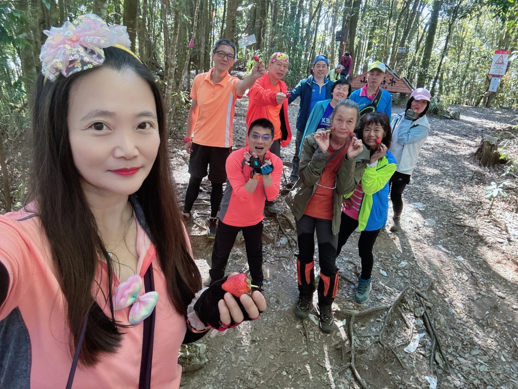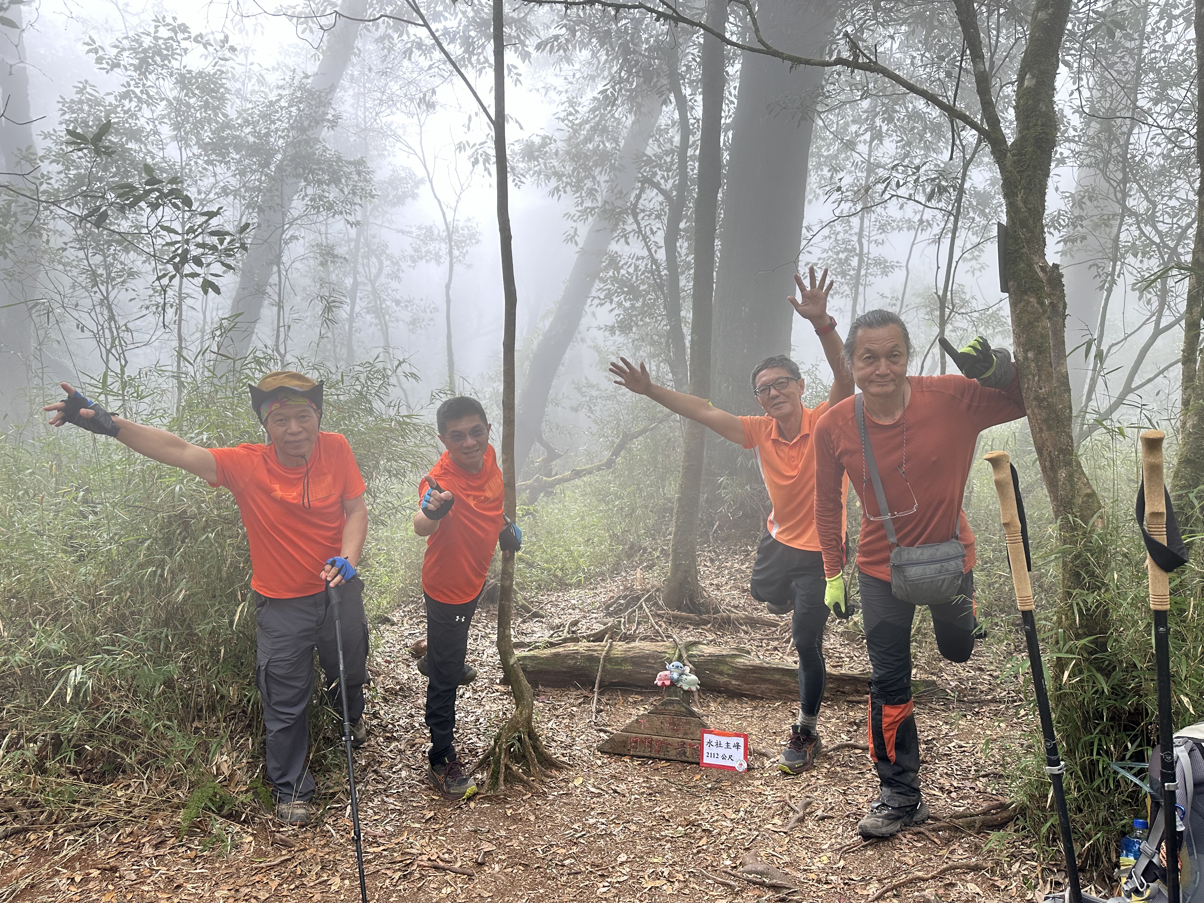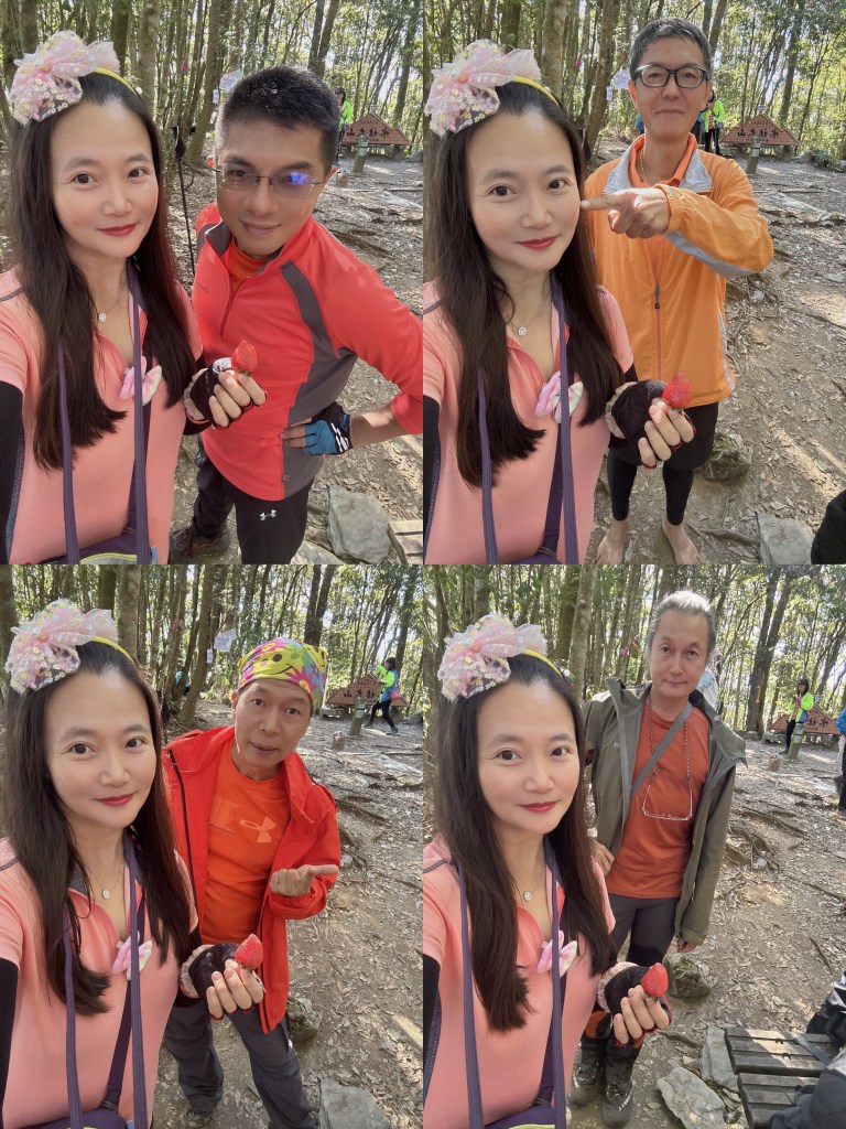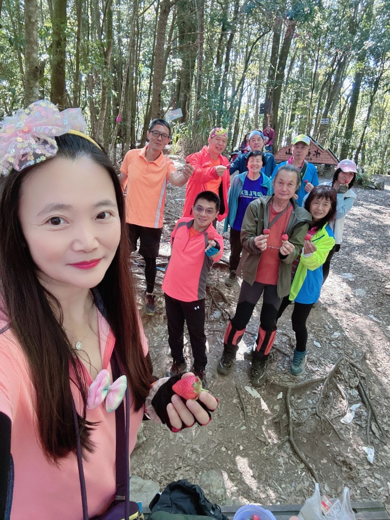 跟阿鴻寒暄也合照一下,接著我們三人就稍微快走去追Link及Peter。由水社大山到水社主峰這一段的距離有0.6K,而水社主峰才是水社的最高峰!一行人在水社主峰這裡拍照後,有帶爐頭的Link、Jun以及Peter三人就快跑回去水社大山,煮起熱水等著給大家泡麵、泡茶還有泡咖啡,Jun還另外帶了朵朵大顆的草莓!哈哈,看來可以糜爛一下囉!