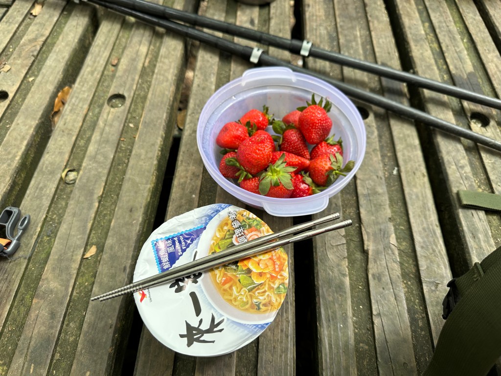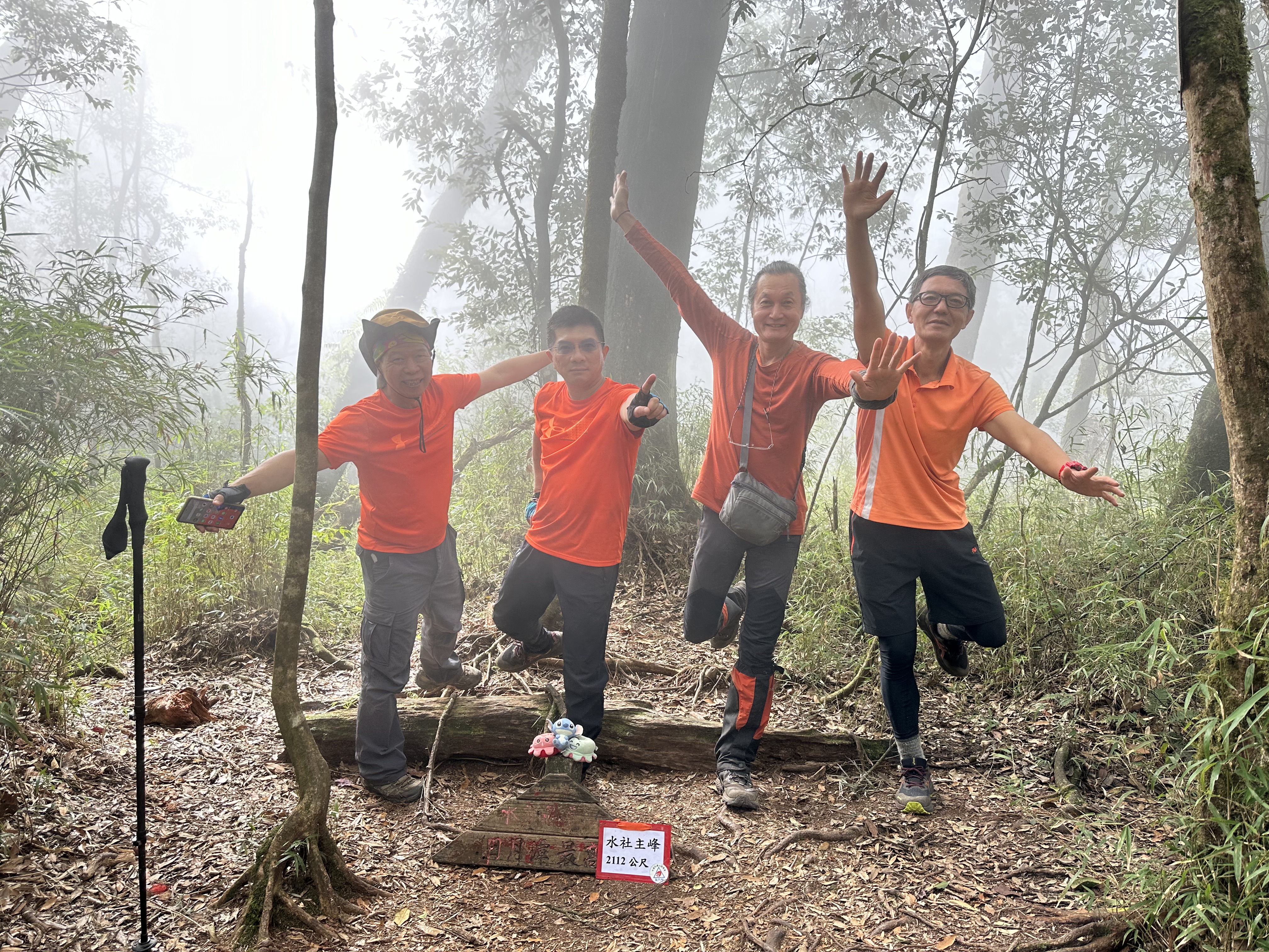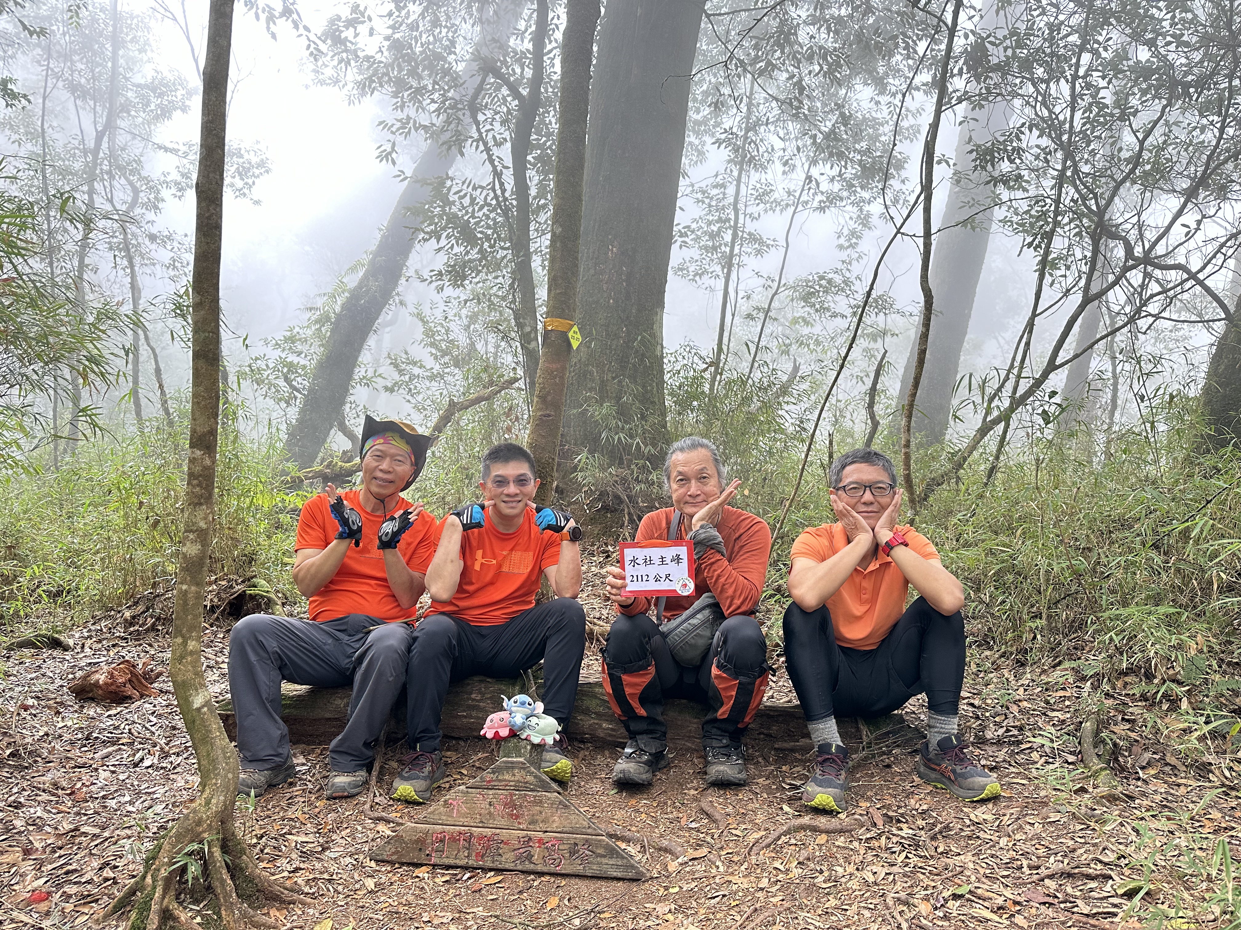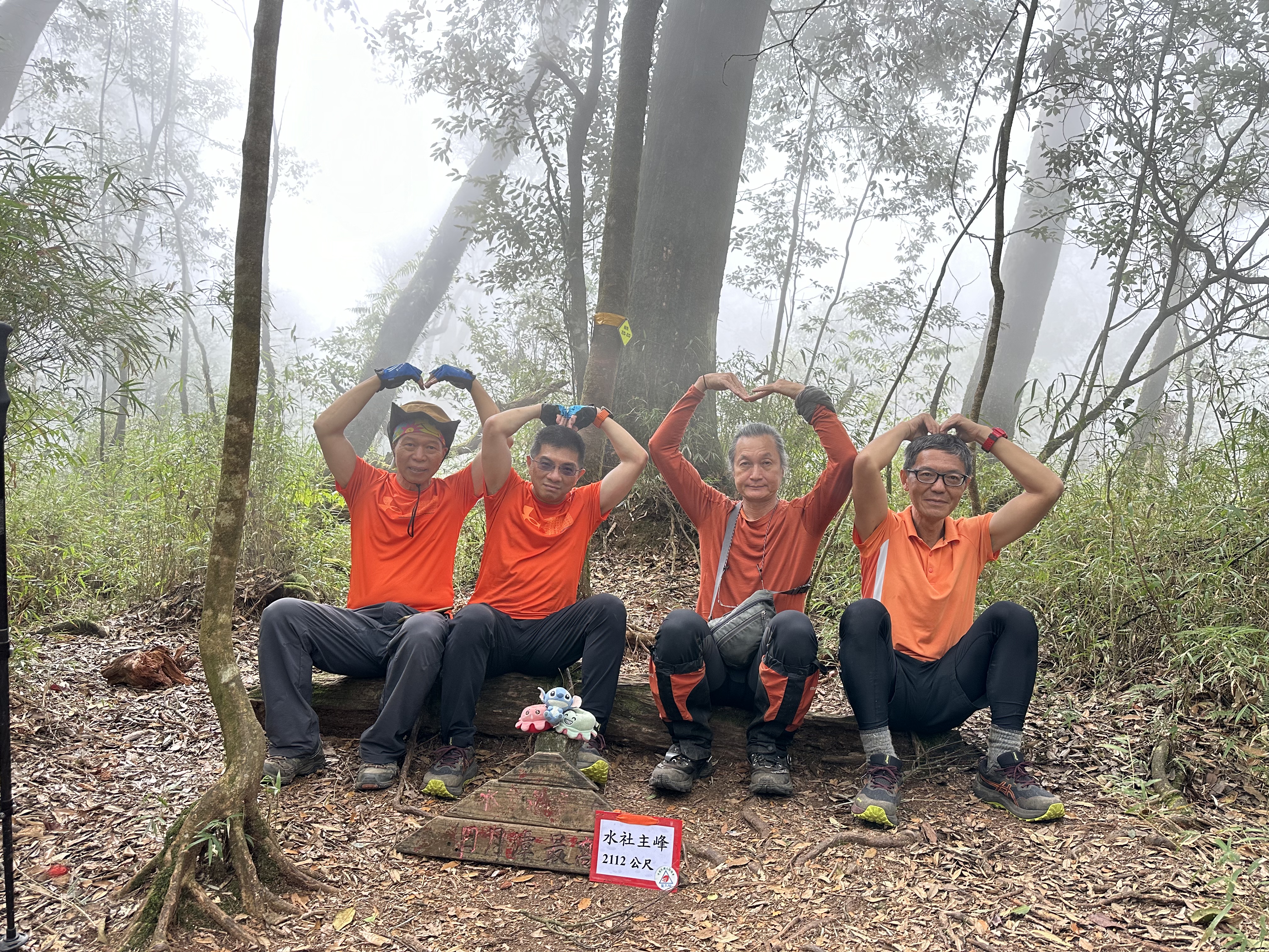 跟阿鴻寒暄也合照一下,接著我們三人就稍微快走去追Link及Peter。由水社大山到水社主峰這一段的距離有0.6K,而水社主峰才是水社的最高峰!一行人在水社主峰這裡拍照後,有帶爐頭的Link、Jun以及Peter三人就快跑回去水社大山,煮起熱水等著給大家泡麵、泡茶還有泡咖啡,Jun還另外帶了朵朵大顆的草莓!哈哈,看來可以糜爛一下囉!