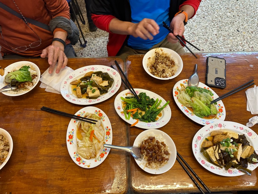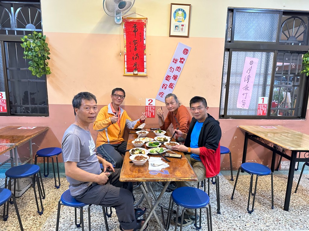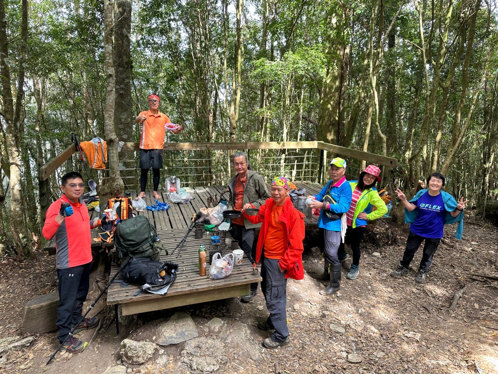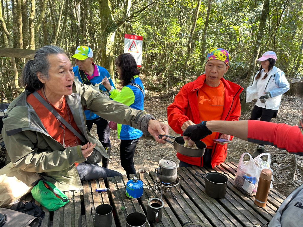 當回到水社大山時,發現三角點這裡非常熱鬧啊!有不少山友都在此正在休息,另有四人的帥哥美女團,我們9人就在此練肖話、一起拍照、一起分享各自帶來的食物,一起吃吃喝喝,有Jun帶來的好茶葉,也有Link大哥帶來的錫蘭紅茶,這時Link大哥還炒了一盤炒飯,給它加入在泡麵裡真是別有一番風味!