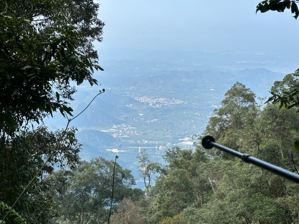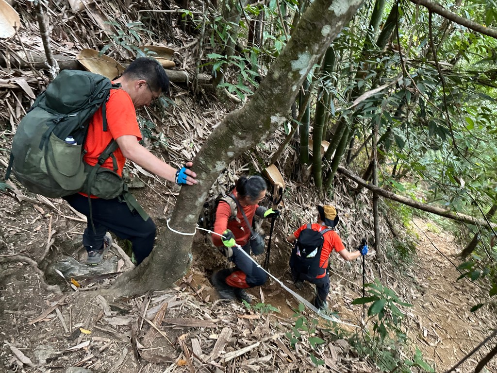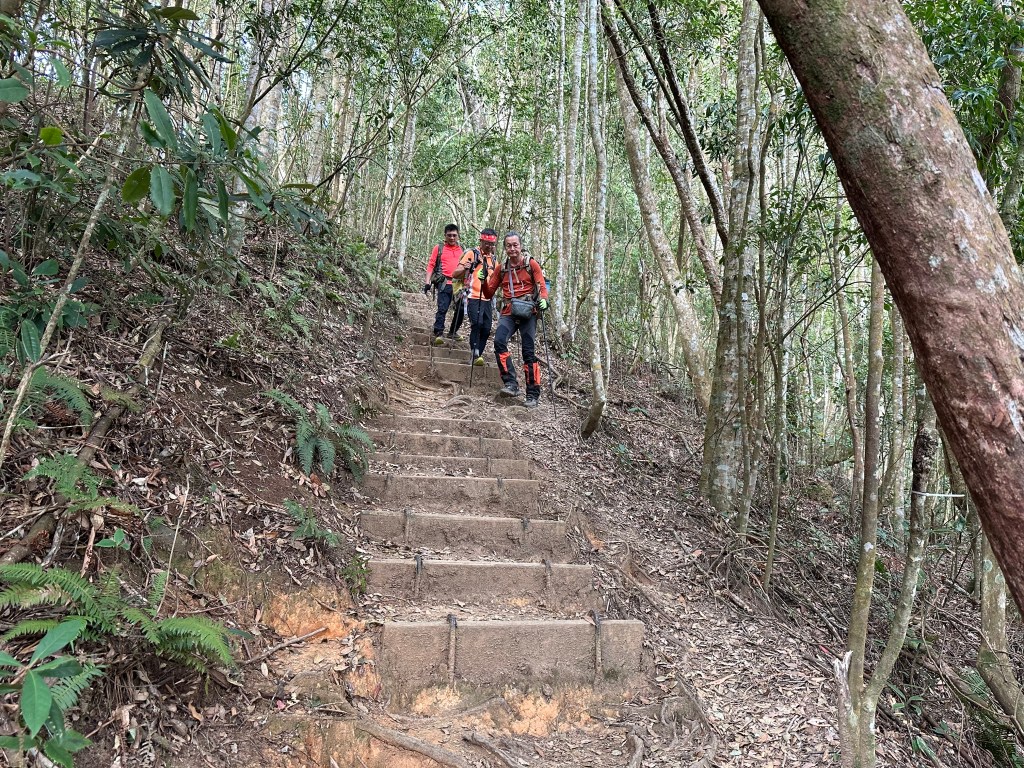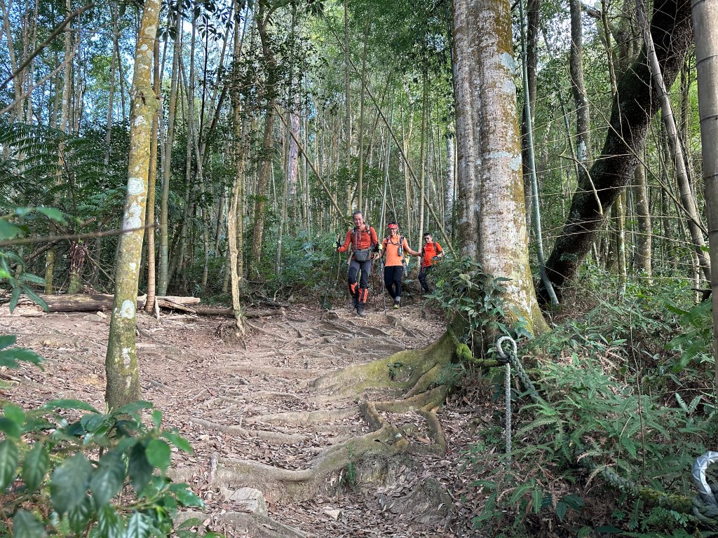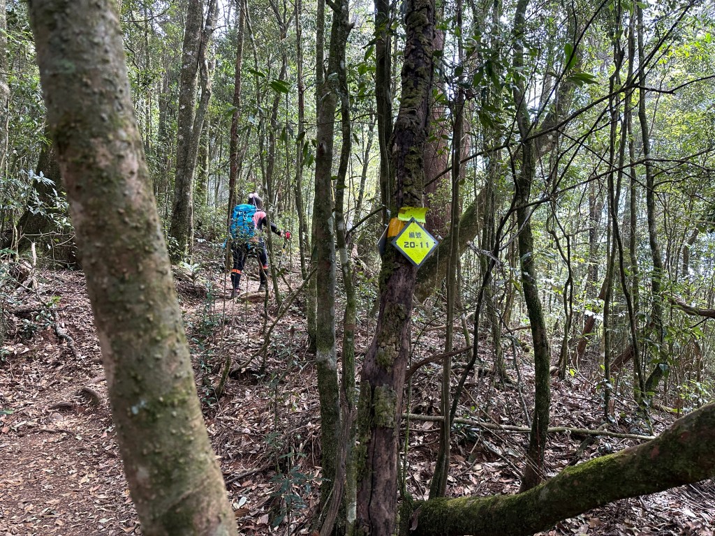 下山,當然要讓隊長Smile帶隊,下山是她的強項,我們幾個一路追她,遇到有展望的點還能給我們男生回拍,1小時23分鐘就陡下到3K里程碑的白石山土地公岔,可是還有兩峰要去攻啊!